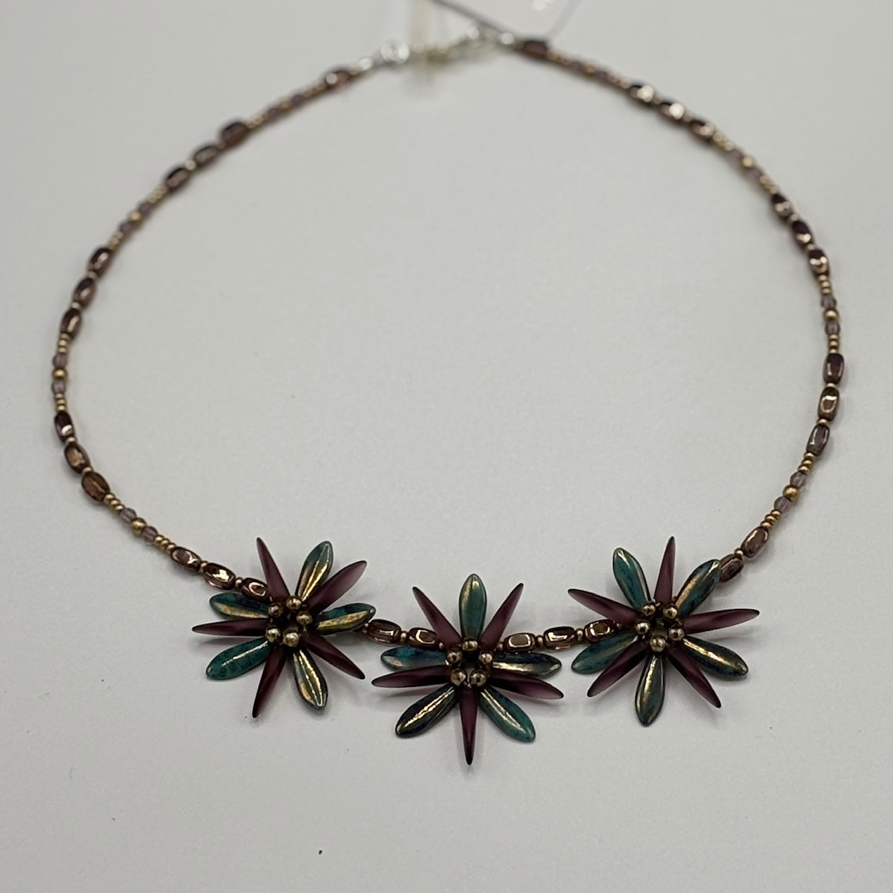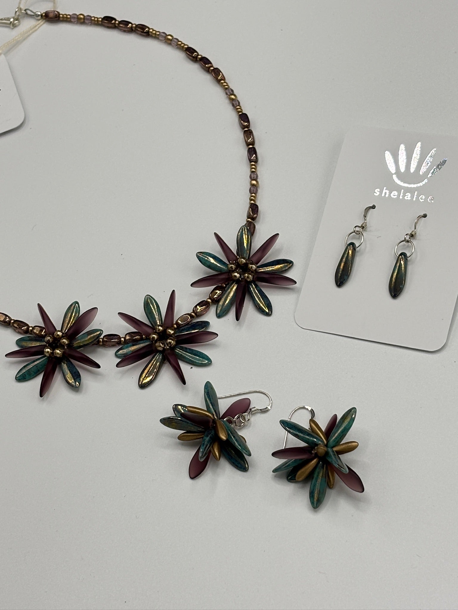 Dress it up with the one-of-the-kind Anna Necklace of Shelalee signature style including handmade beaded flower designs. Featuring Czech glass beads in golden glow purple and green, this is a statement necklace that can take you from the office to an evening out with ease. It is paired nicely with matching Laura or Jane earrings.
