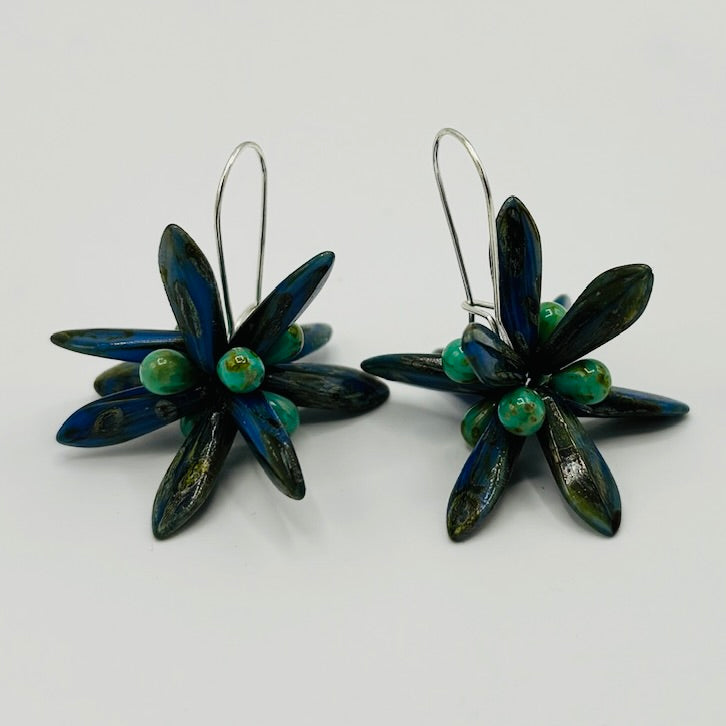 If you are looking for a fun earring that you can wear for any occasion, Eileen Earrings are your best choice. Featuring Czech glass beads and Sterling Silver, the best selling Eileen Earrings are available in many color variations. This pair is earthy blend of blue and green.