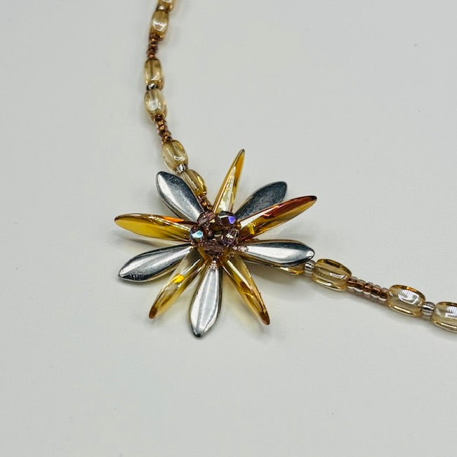 This Elizabeth Necklace is a stunning statement piece that shines wherever you go. Featuring a signature Shelalee beaded flower in silver and cream with a gentle purple center on a delicate beaded strand completed with a Sterling Silver closure, this necklace is perfect for any festive occasion. Length of the necklace pictured is 20 inches.