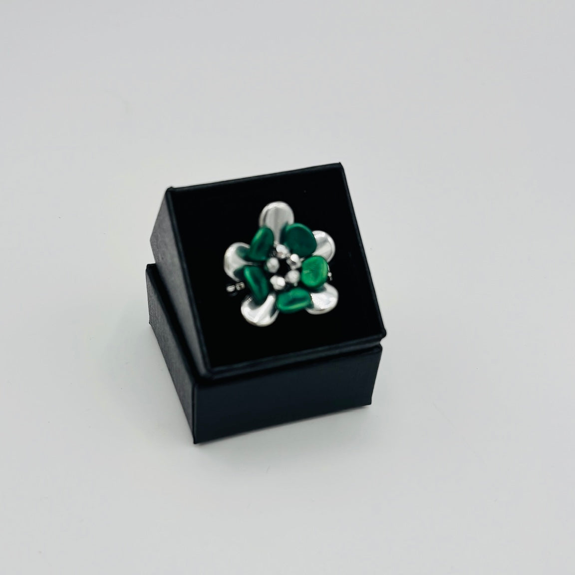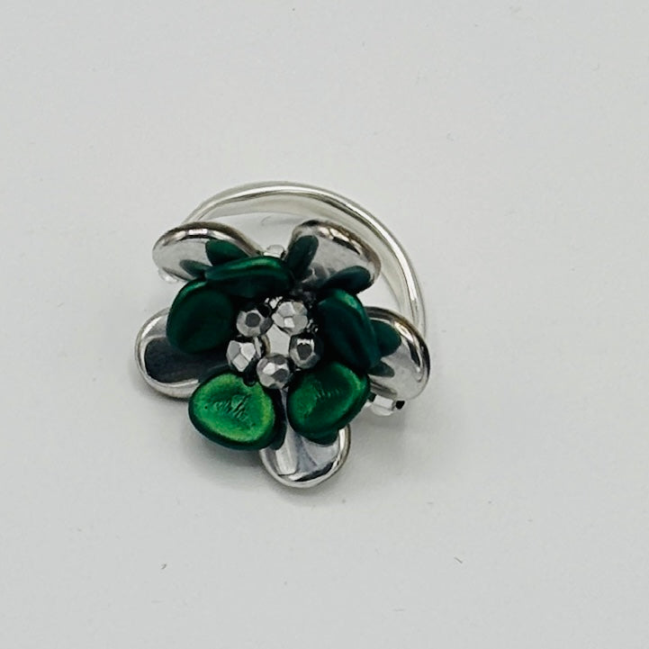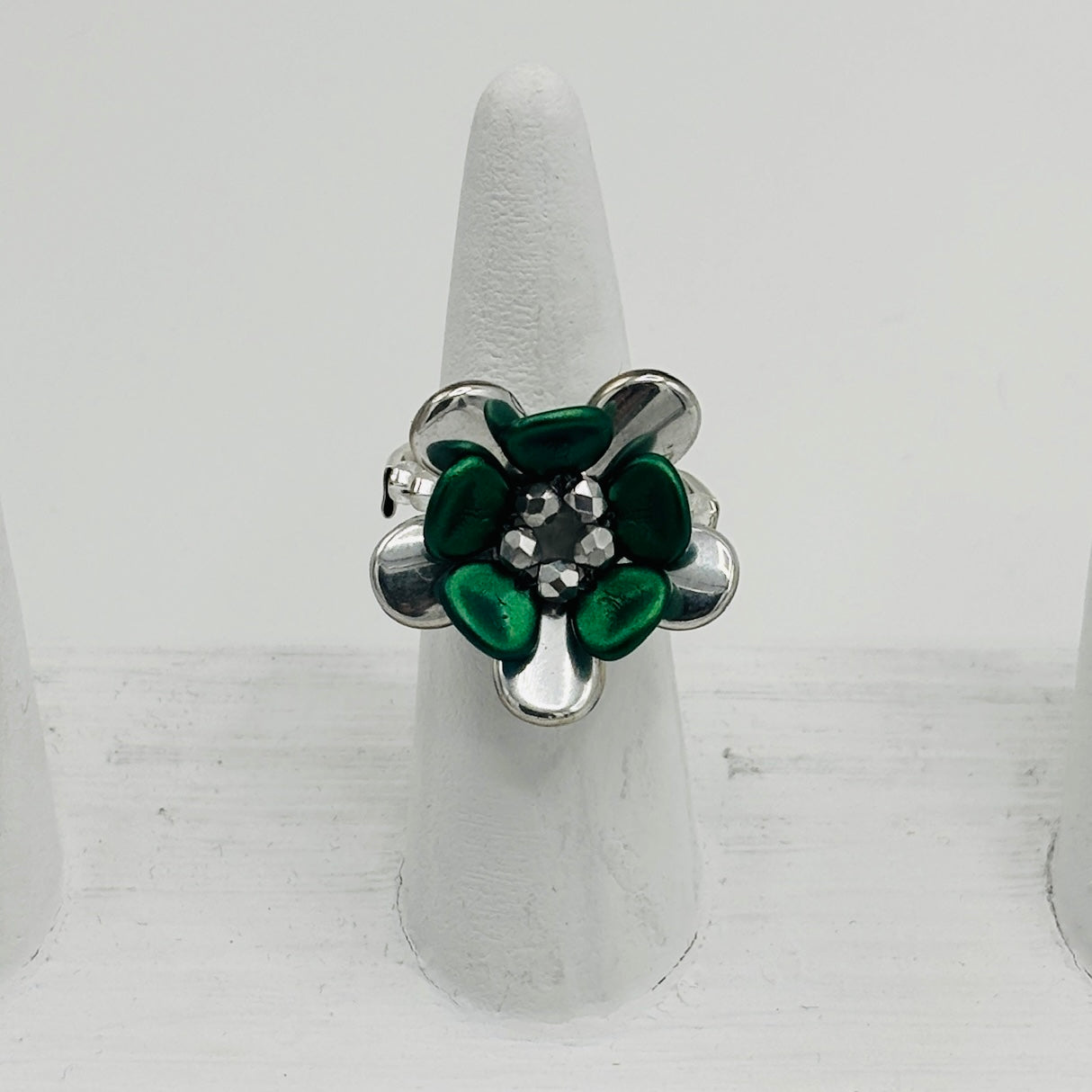 Indulge in sophistication with our exquisite Poppy ring. Crafted with care, Czech glass beads are meticulously chosen and bound with American Sterling Silver components, secured by elastic cord made in the USA.