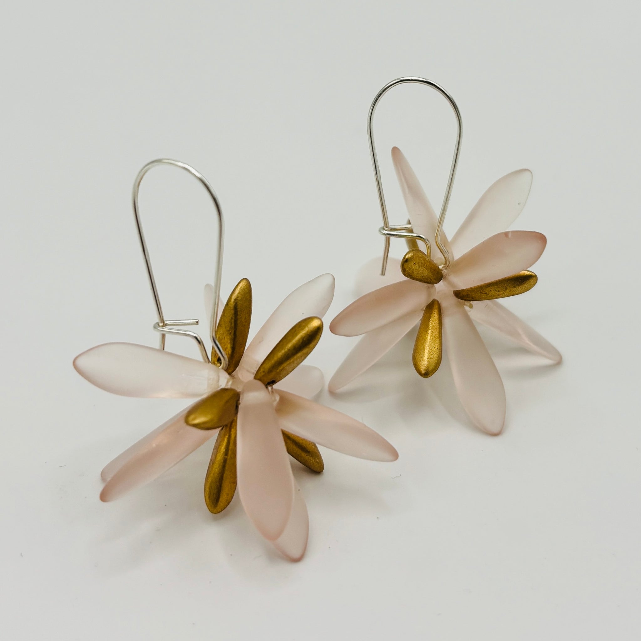 These adorable Eileen earrings showcase beautiful matte pink and smaller golden Czech glass dagger beads and sterling silver earring wires. They add a touch of elegance while bringing a joyful charm to any outfit. Designed to stand out, they are sure to leave a lasting impression wherever you go.