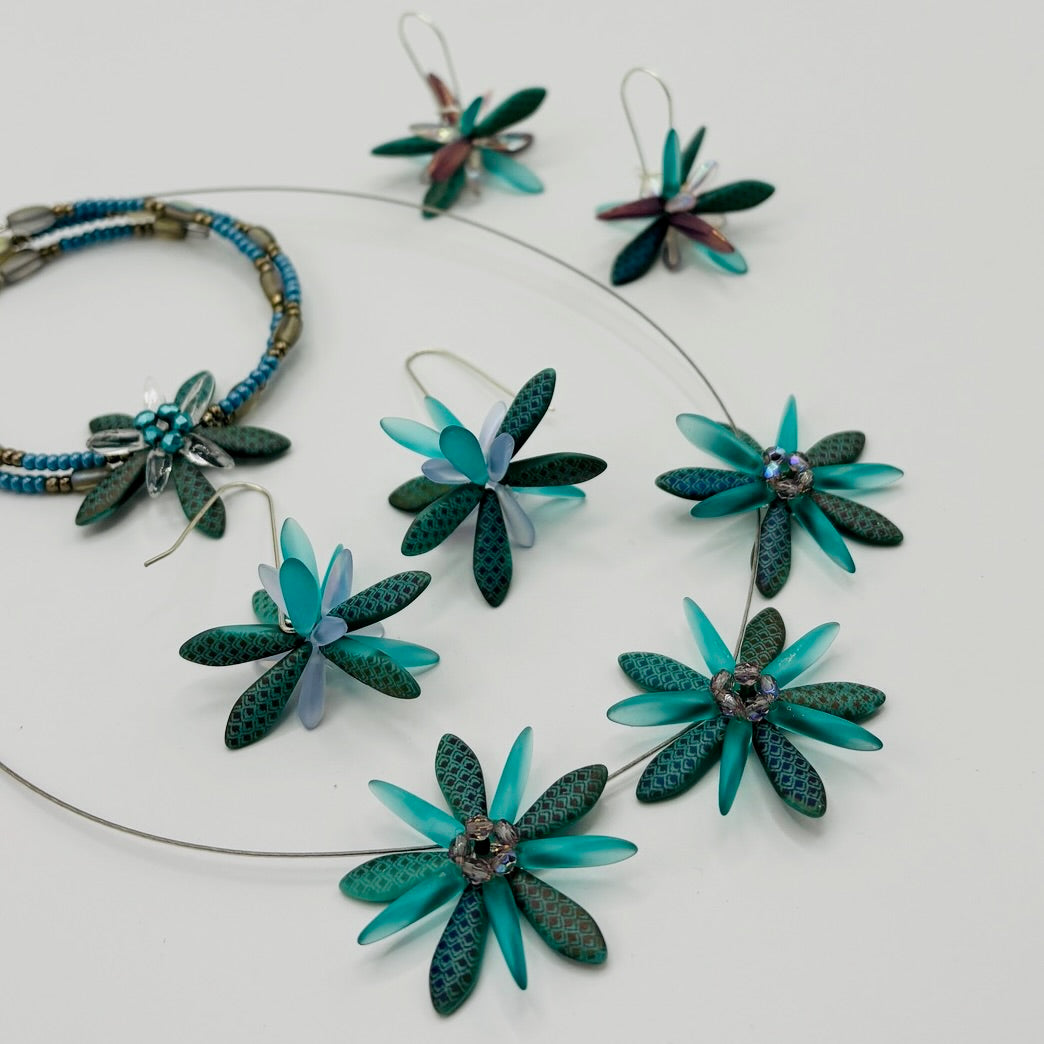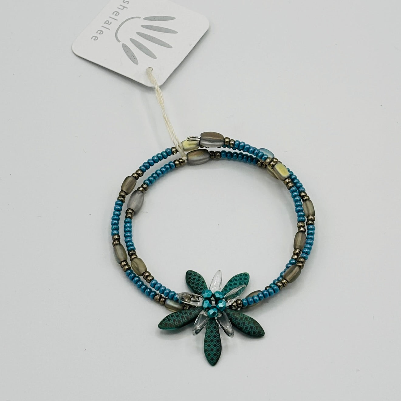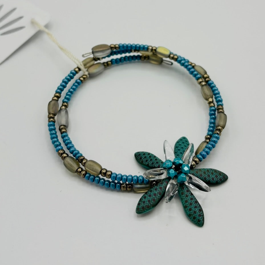 Wishing to have spring any month of the year? Simply slide on our Zoe flower bracelet. Featuring exquisite handmade flower in turquoise with laser etched details, this piece blends elegance with just the right touch of drama. The flower sits neatly on a beaded memory wire. The bracelet is made to hug your wrist with a joyful twist.