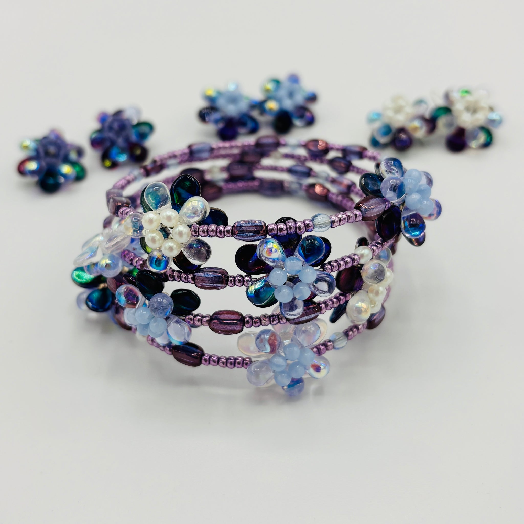 Hello Dahlia Maxi Bracelet! This stunning piece features eight beautiful dahlia flowers—showcasing a mix of darker multicolor and light blue petals with milky blue, pearl, and purple flower centers—dancing along over four loops of beaded memory wire. Lightweight, flexible, and designed to dazzle, it’s sure to become a cherished part of your accessory collection.