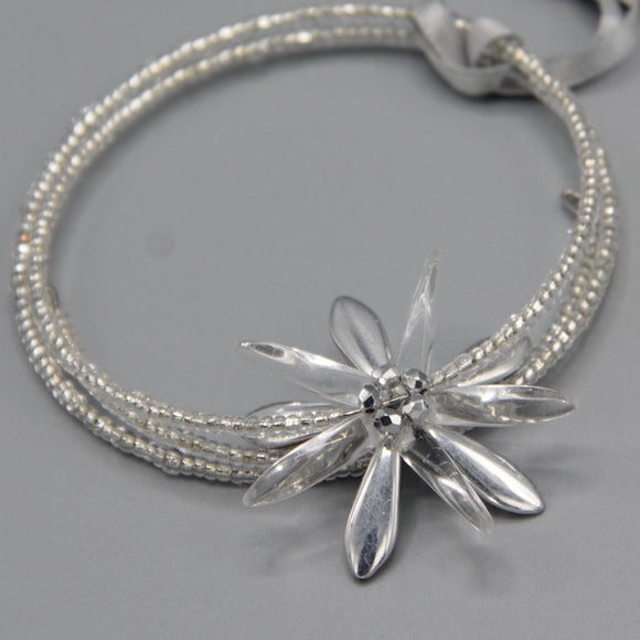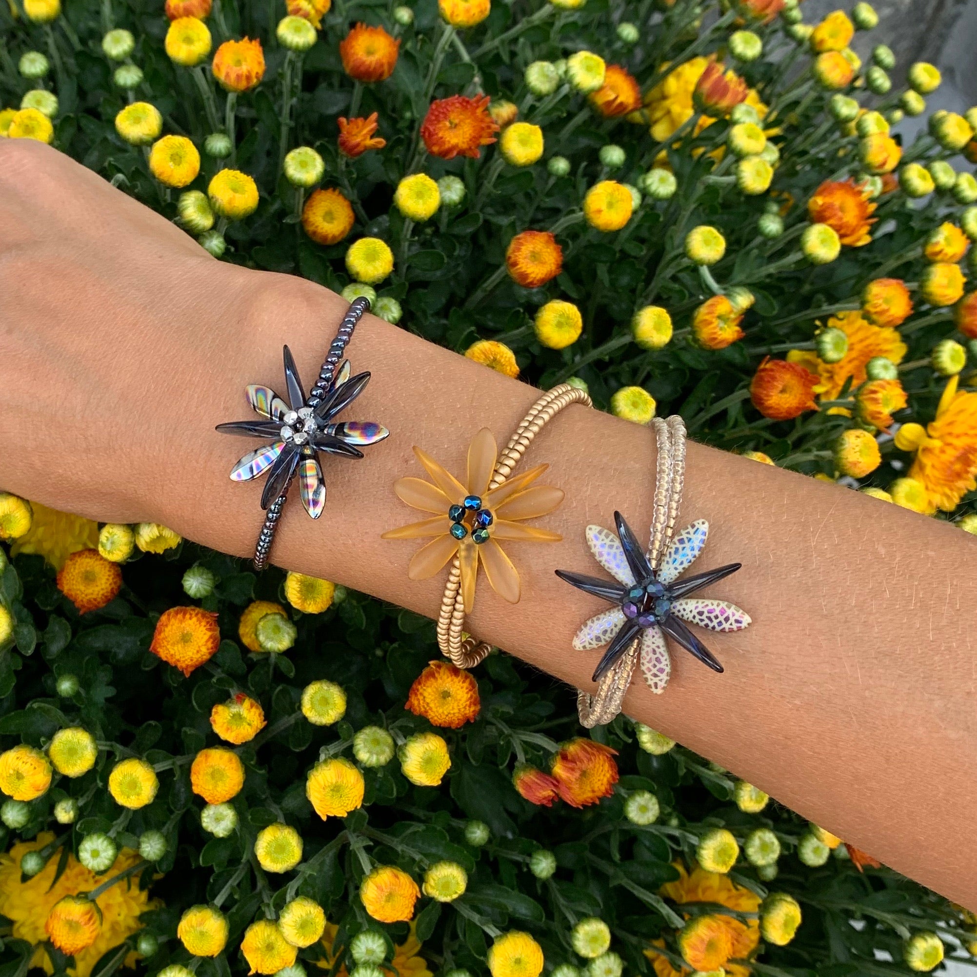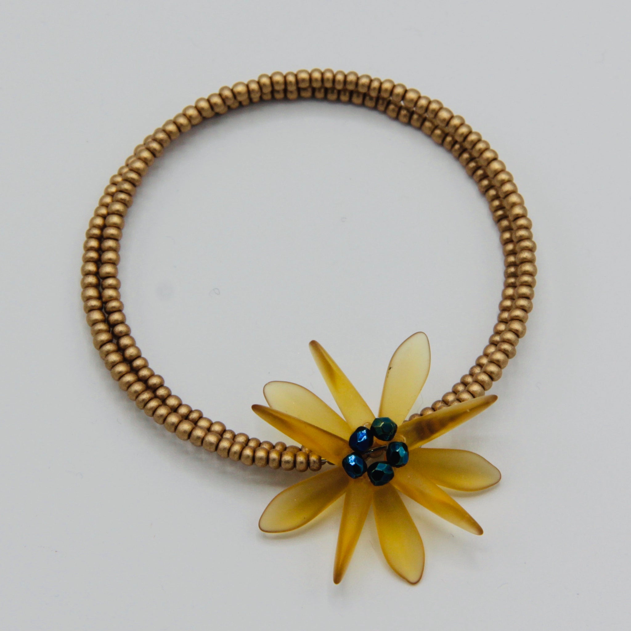 Wishing to have flowers any month of the year? Simply slide on our Zoe flower bracelet. The flower sits neatly on a beaded memory wire. The bracelet is made to hug your wrist with a joyful twist.