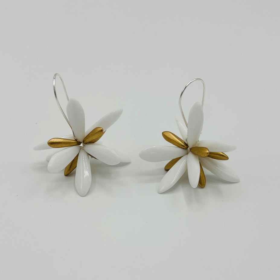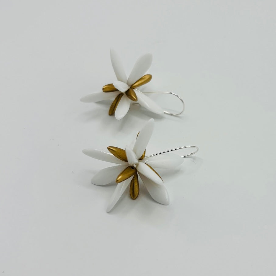 Look your best in these Eileen earrings in white with matte gold accent beads. These Eileen earrings are the perfect complement to any outfit from formal business to blue jeans.