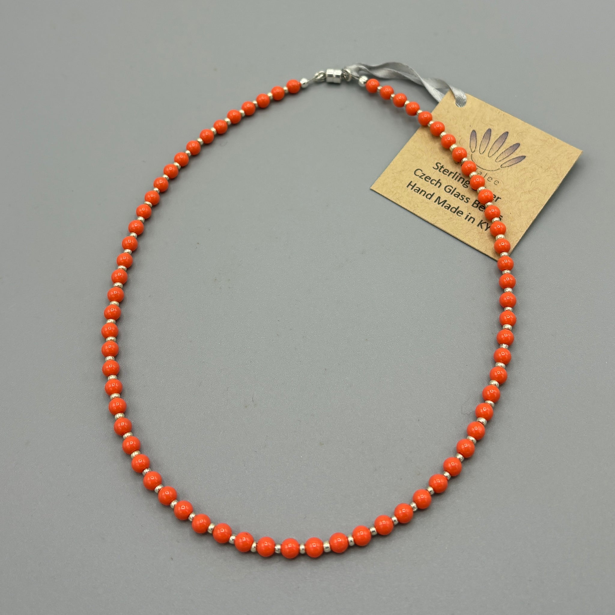 Experience the understated sophistication of the Kylie necklace. Crafted with Czech glass beads, a Sterling Silver magnetic closure, and a harmonious arrangement of small silver seed beads and larger papaya orange beads. Elevate your style with the Kylie necklace, which effortlessly enhances the charm of any outfit. Don't forget to explore our matching earrings, available separately, for a complete and captivating look.