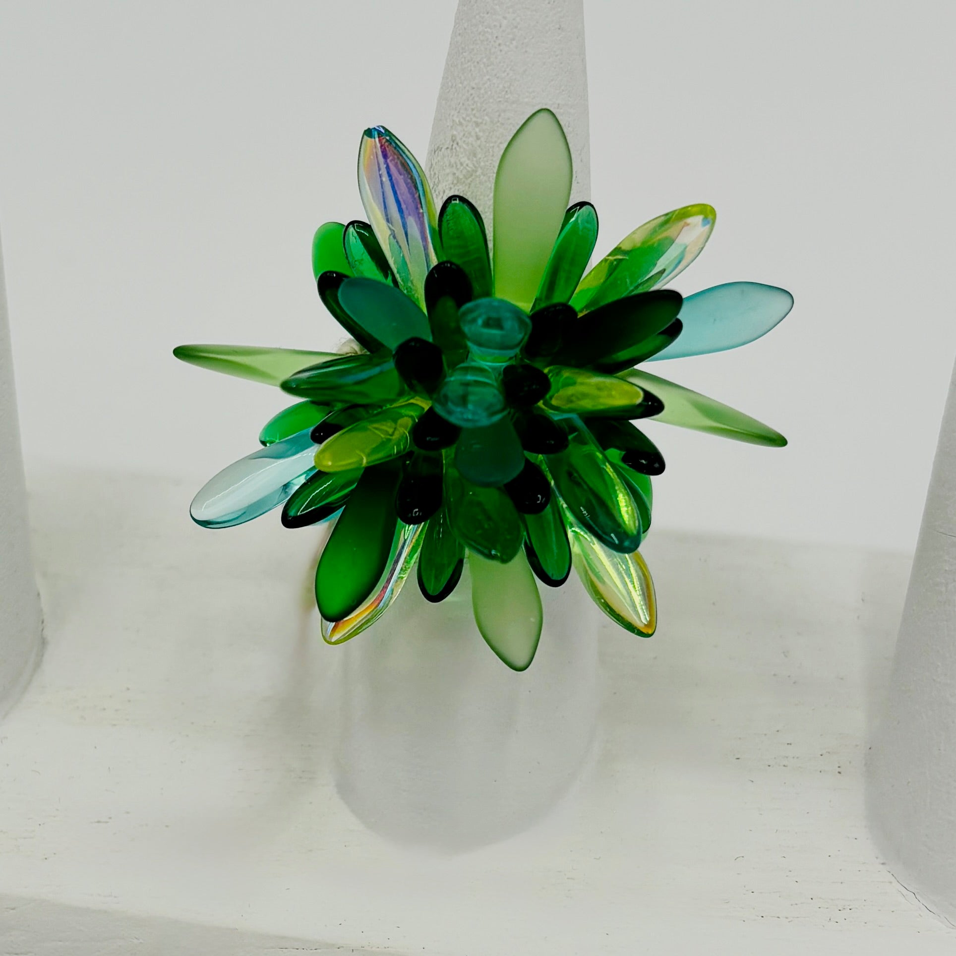 Meet Wendy ring. This ring combines textured lime green and pearly white Czech glass dagger beads. The beads are meticulously selected and hugged together with American Sterling Silver components using an elastic cord made in the USA.