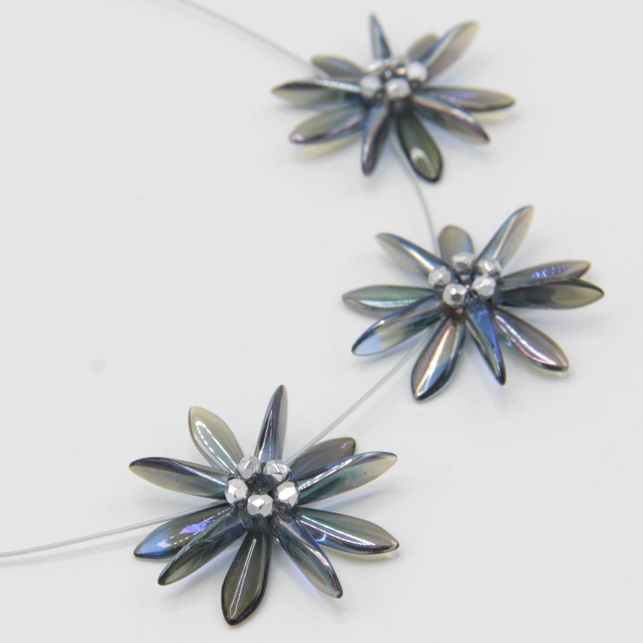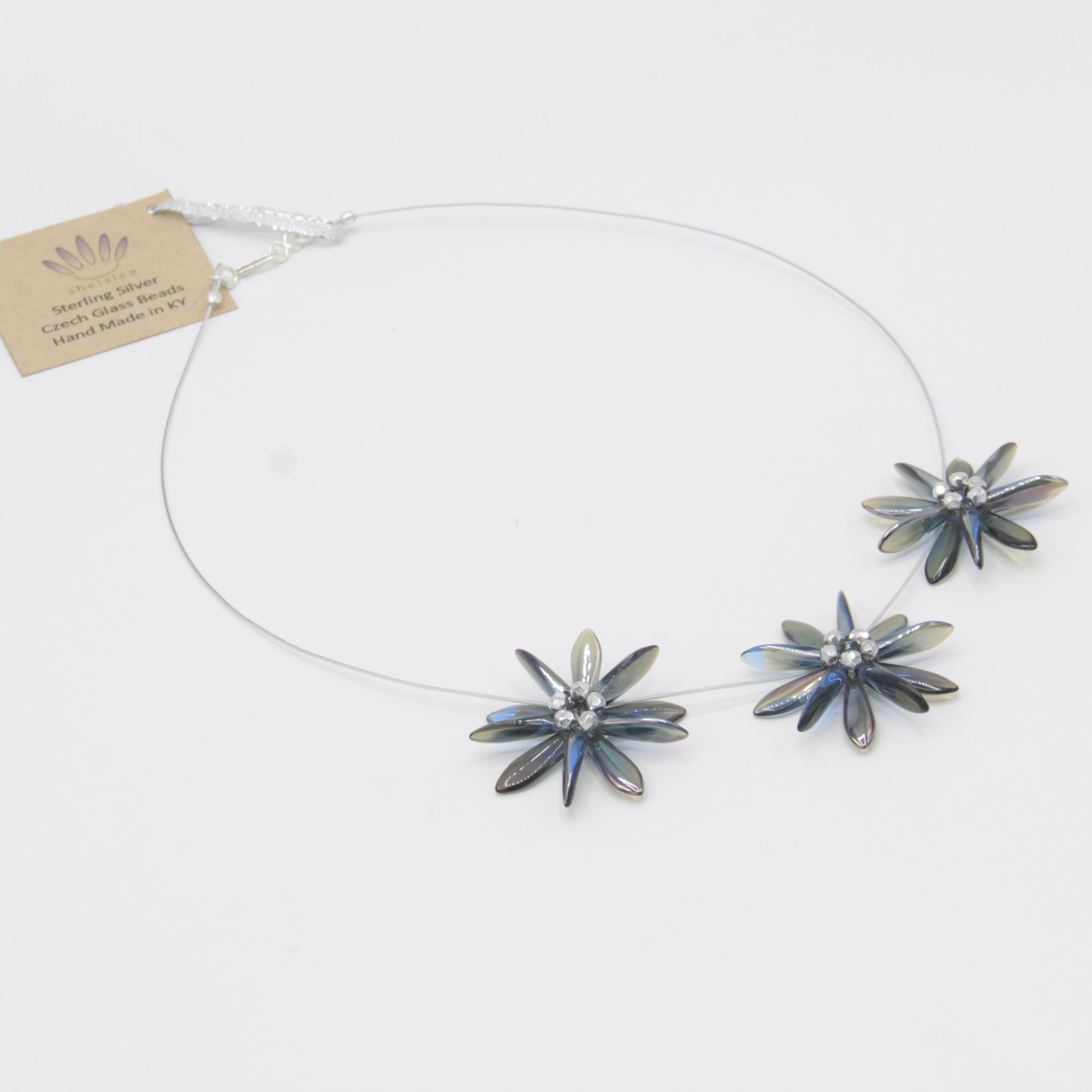 Dress it up with Anna Necklace of Shelalee signature style including handmade beaded flower designs. Featuring Czech glass beads in smoky blue and silver center, this is a statement necklace that can take you from the office to an evening out with ease.