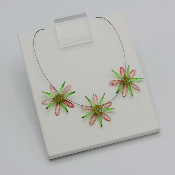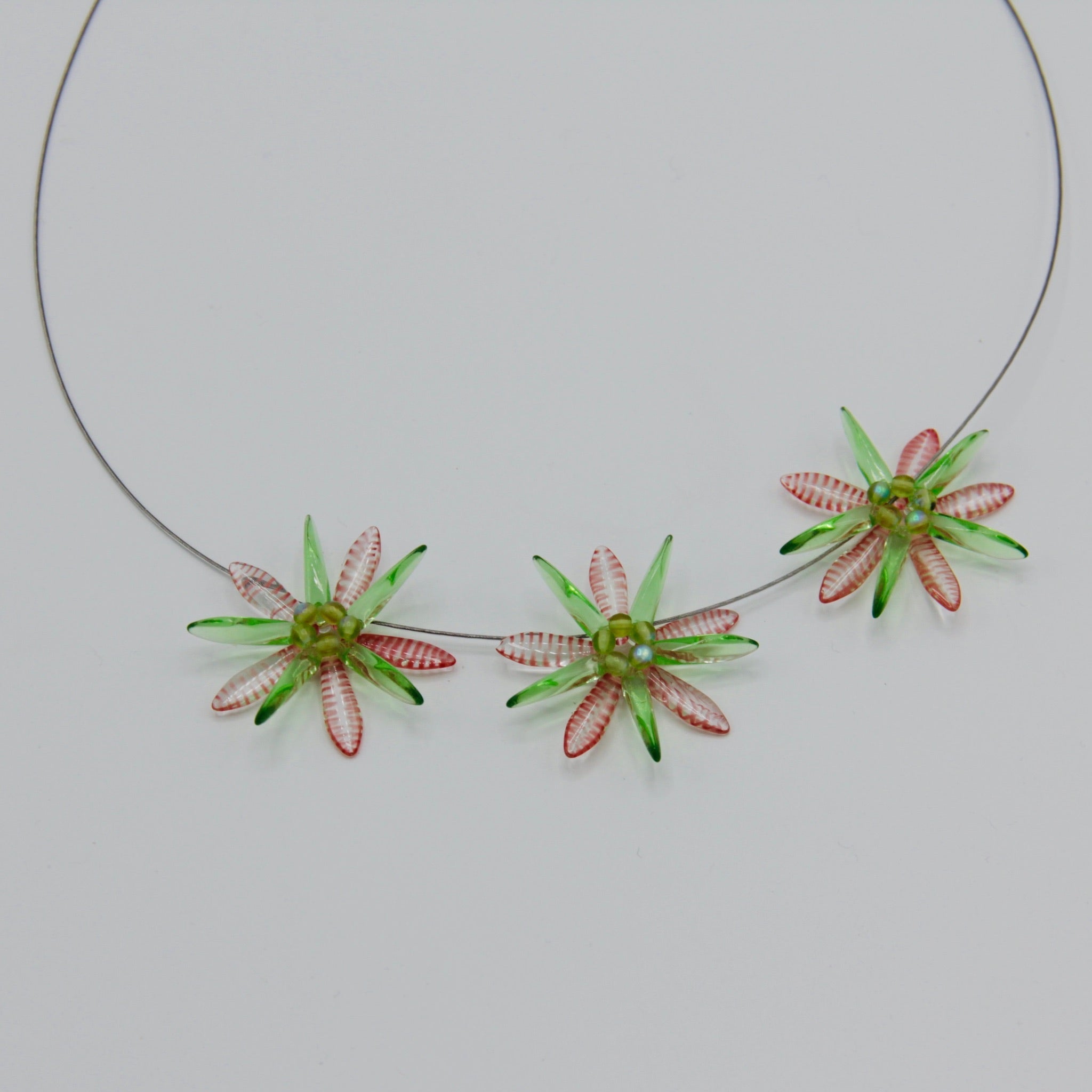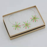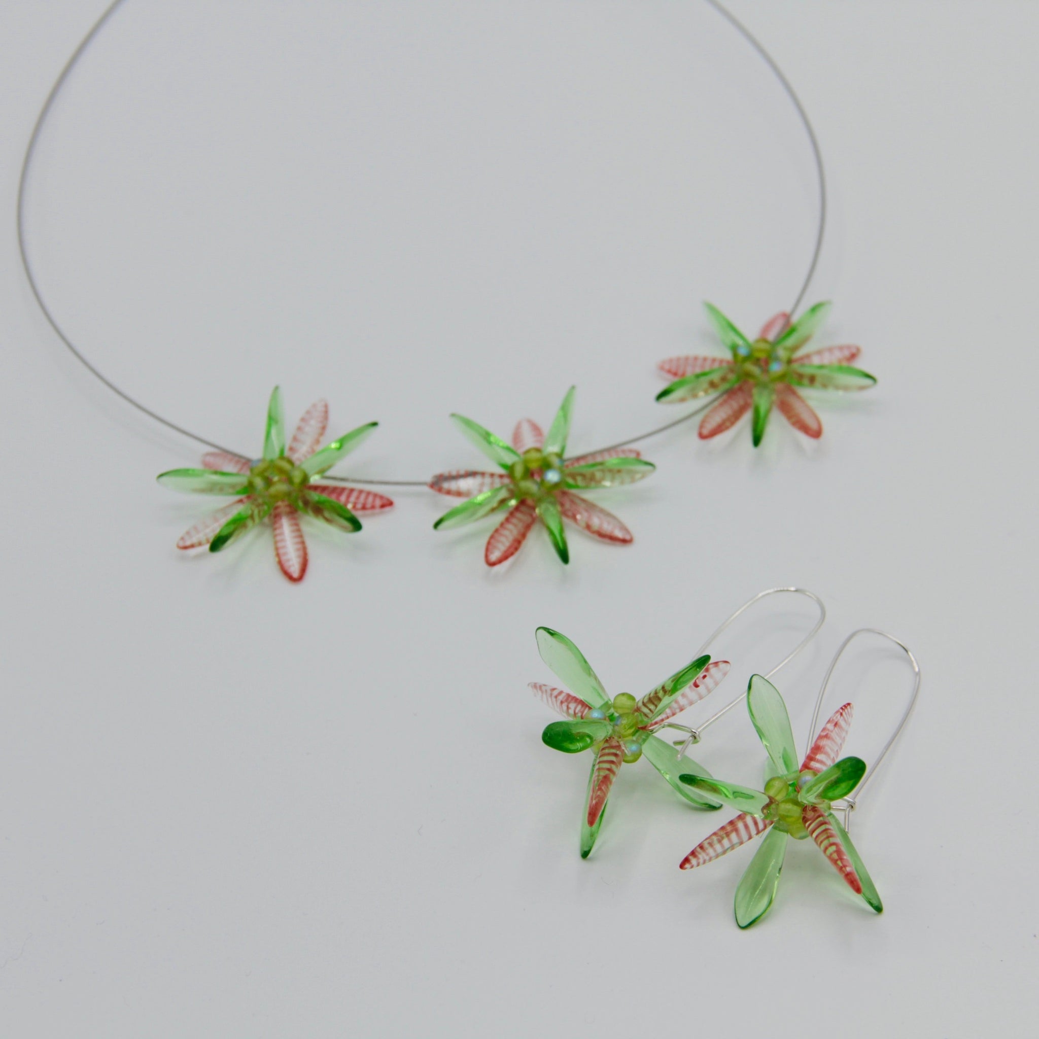 Dress it up with Anna Necklace of Shelalee signature style including handmade beaded flower designs. Featuring Czech glass beads in spring green beads and reddish stripes, this is a statement necklace that can take you from the office to an evening out with ease.  It is paired nicely with matching Eileen earrings as featured in the picture of the whole set.