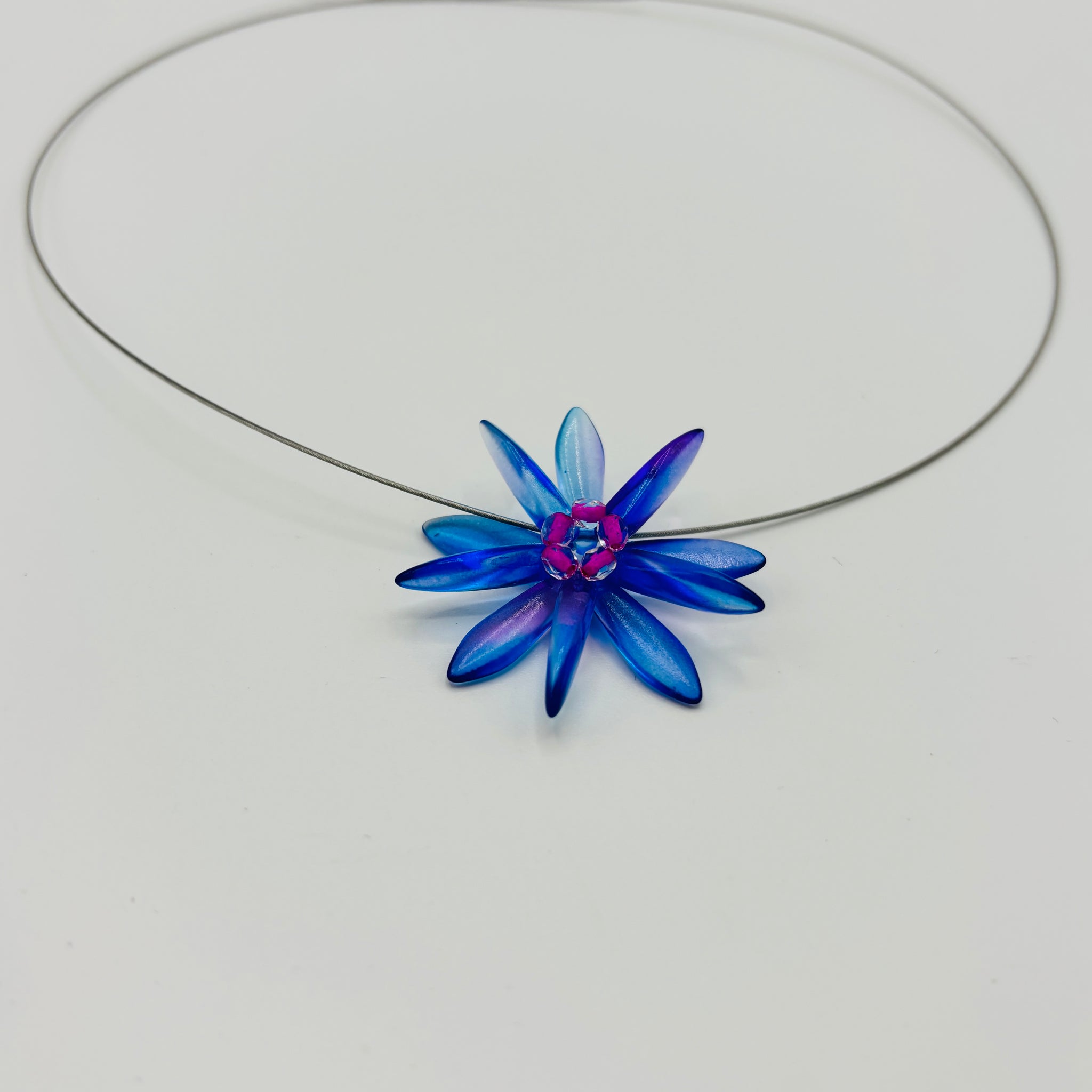 This Elizabeth Necklace is a stunning statement piece that shines wherever you go. Featuring a signature Shelalee beaded flower in royal blue and bright magenta center completed with a Sterling Silver closure, this necklace is perfect for casual as well as festive occasion. Length of the necklace is 17 inches but can be custom sized to you preferences.