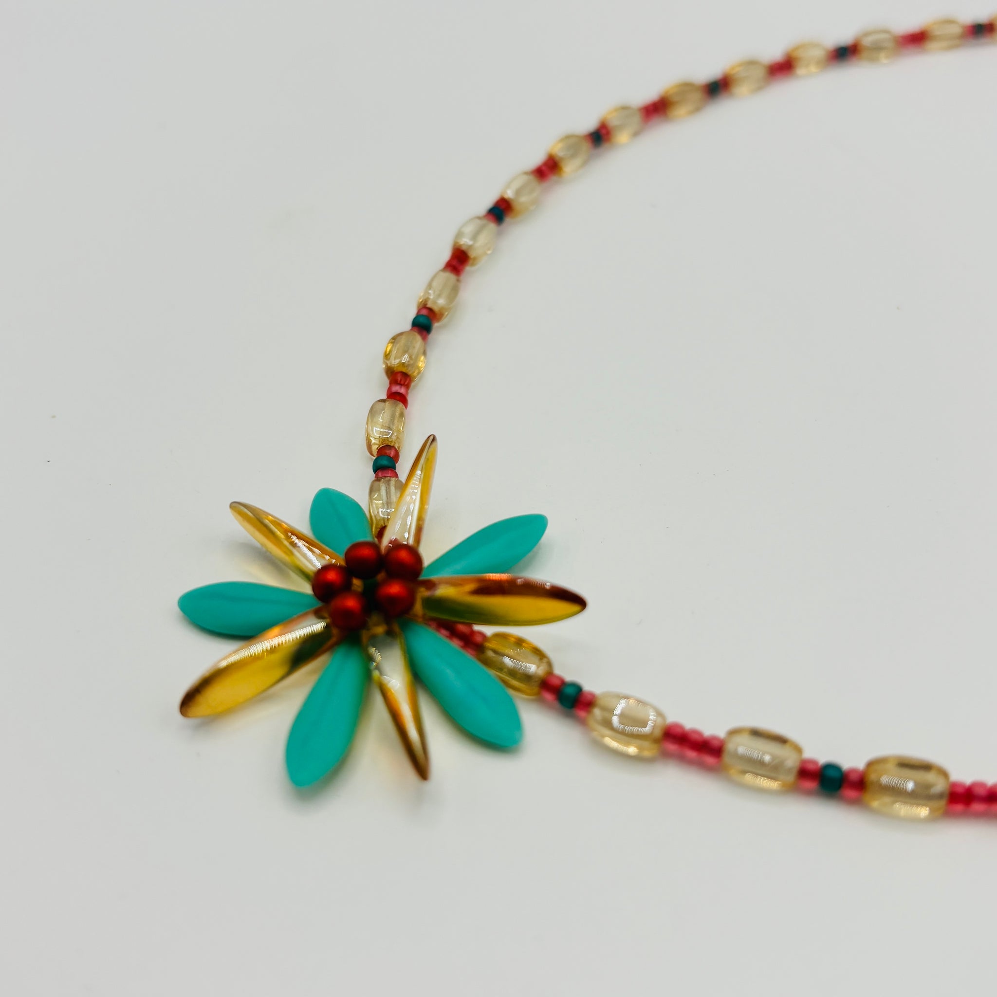 Elevate your style with the Elizabeth beaded necklace, a truly distinctive piece that adds a touch of elegance to any ensemble. This captivating accessory showcases an unexpected eye-catching combination of crimson brown, beige and fresh turquoise Czech glass beads, thoughtfully arranged in an intricate flower design. The final result is a one-of-a-kind, eye-catching statement necklace that effortlessly captures attention.