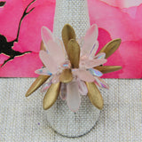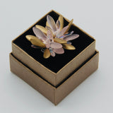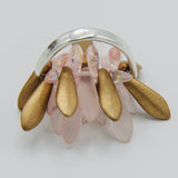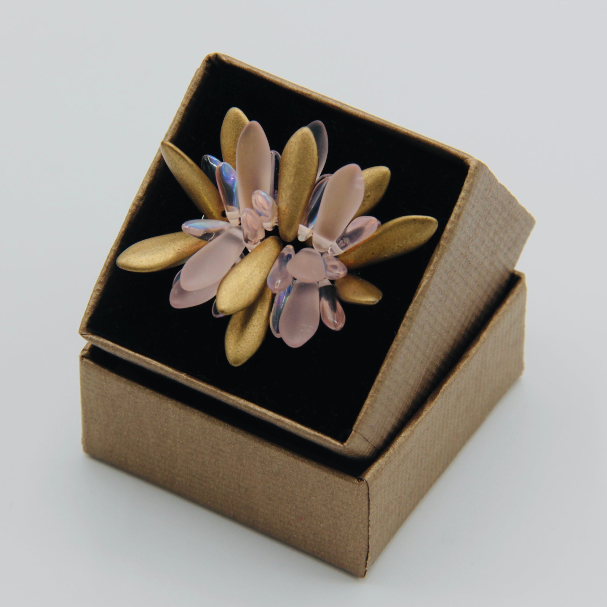 Meet Wendy ring. This ring combines light pink and gold-colored Czech glass beads. Wendy rings in general can be sophisticated, earthy or extravagant, we just love them all. Czech glass dagger beads are meticulously selected and hugged together with American Sterling Silver components using an elastic cord made in the USA. All of that is nested in a lovable box made of 100% recycled cardboard here in the USA.