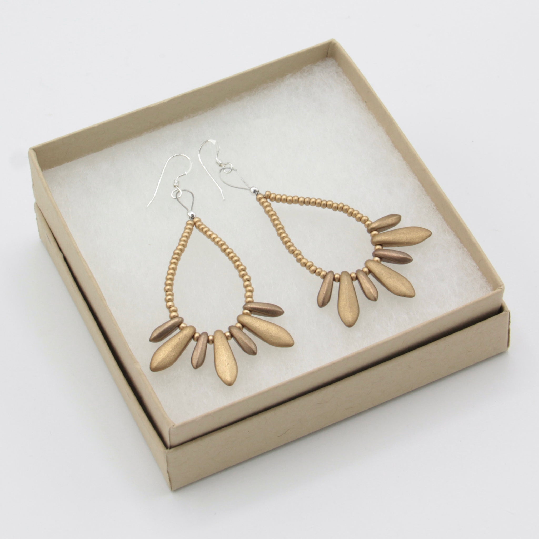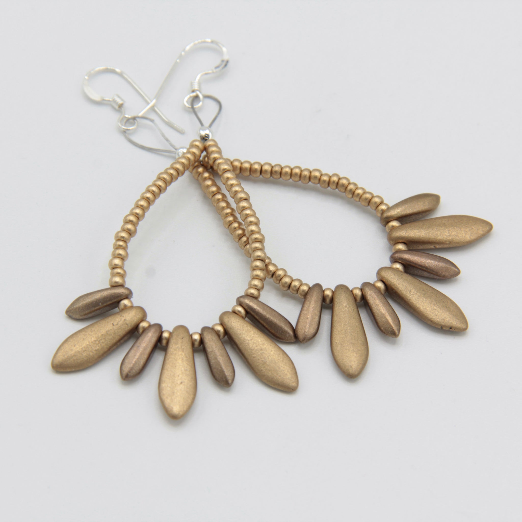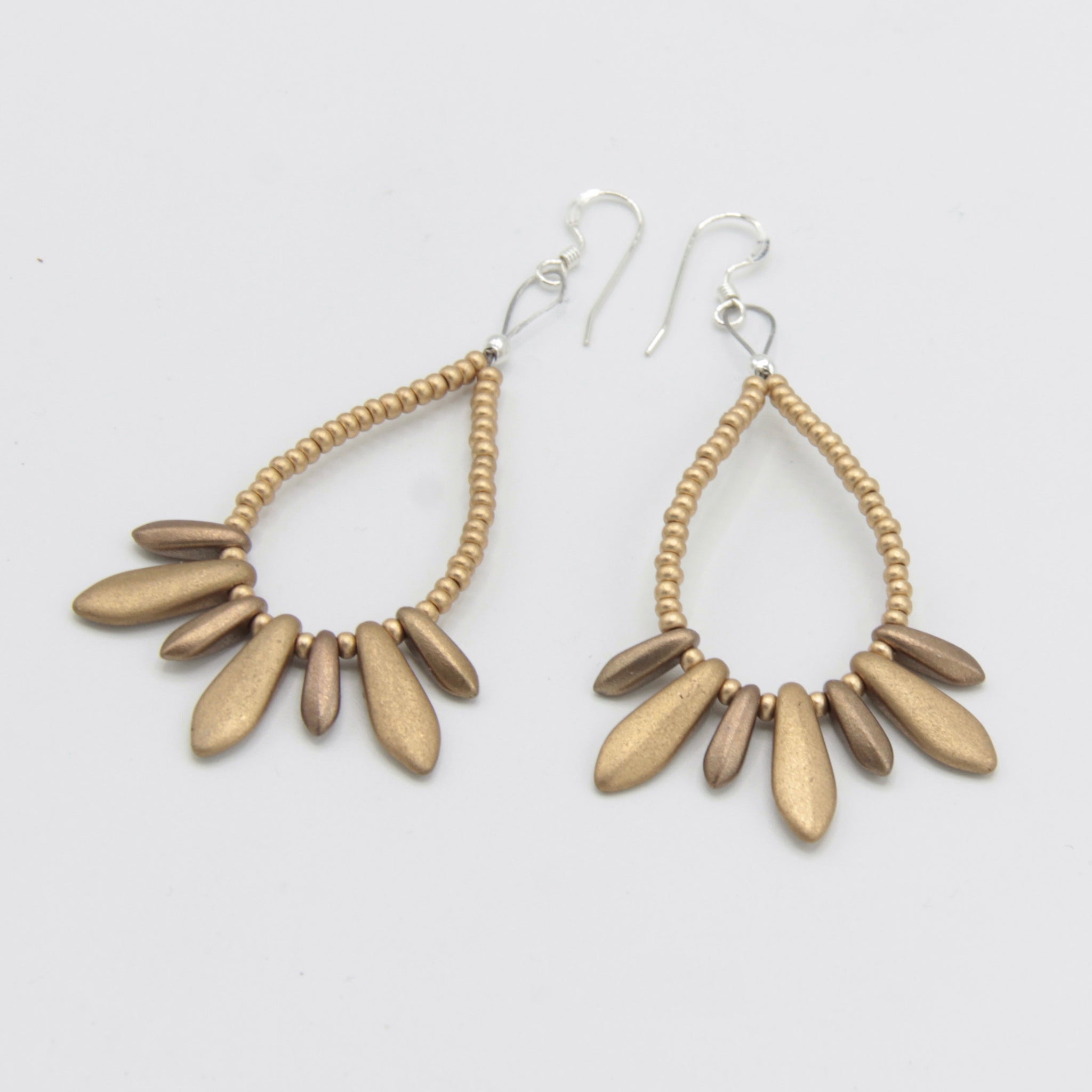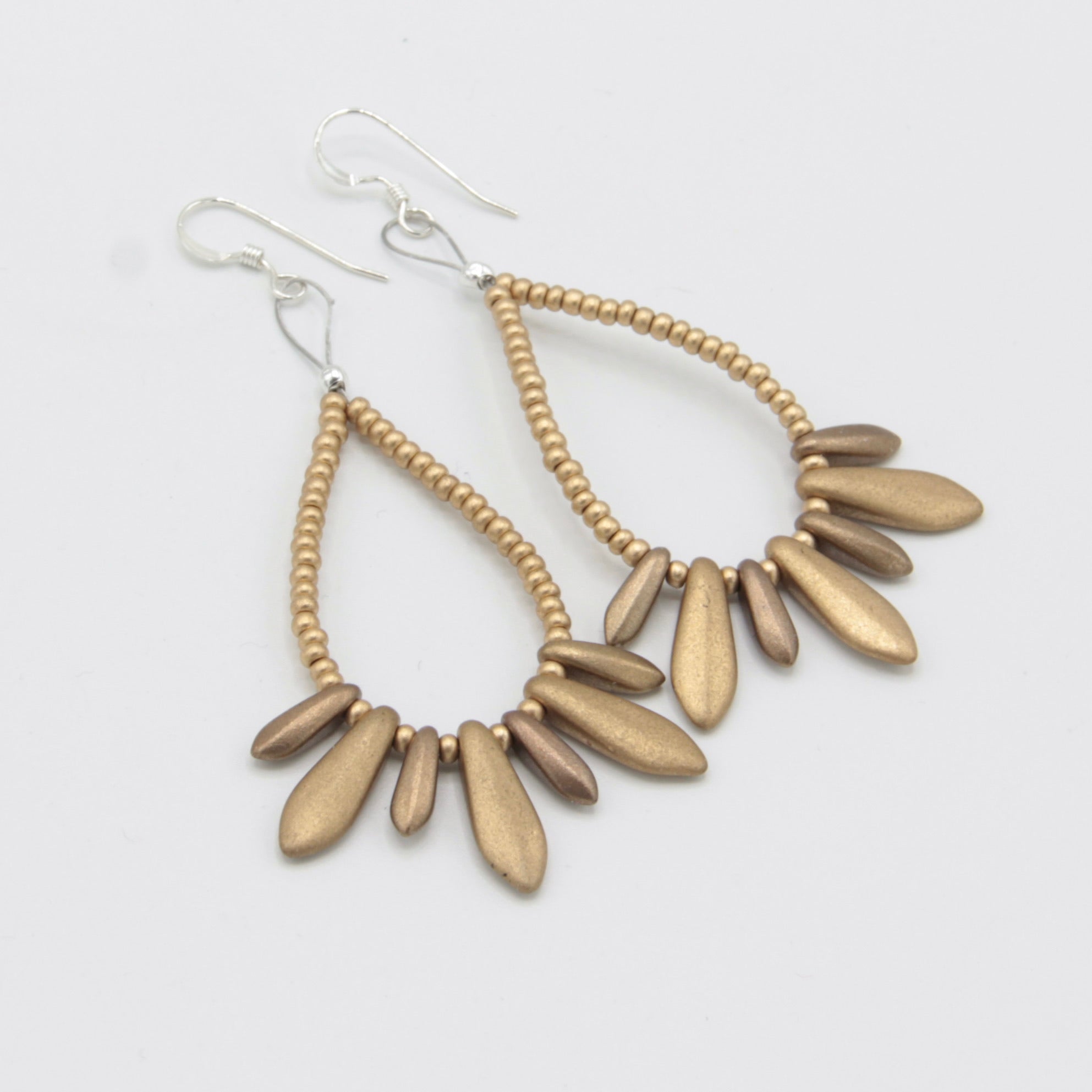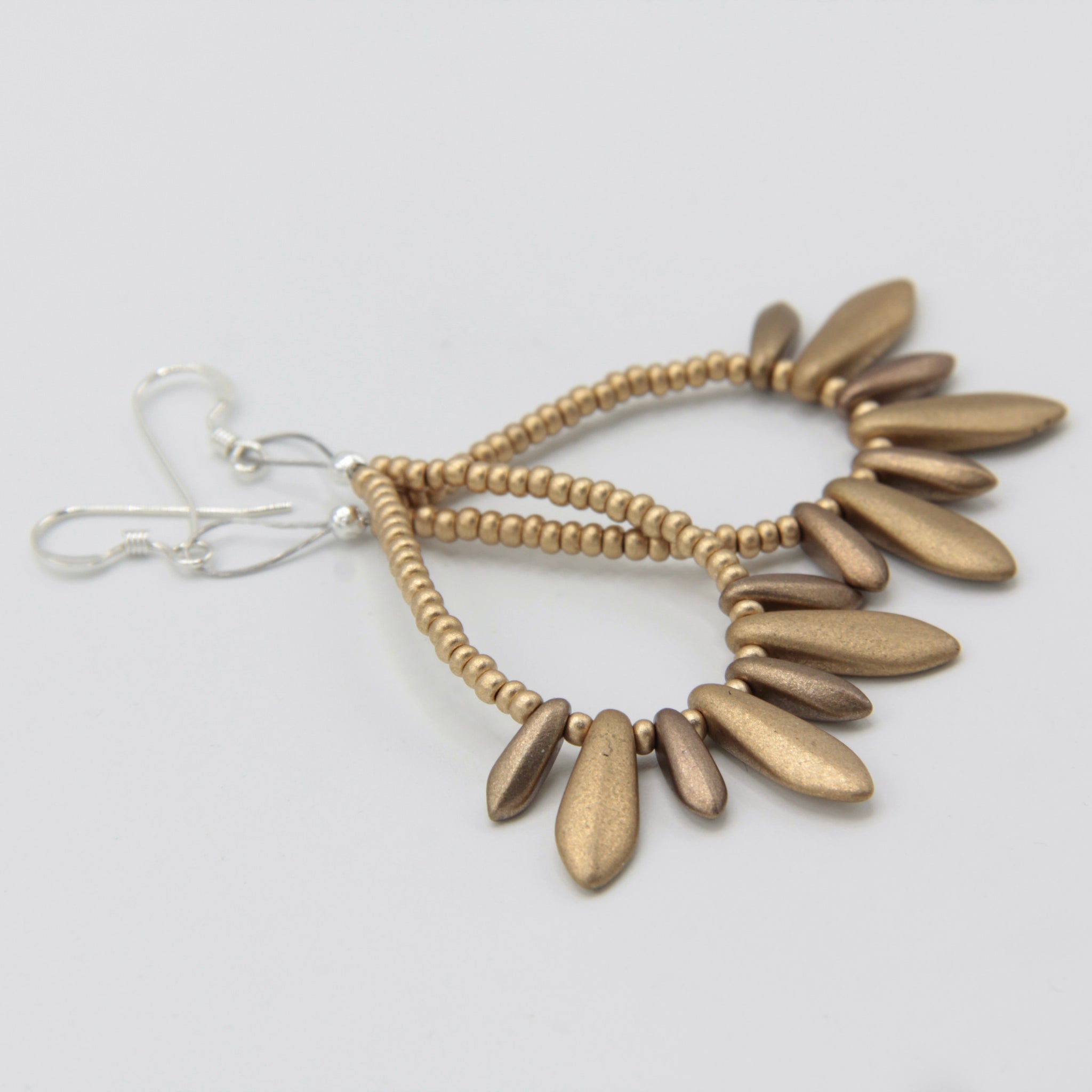 Imagine the day when you do not feel like dressing up in the morning and you need to give your outfit a little lift. Reach for dangly Amanda earrings and problem solved. You will not go unnoticed, guaranteed.  These Amanda earrings feature matte finished Czech glass beads in tru gold color.