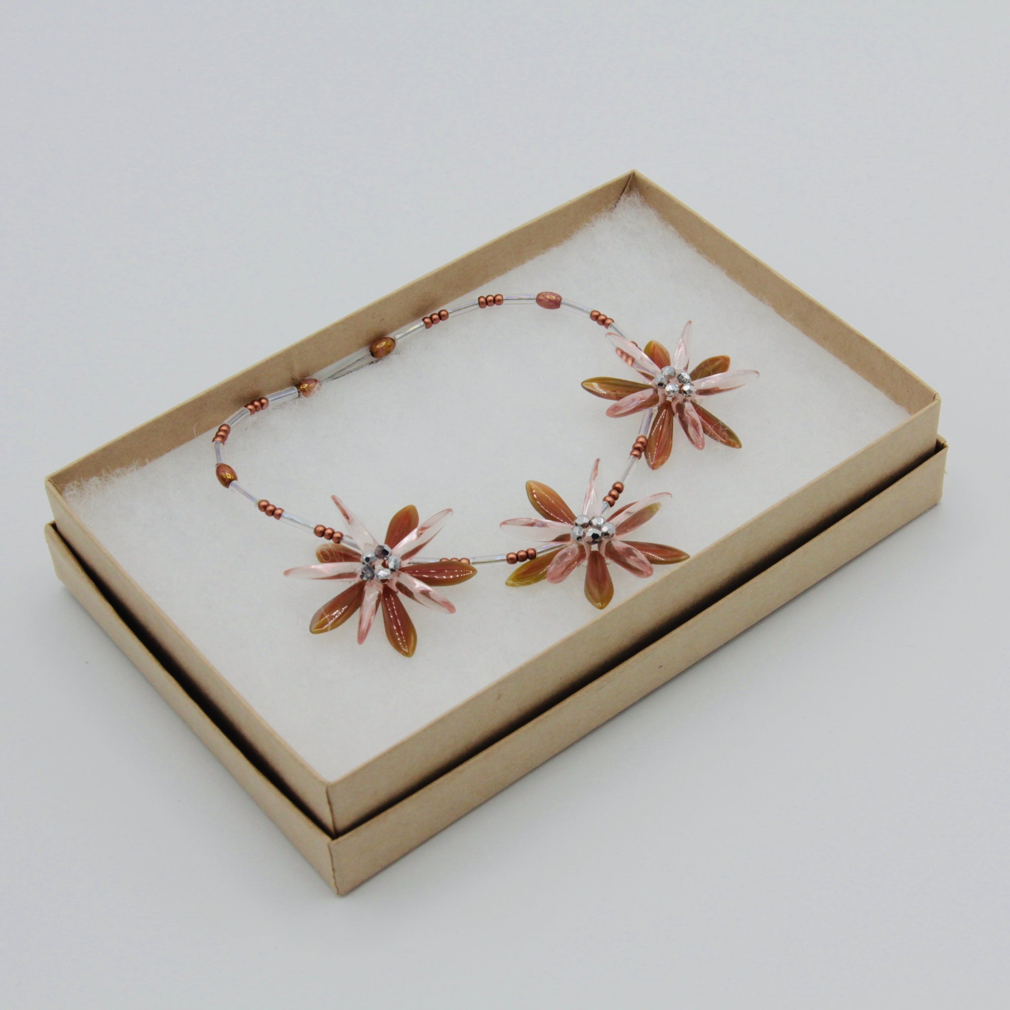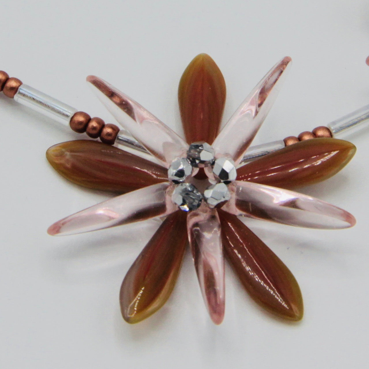 Dress it up with Anna Necklace of Shelalee signature style including handmade beaded flower designs. Here, the Coral shade offers tenderness without being overly sweet and a touch of Olive color brings in unique, stone like finish. Silver crystals in the center give just the right amount of shine. This necklace looks beautiful with pastel colors as well as any darker color tops.
