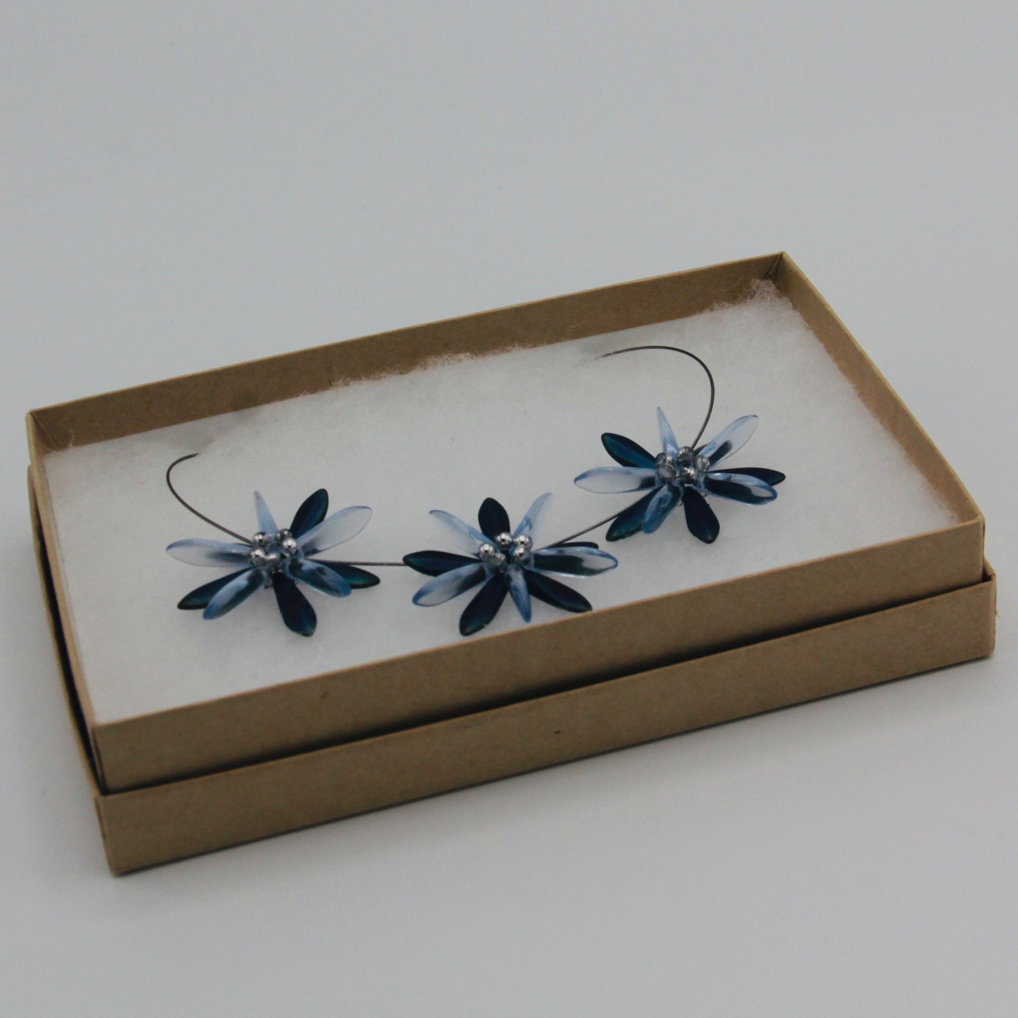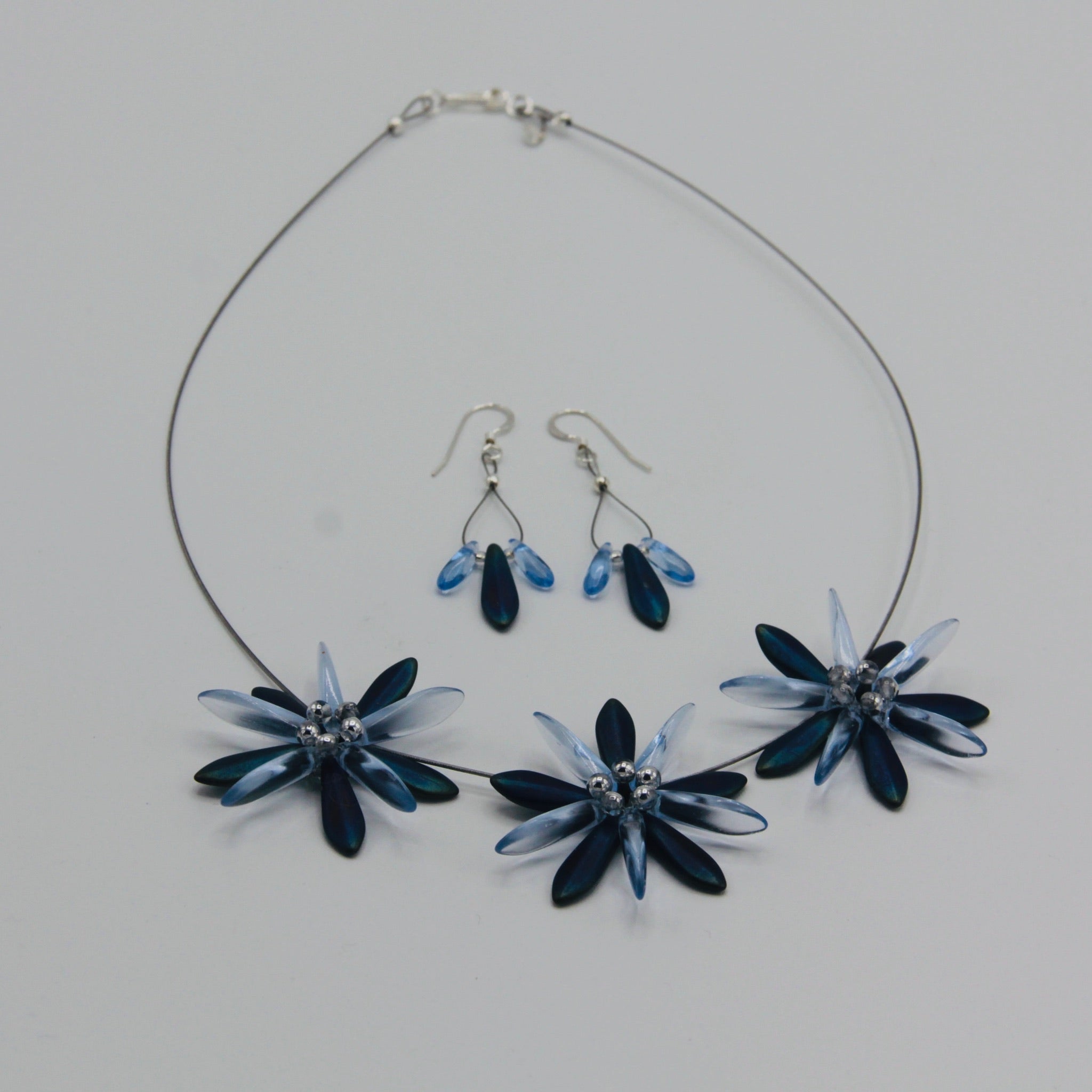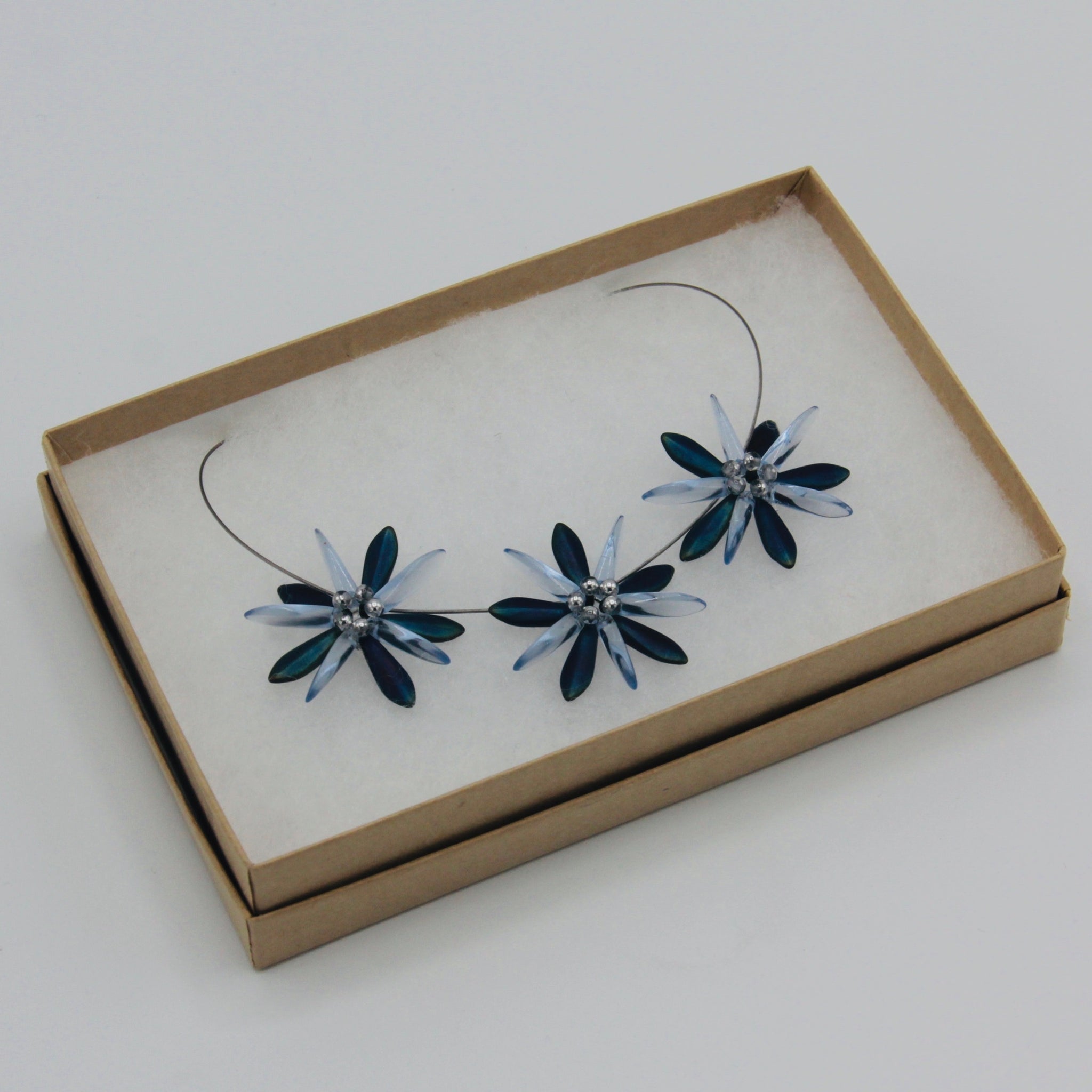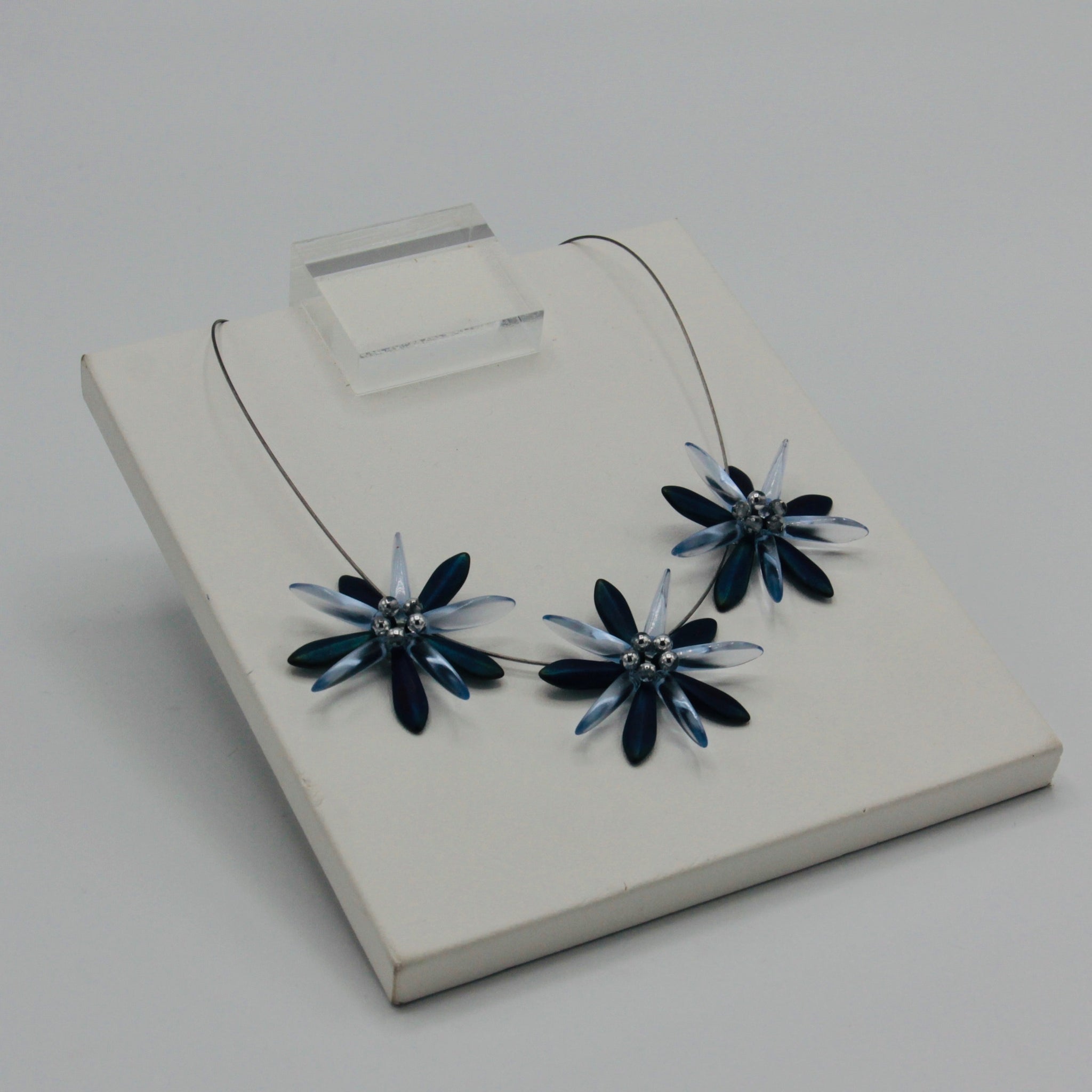 Dress it up with Anna Necklace of Shelalee signature style including handmade beaded flower designs. Featuring Czech glass beads with dark blue matte iris finish, this is a statement necklace that can take you from the office to an evening out with ease.