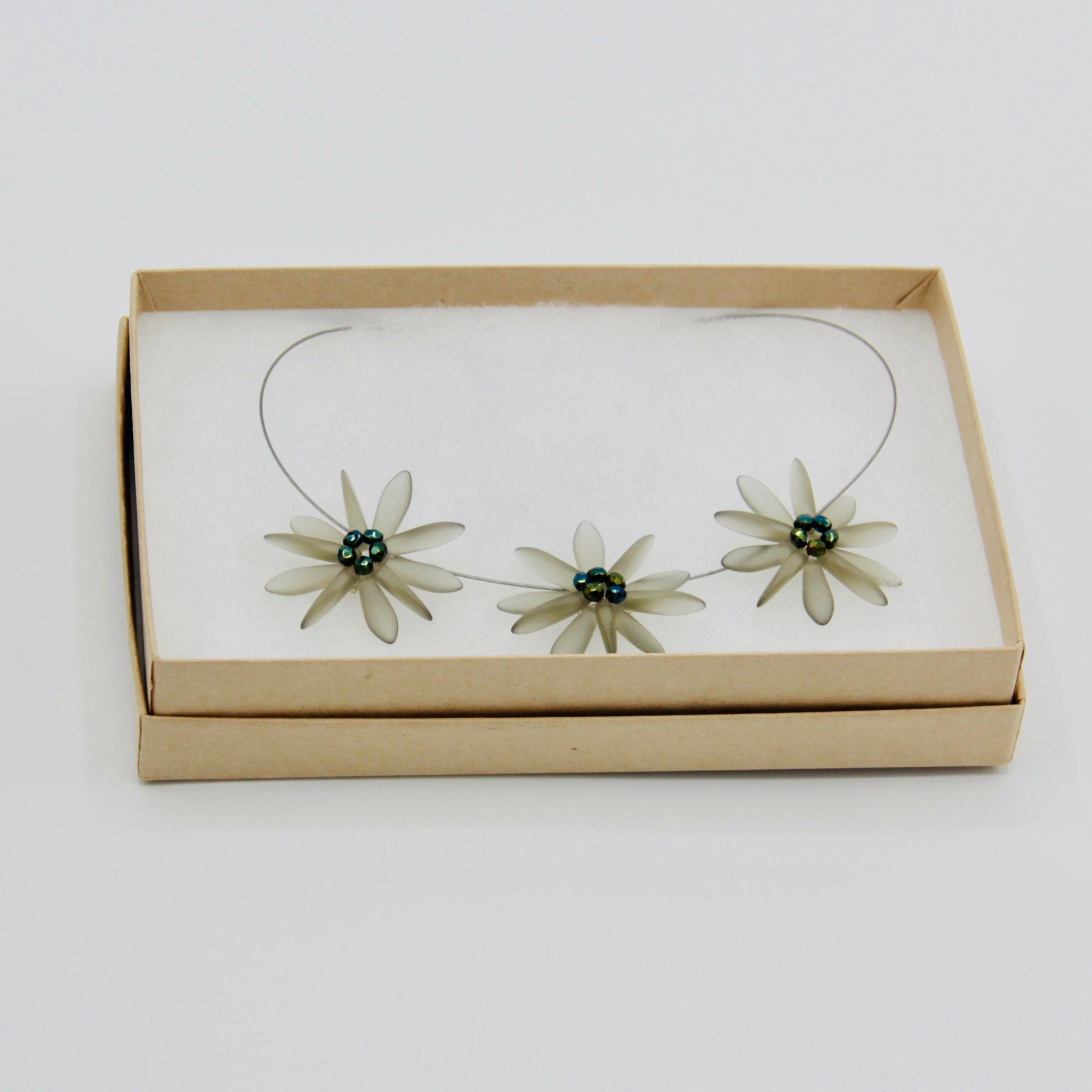 Dress it up with Anna Necklace of Shelalee signature style including handmade beaded flower designs. Featuring Czech glass beads and Sterling Silver closure, this Anna statement necklace in gray carries an earthy look and pops out a little shine at the same time.