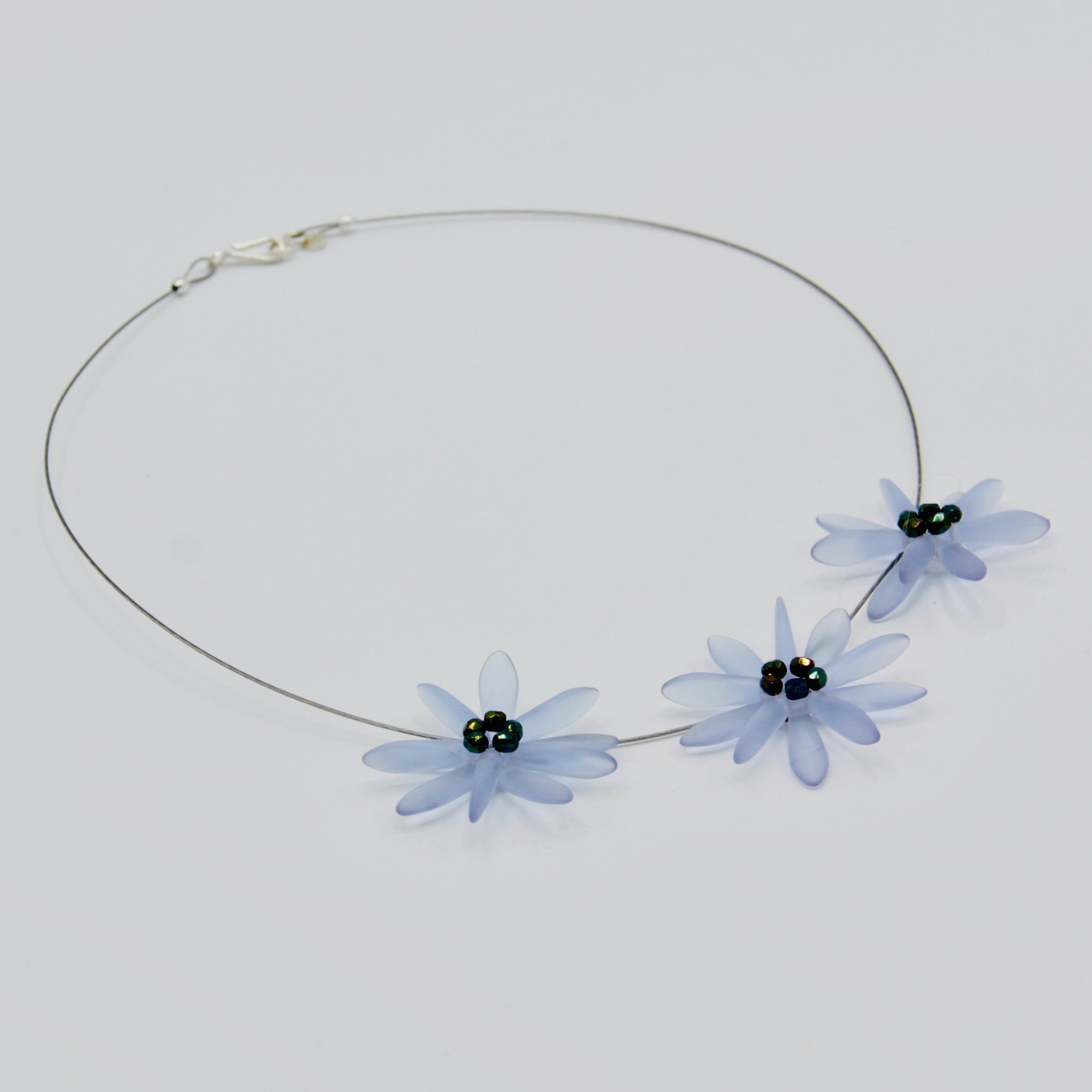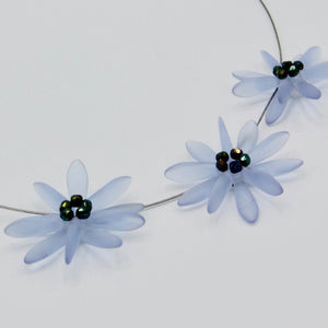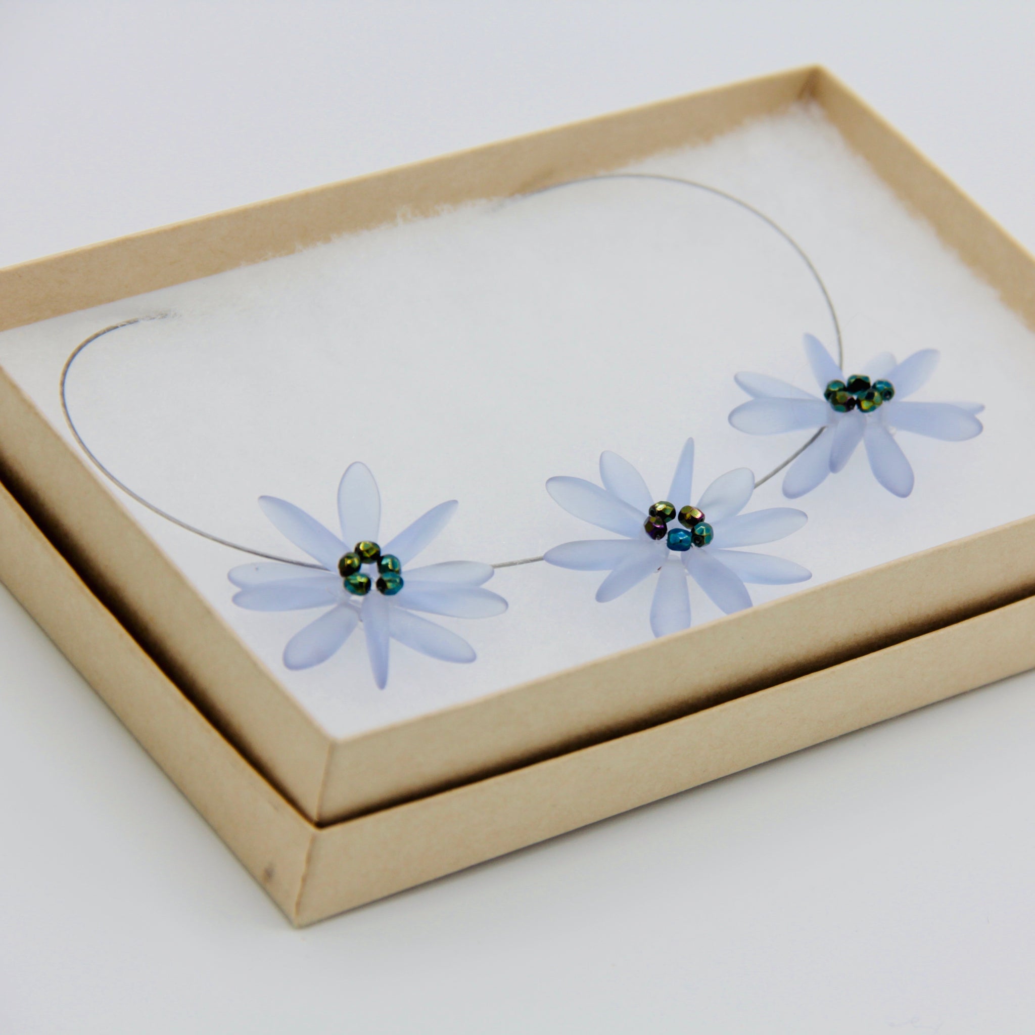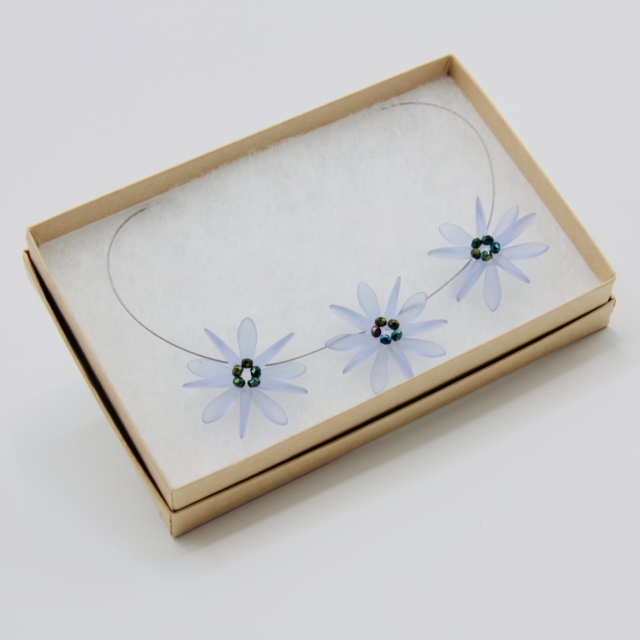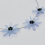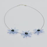Dress it up with Anna Necklace of Shelalee signature style including handmade beaded flower designs. Featuring Czech glass beads and Sterling Silver closure, this Anna statement necklace in light blue is neutral and pops out a little shine at the same time. The color of the beads changes from light blue to light purple depending on the lighting, so your necklace is ever changing. Wendy ring in matching colors is also available.
