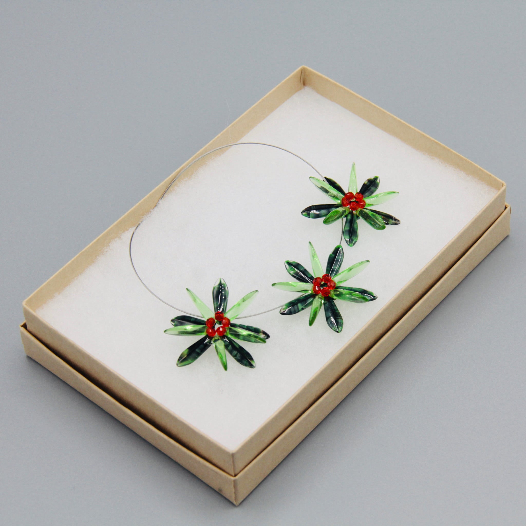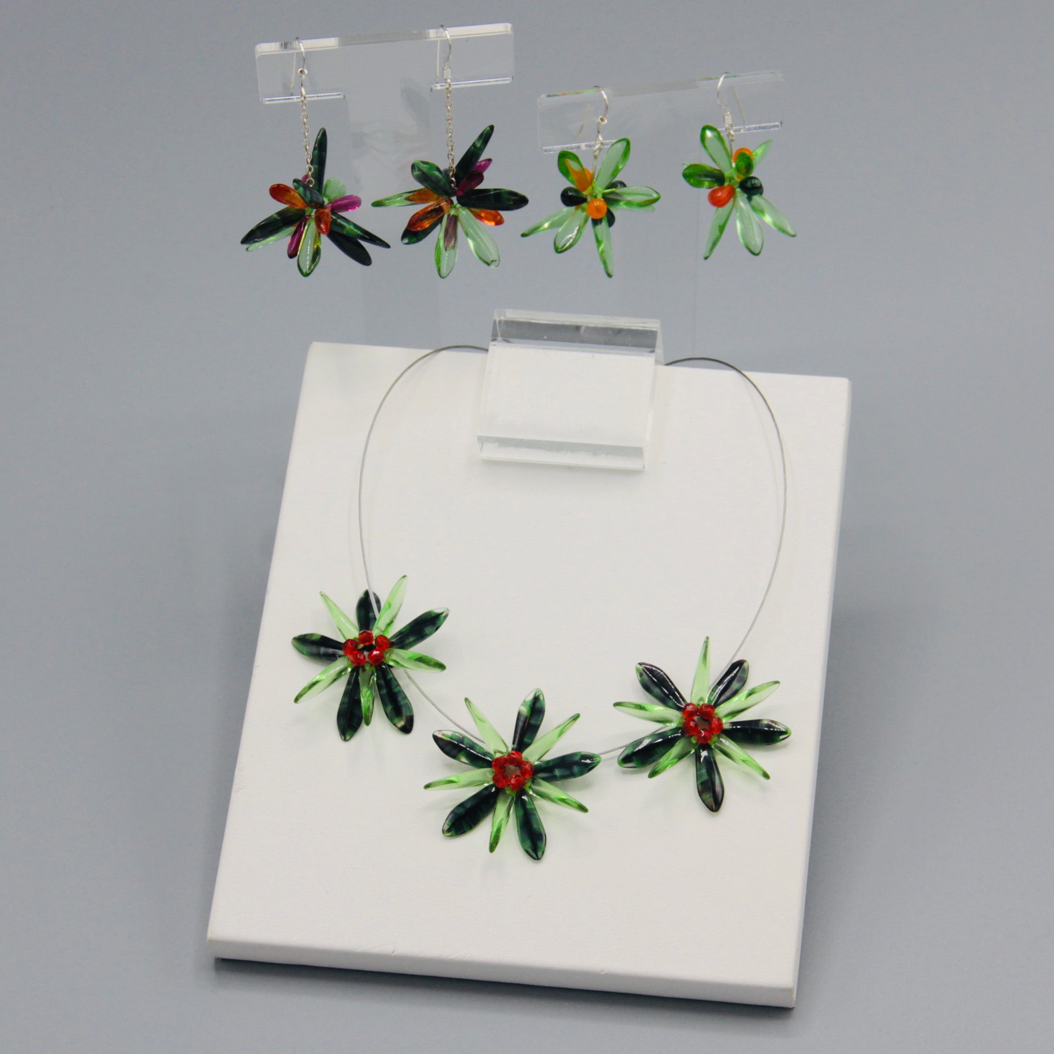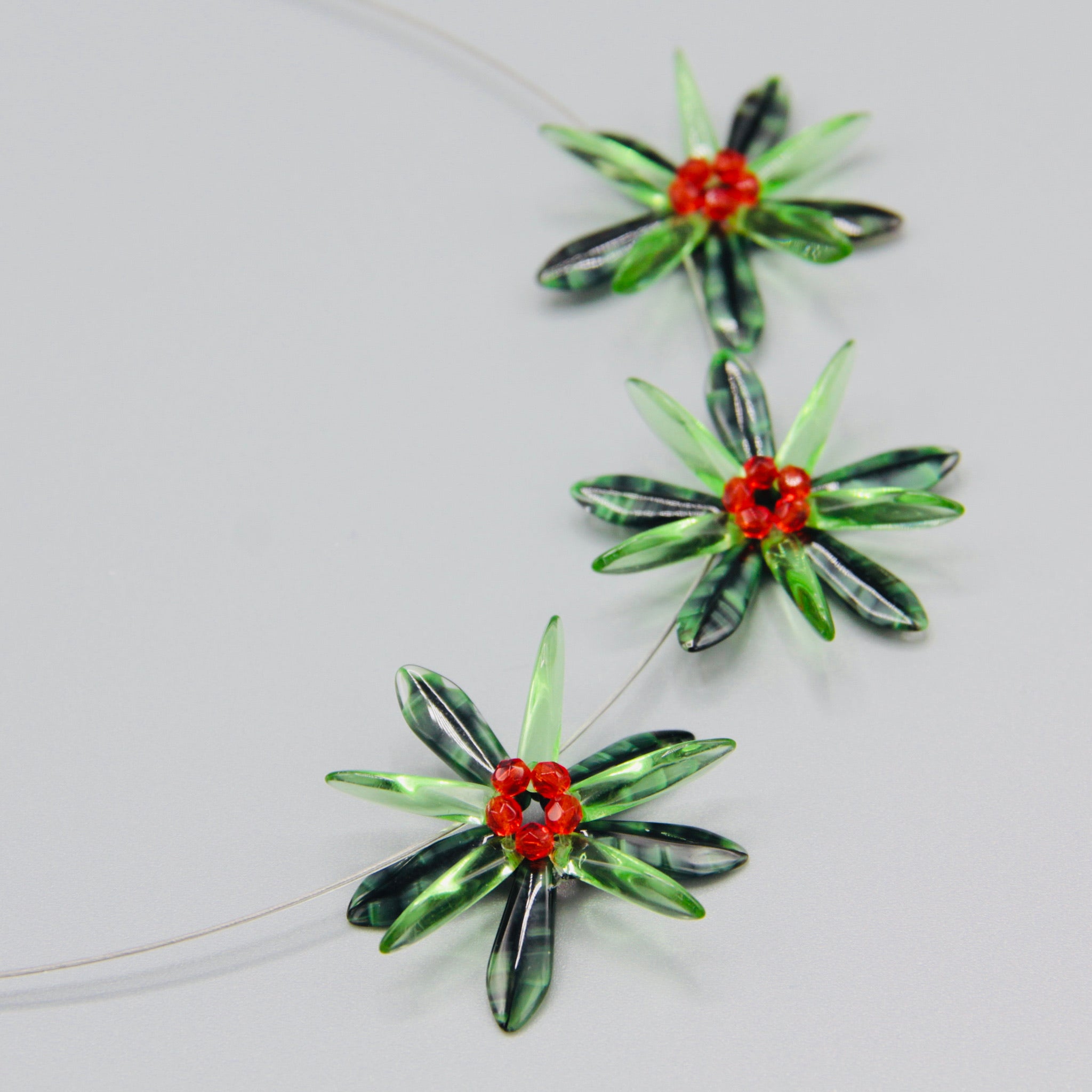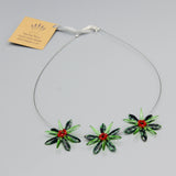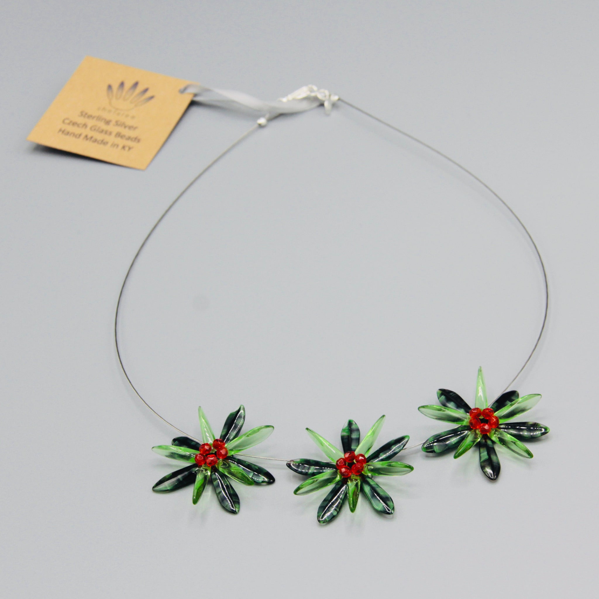 Dress it up with Anna Necklace of Shelalee signature style including handmade beaded flower designs. Featuring Czech glass beads in mix of tropical green beads and deep reddish orange center, this is a statement necklace that can take you from the office to an evening out with ease. It is paired nicely with matching Laura or Emma earrings as featured in the picture of the whole set.