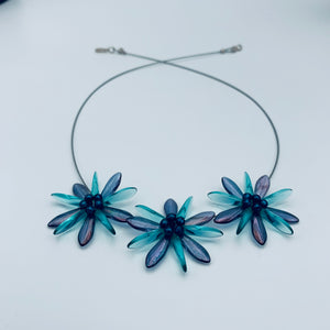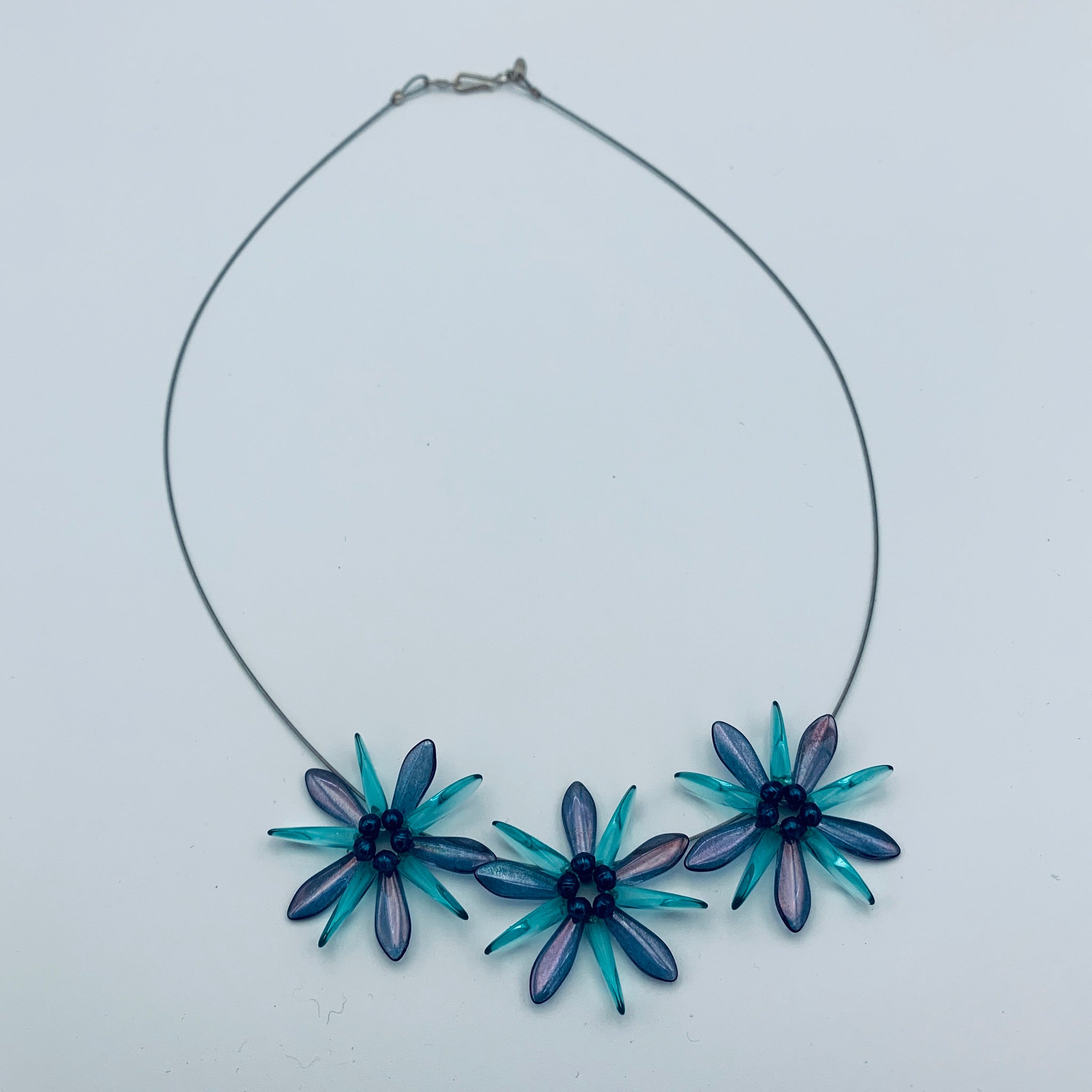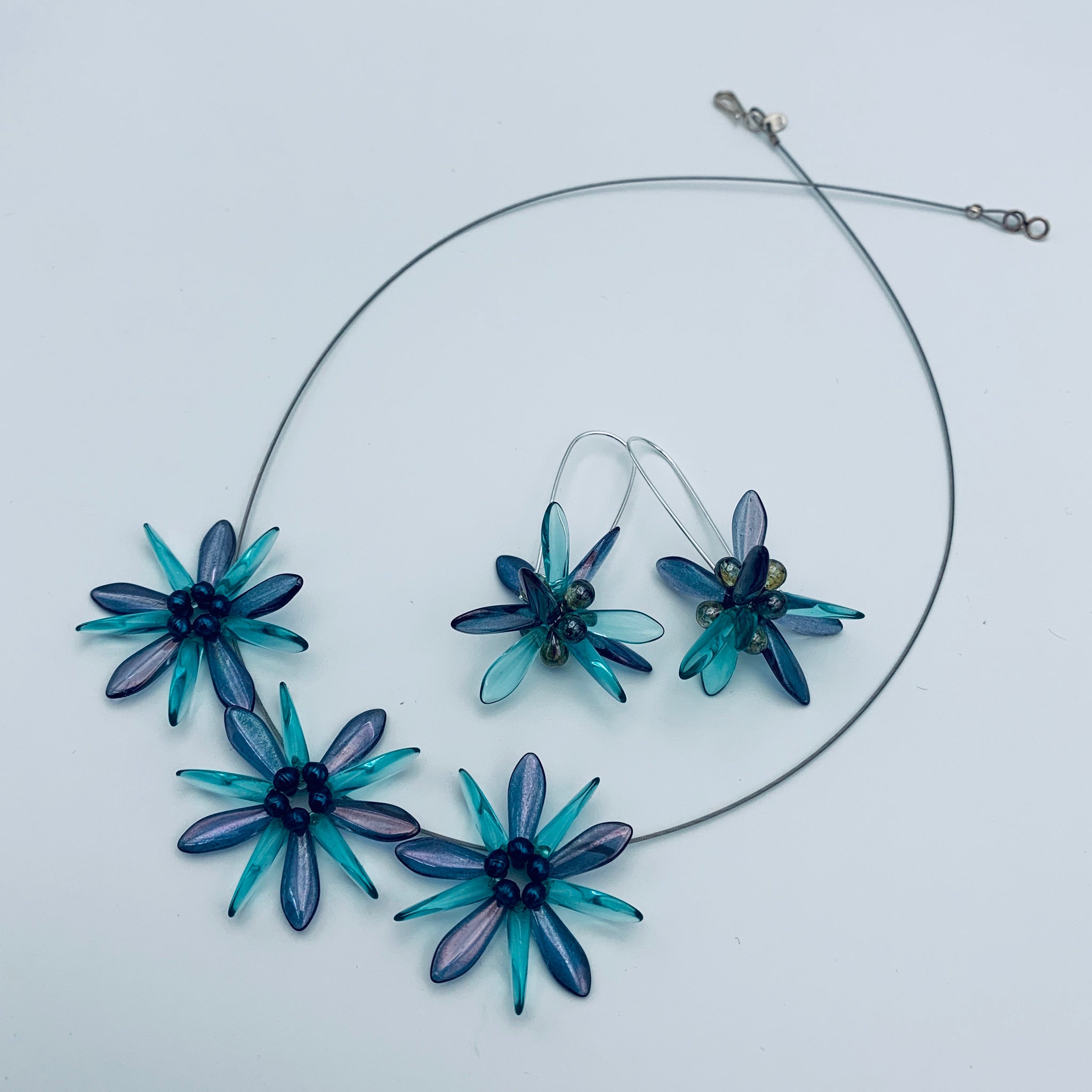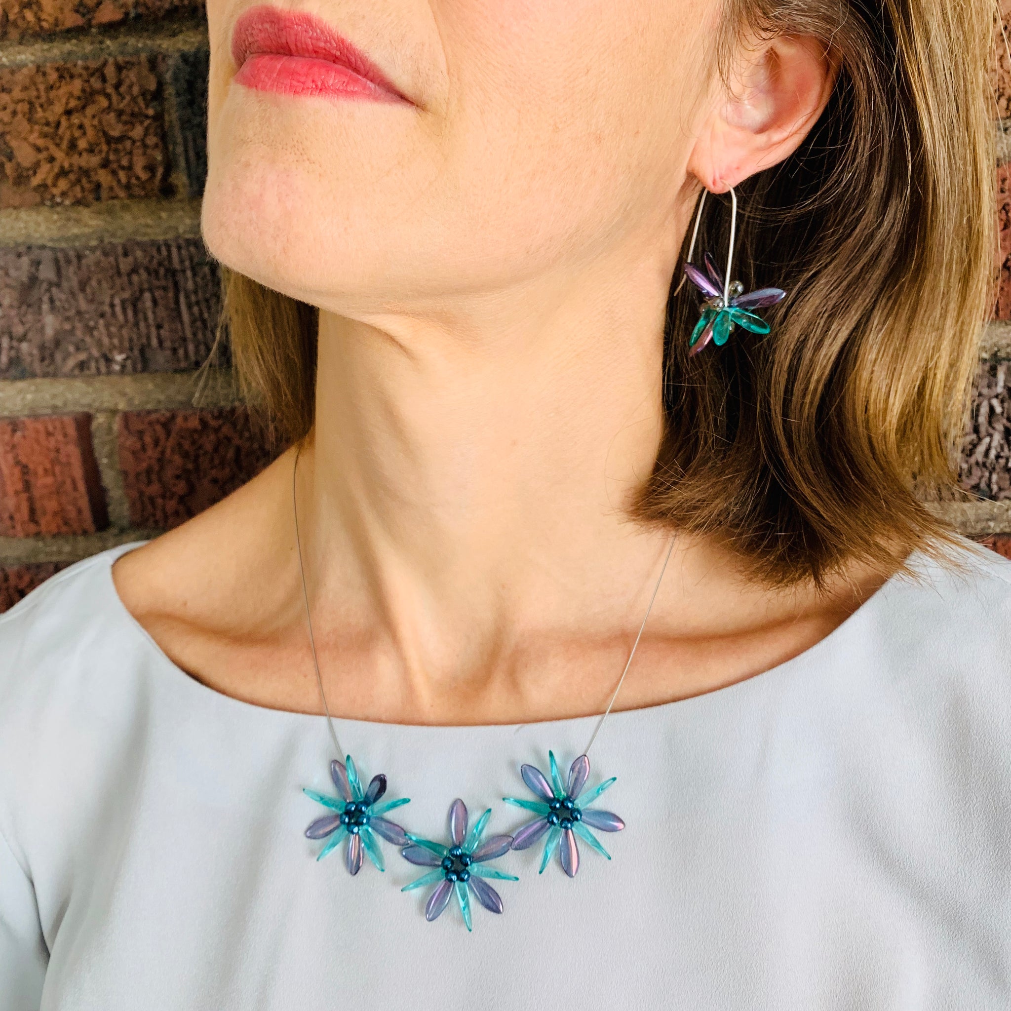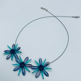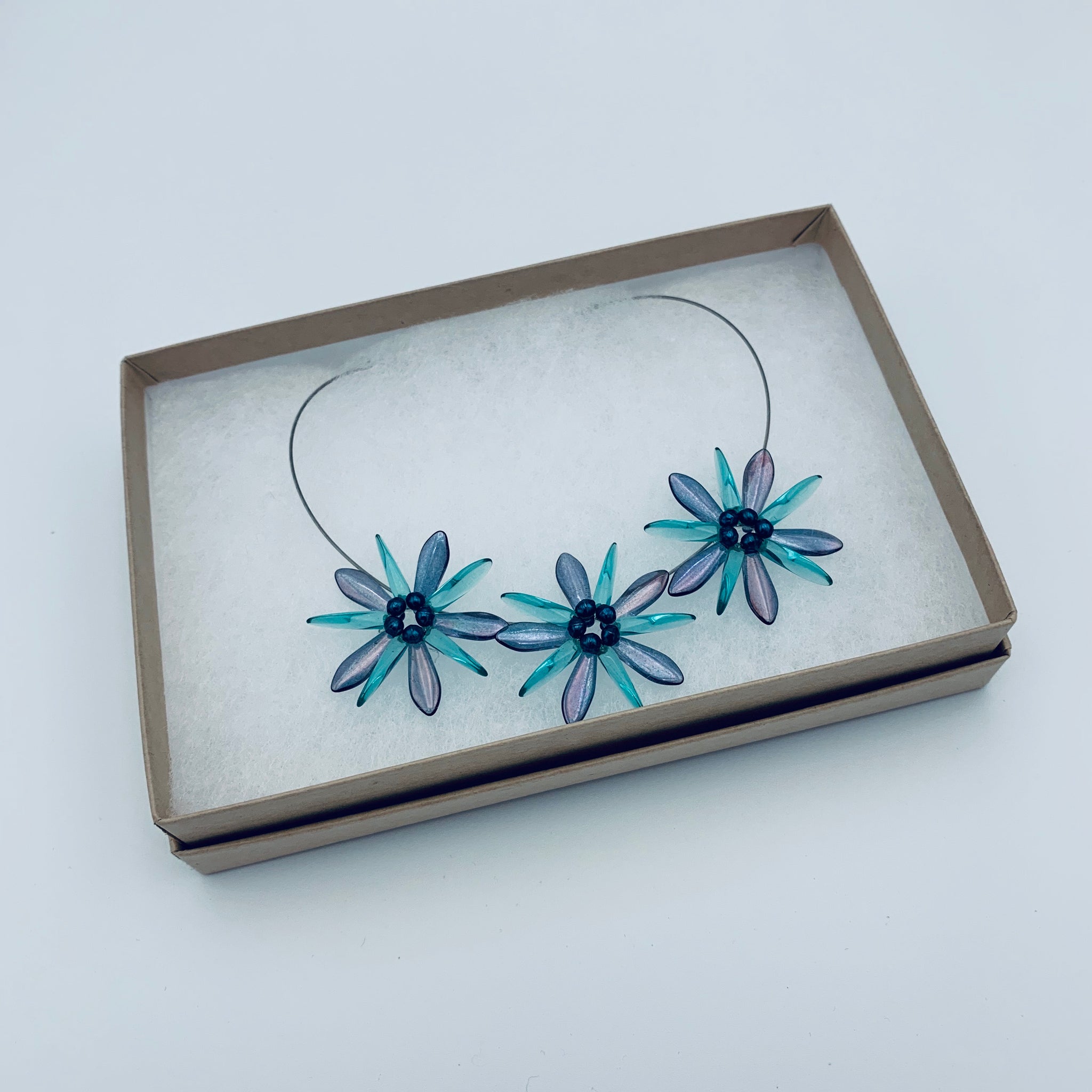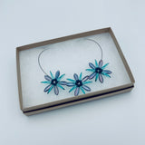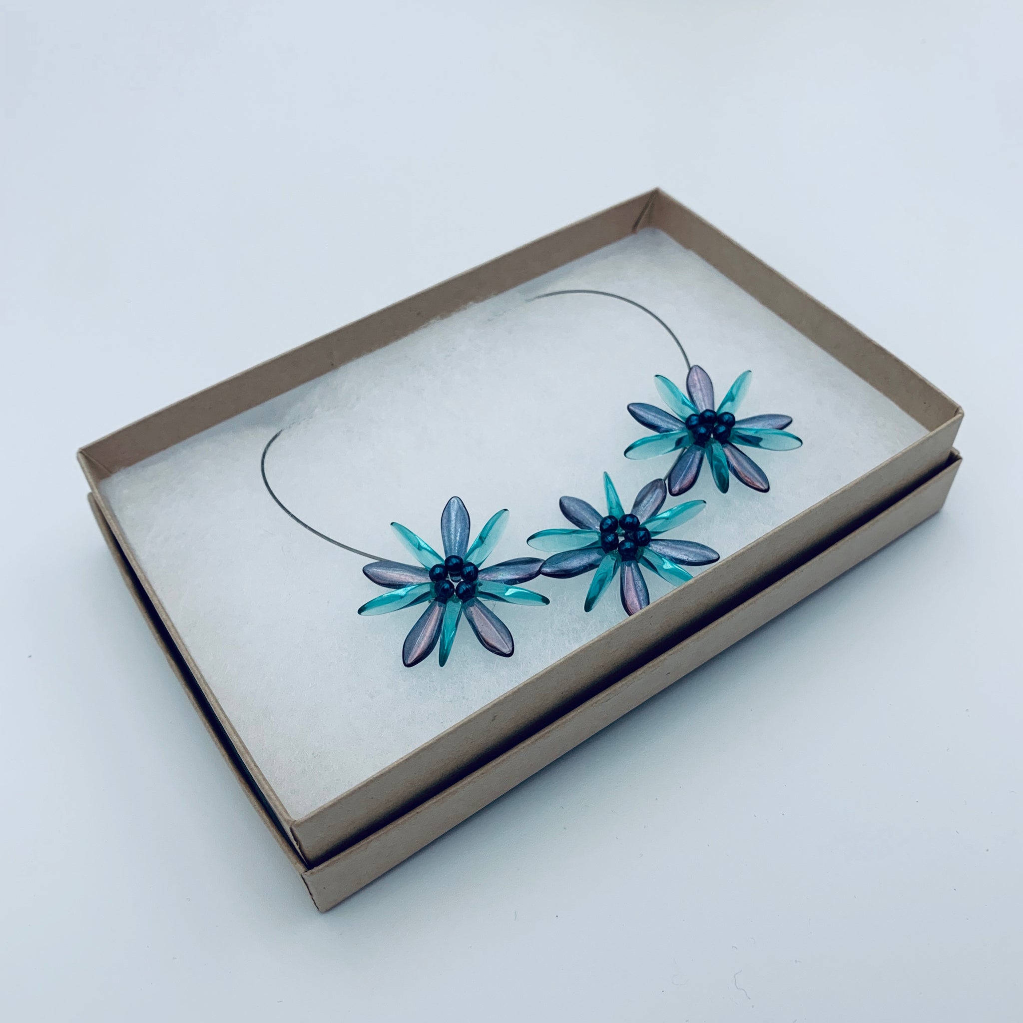 Dress it up with Anna Necklace of Shelalee signature style including handmade beaded flower designs. Featuring Czech glass beads and Sterling Silver, the Anna statement necklace in blue and aqua can take you from the office to an evening out with ease.