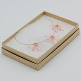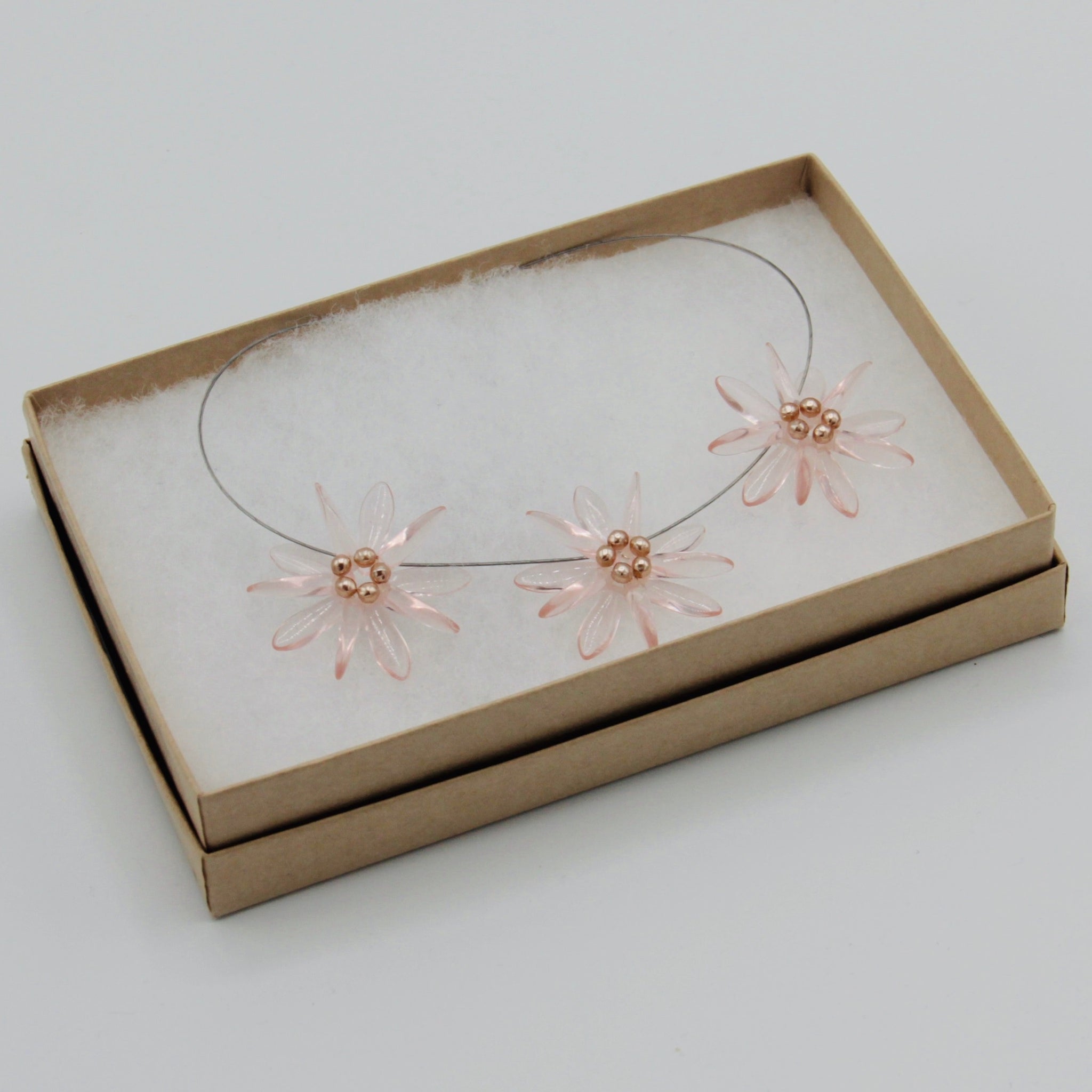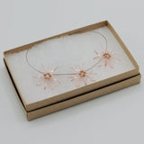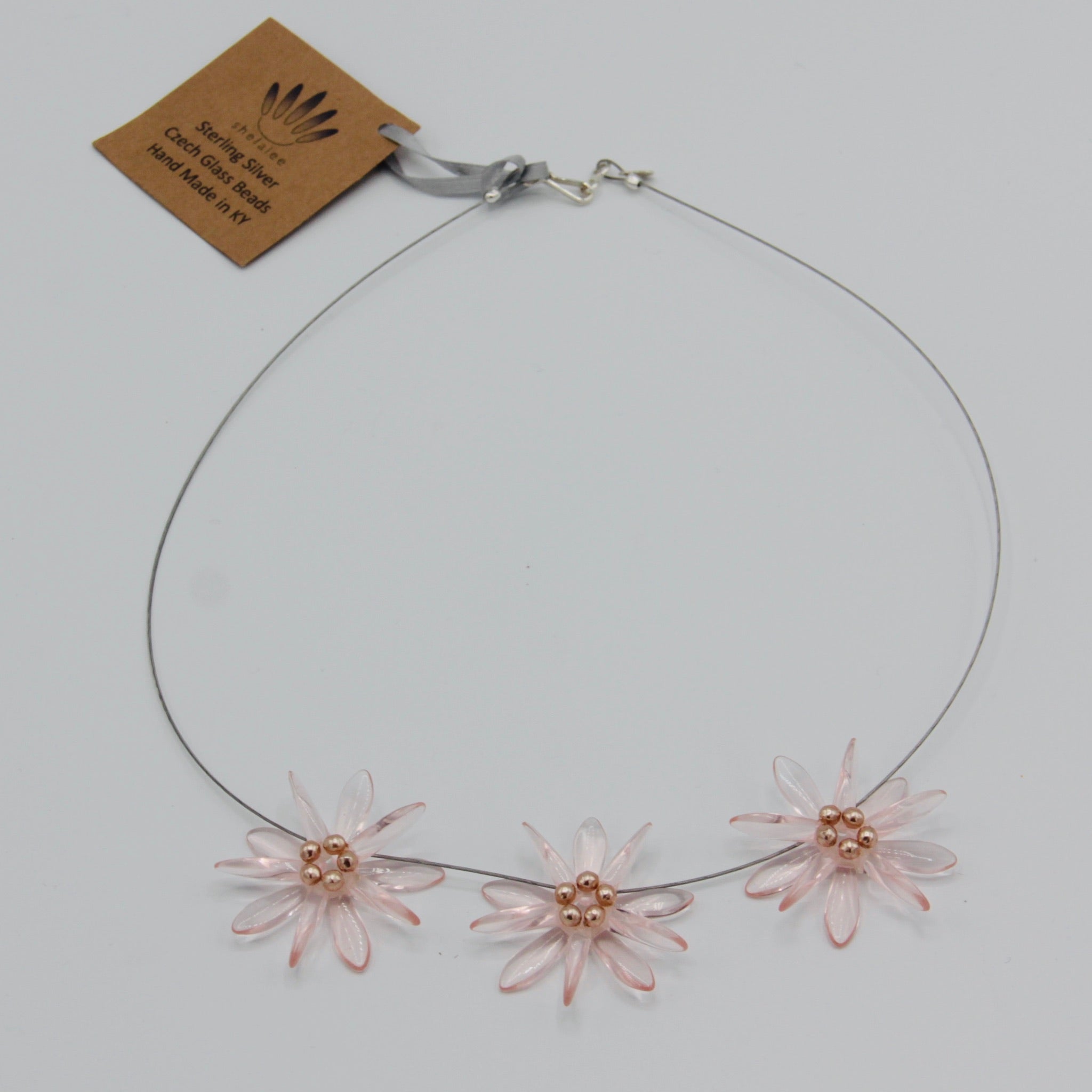 Dress it up with Anna Necklace of Shelalee signature style including handmade beaded flower designs. Featuring Czech glass beads in soft transparent pink with pearl center, this is a statement necklace that can take you from the office to an evening out with ease.  It is paired nicely with matching Laura earrings as featured in the picture of the whole set.