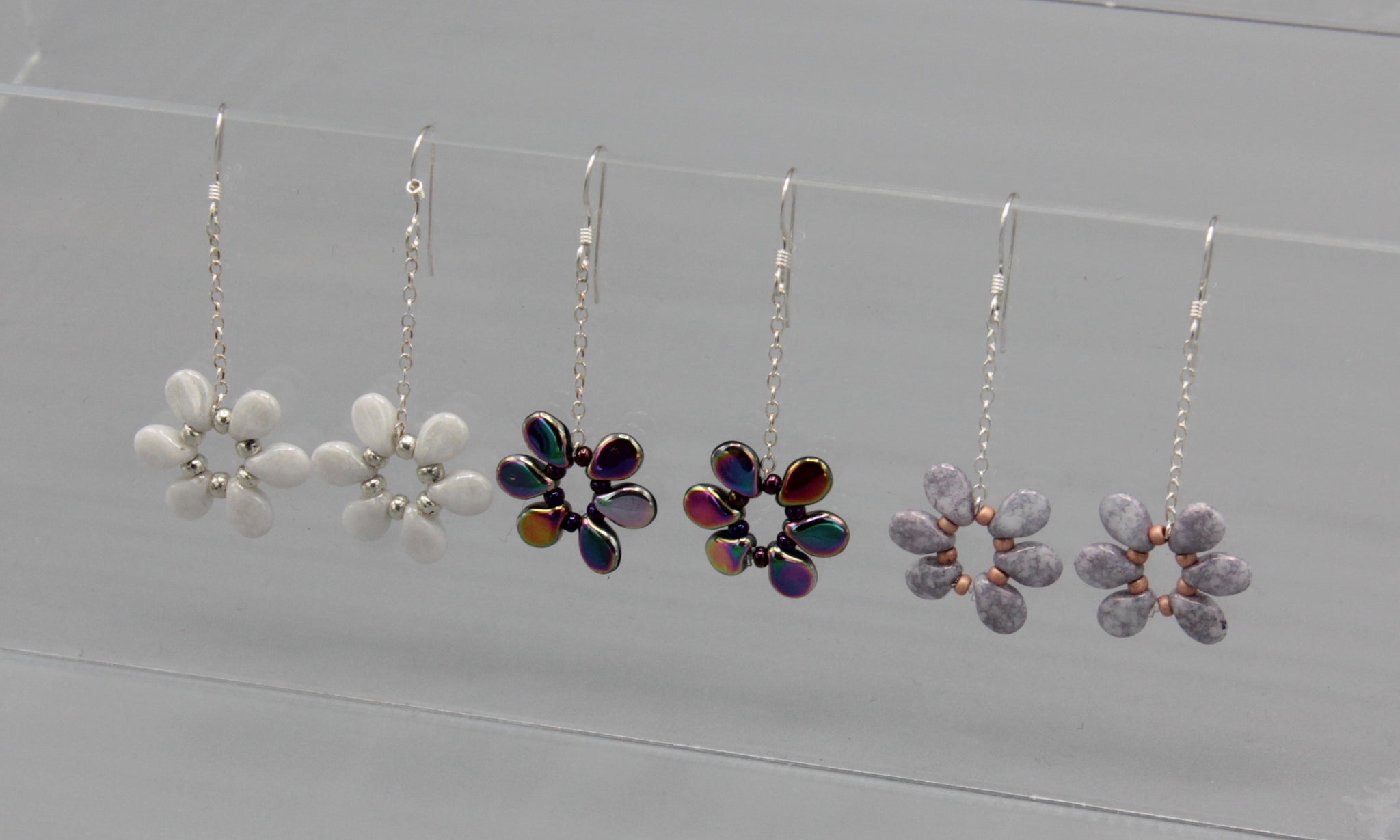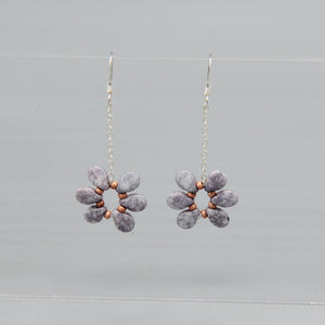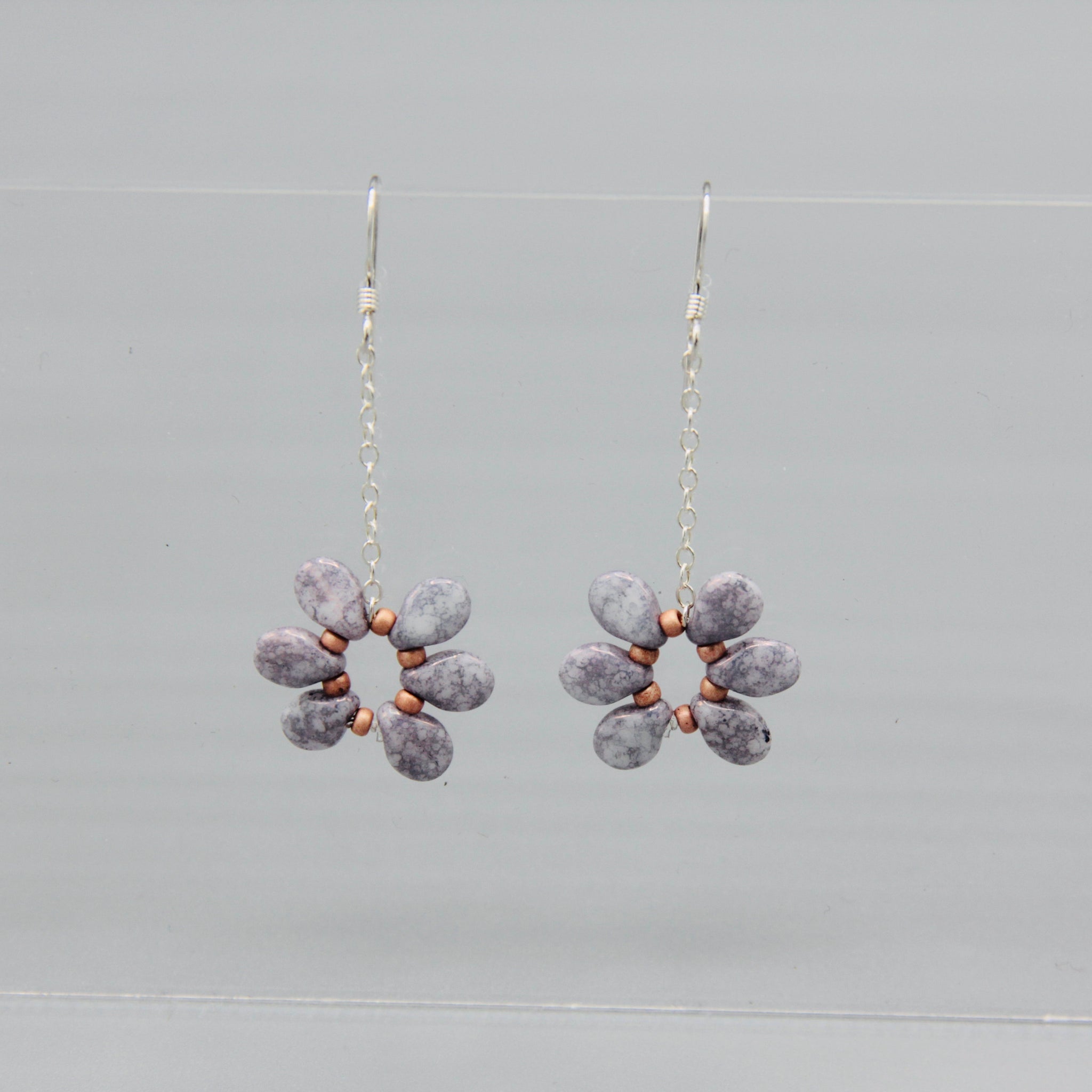 Get your florals on with the Daisy earrings. They are very lightweight and dangly at the same time. They are super fun with any spring or summer outfit. Featuring Czech glass beads and Sterling Silver, the lilac beads of Daisy earrings have a lovely stone finish and are accented with matte coral seed beads.