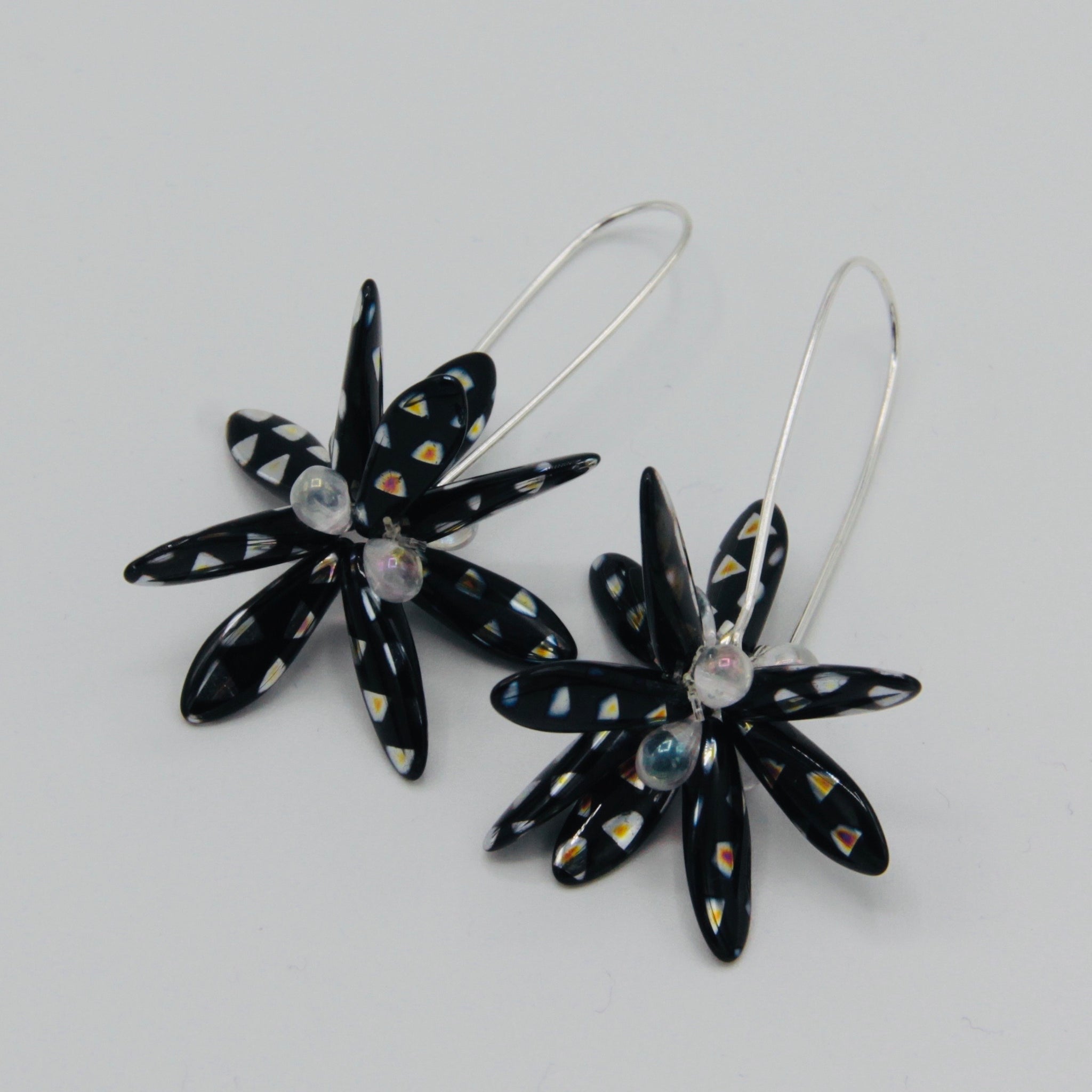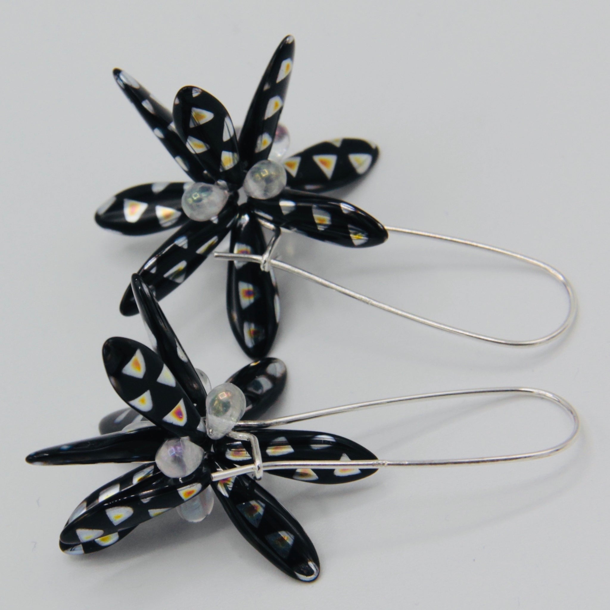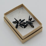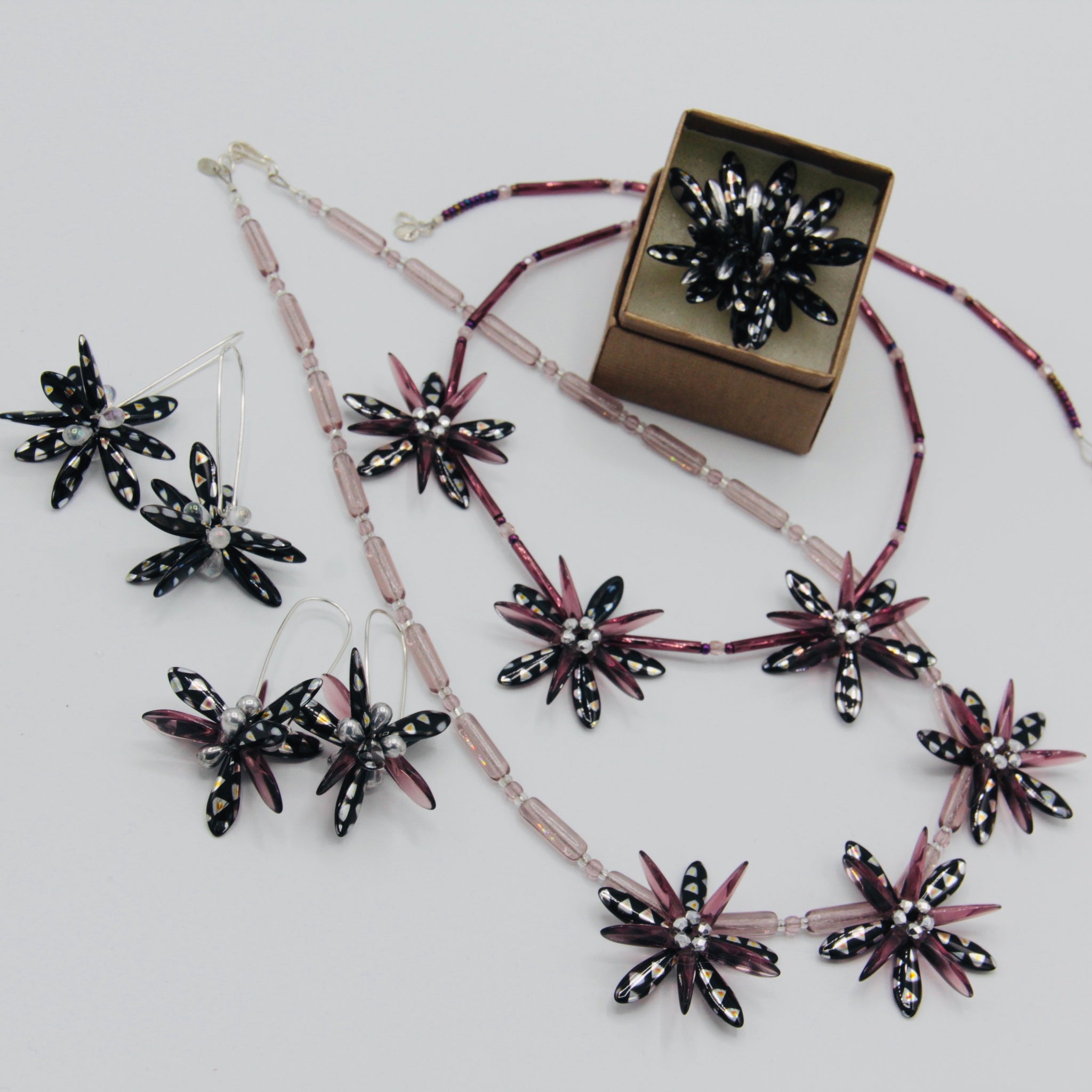 If you are looking for a fun earring that you can wear for any occasion, Eileen Earrings are your best choice. Featuring Czech glass beads and Sterling Silver, these best selling Eileen Earrings in metallic black with stíny crystal drops are available in two different lengths. Pictured here is the longer, 1 1/2-inch version. Matching Wendy ring is available as well as larger set with Anna necklace, as shown in the picture.