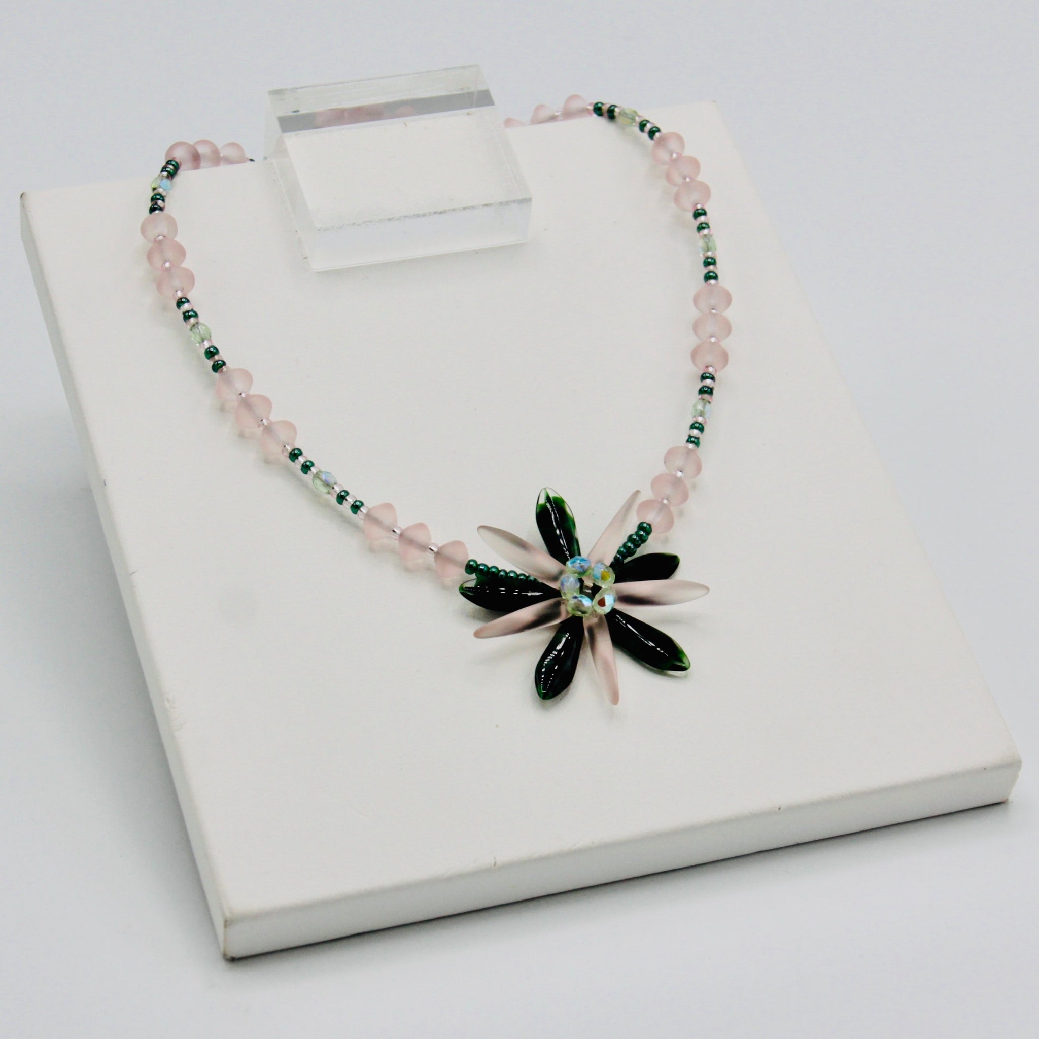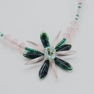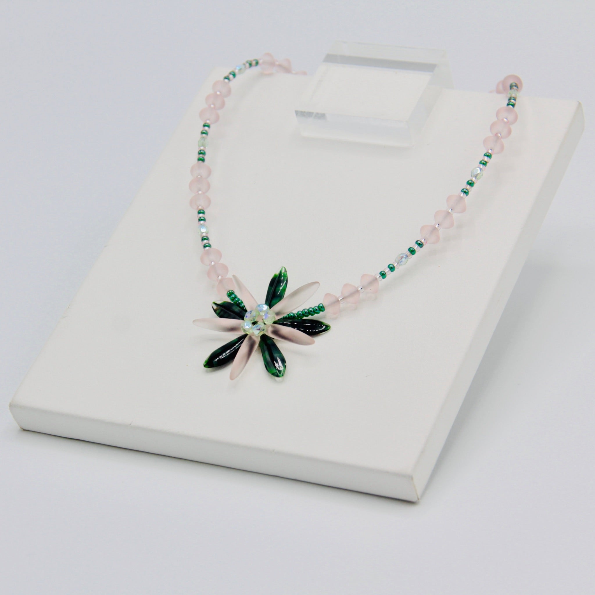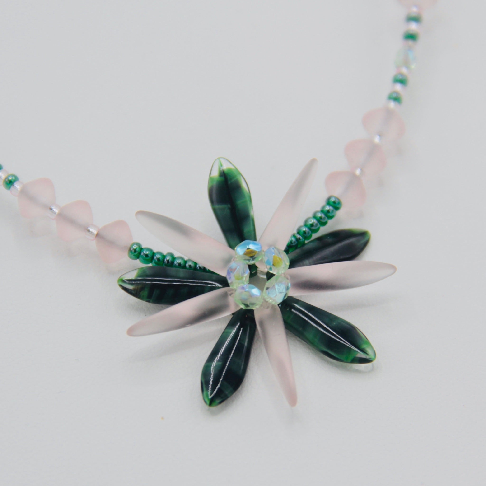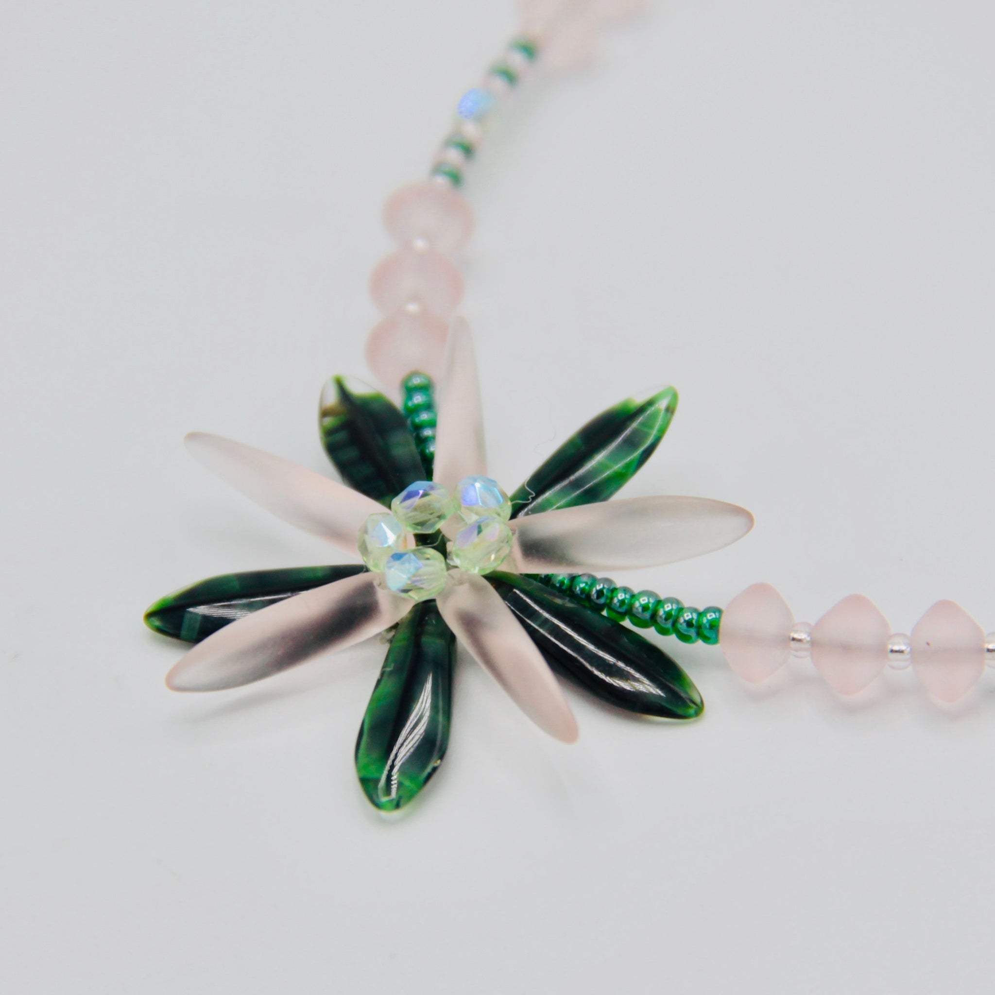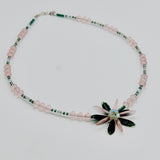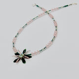 This beaded Elizabeth necklace is one-of-a-kind piece inspired by nature. Featuring a single Shelalee signature beaded flower with matte pink and stone green beads, the necklace is beaded with a mix of matte pink beads and small seed beads creating a nice harmony of nature inspired motives.