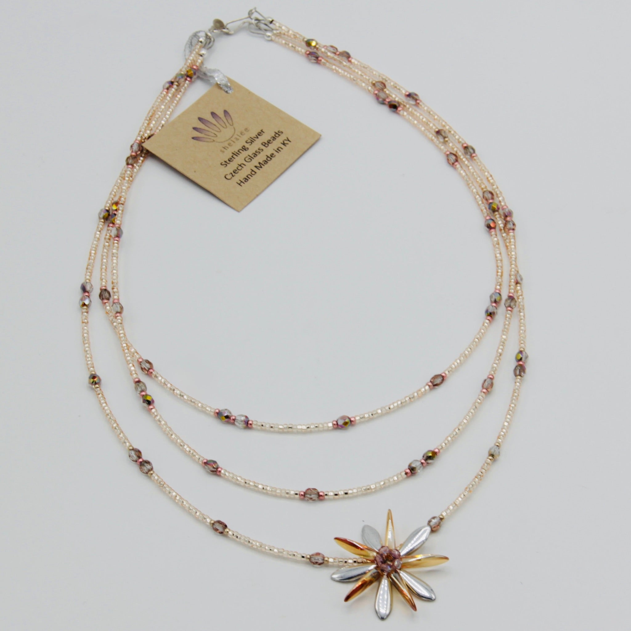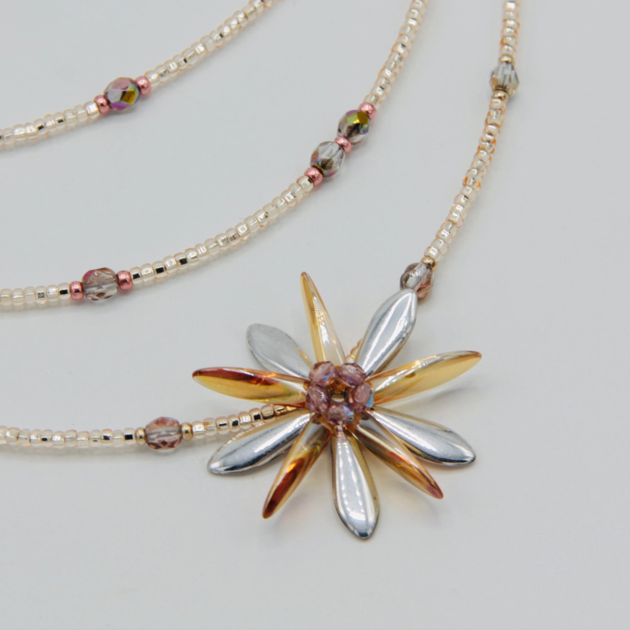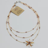 This Elizabeth Necklace is a stunning statement piece that shines wherever you go. Featuring a signature Shelalee beaded flower, delicate beaded strands adorned with crystal golden beads, and a Sterling Silver closure, this necklace is perfect for any festive occasion. Matching earrings sold separately.