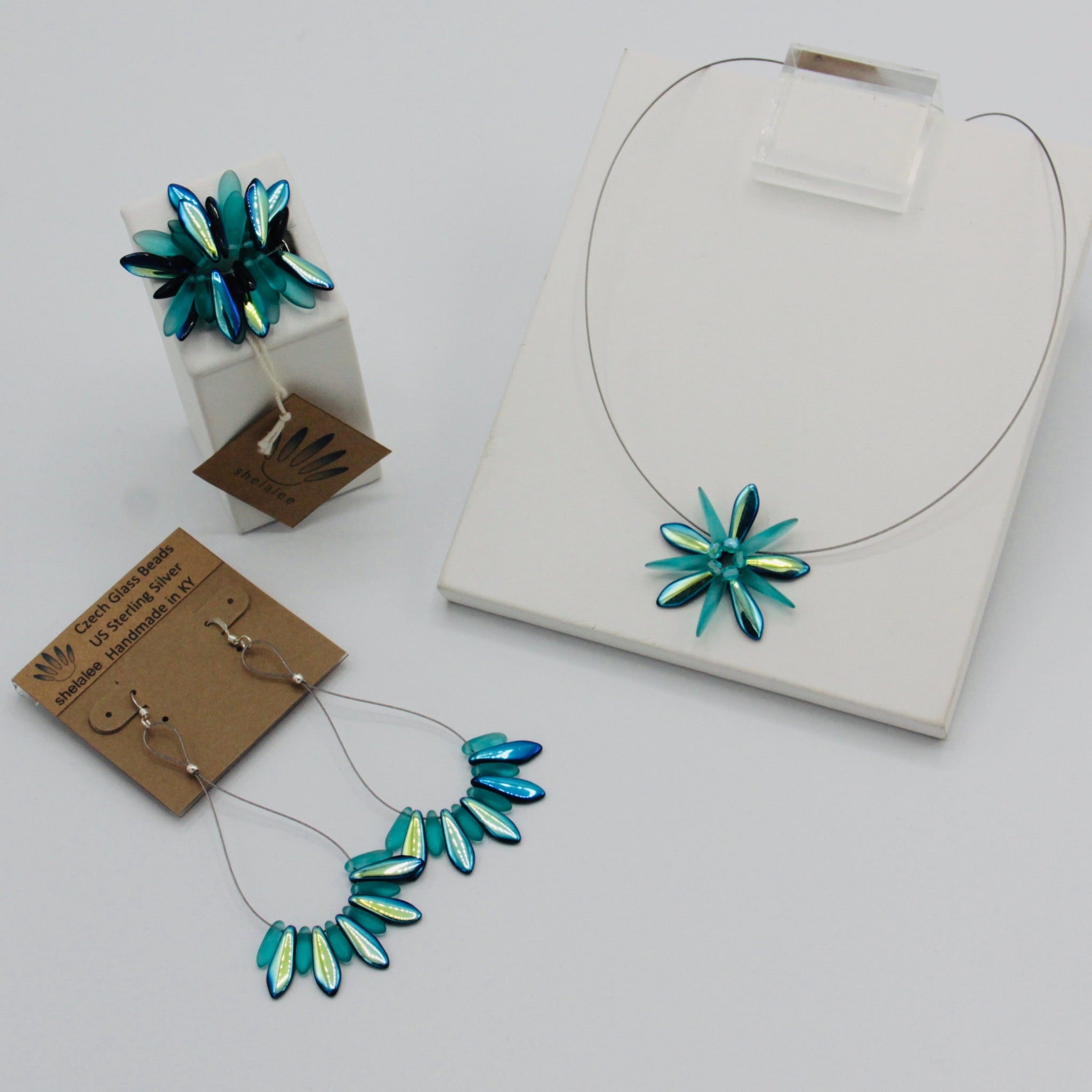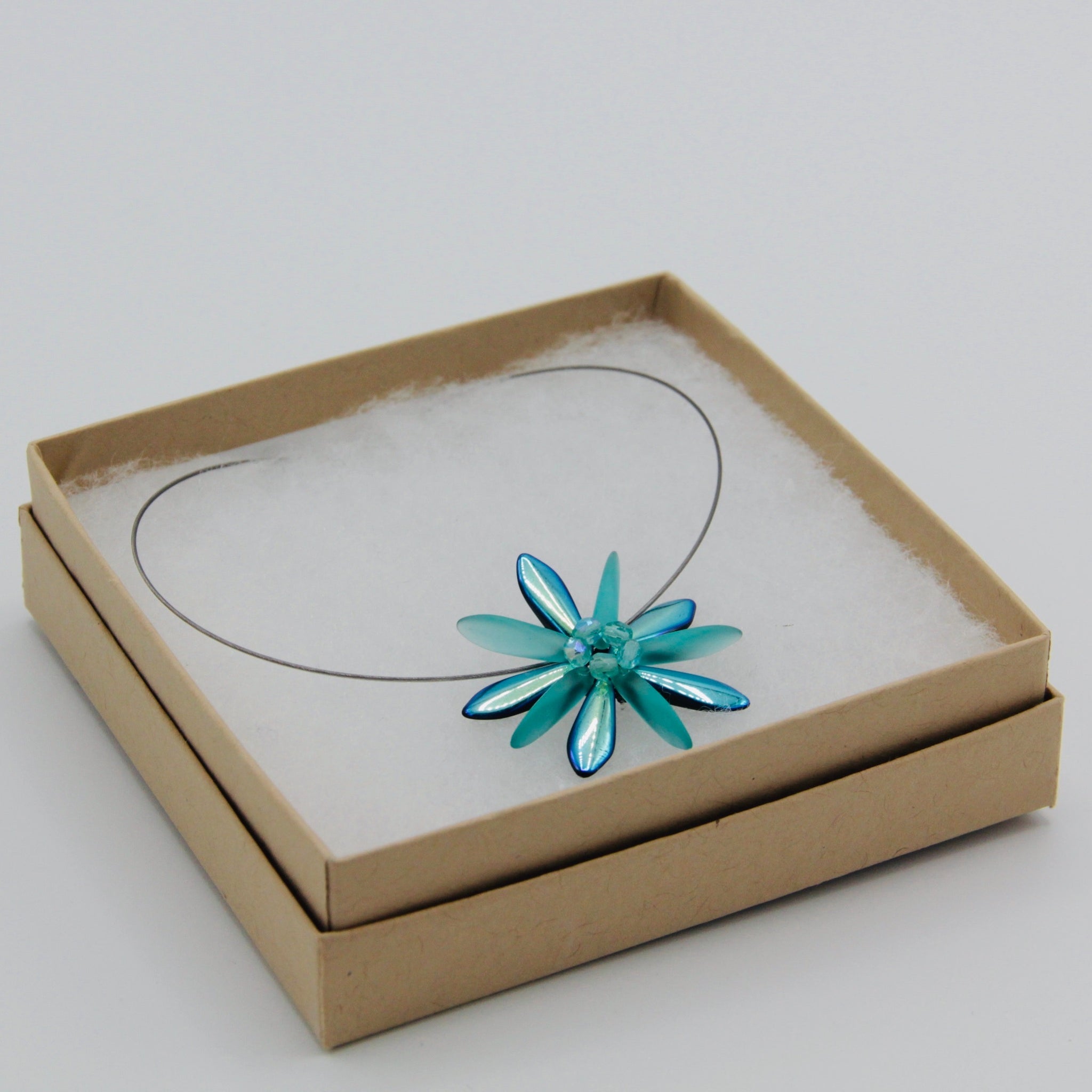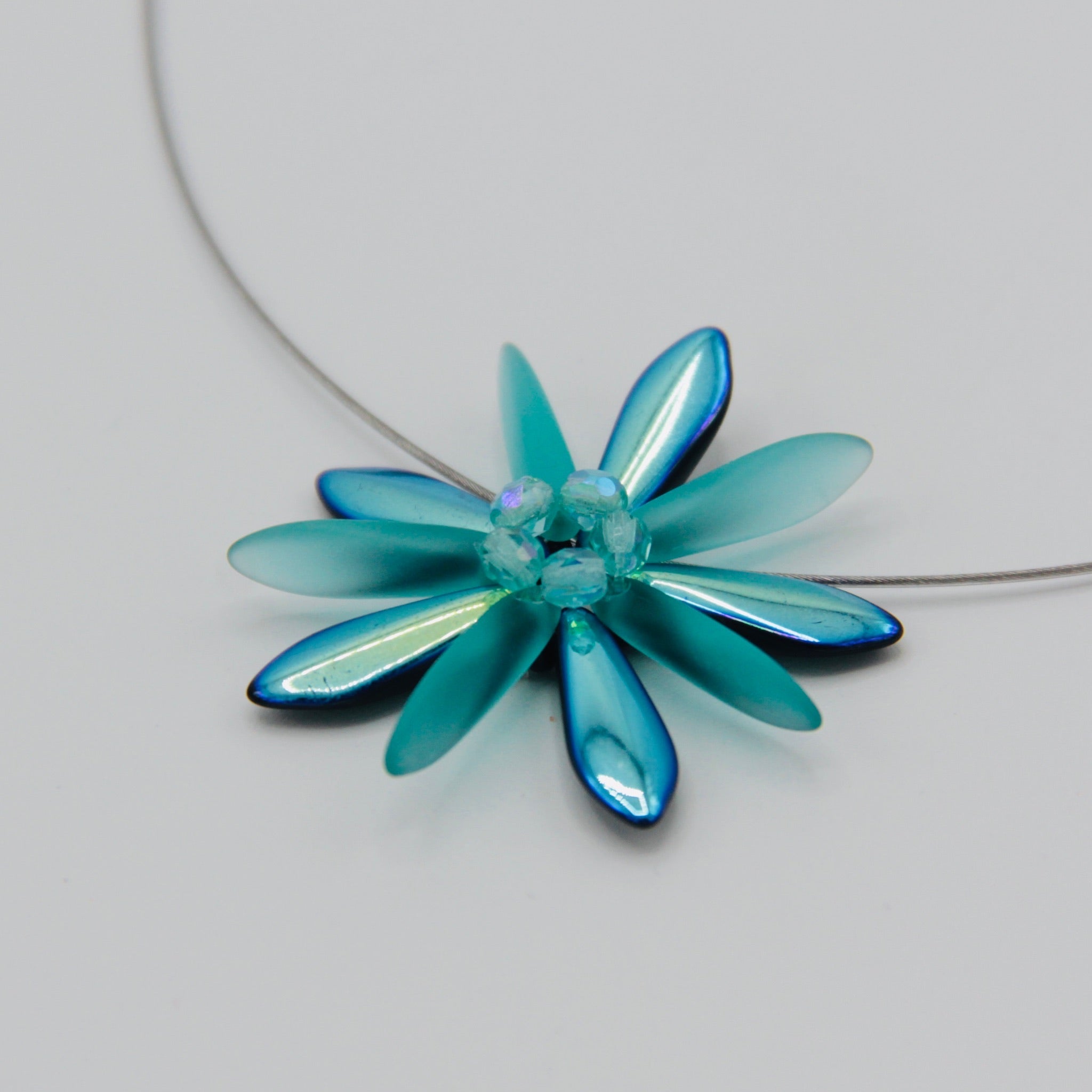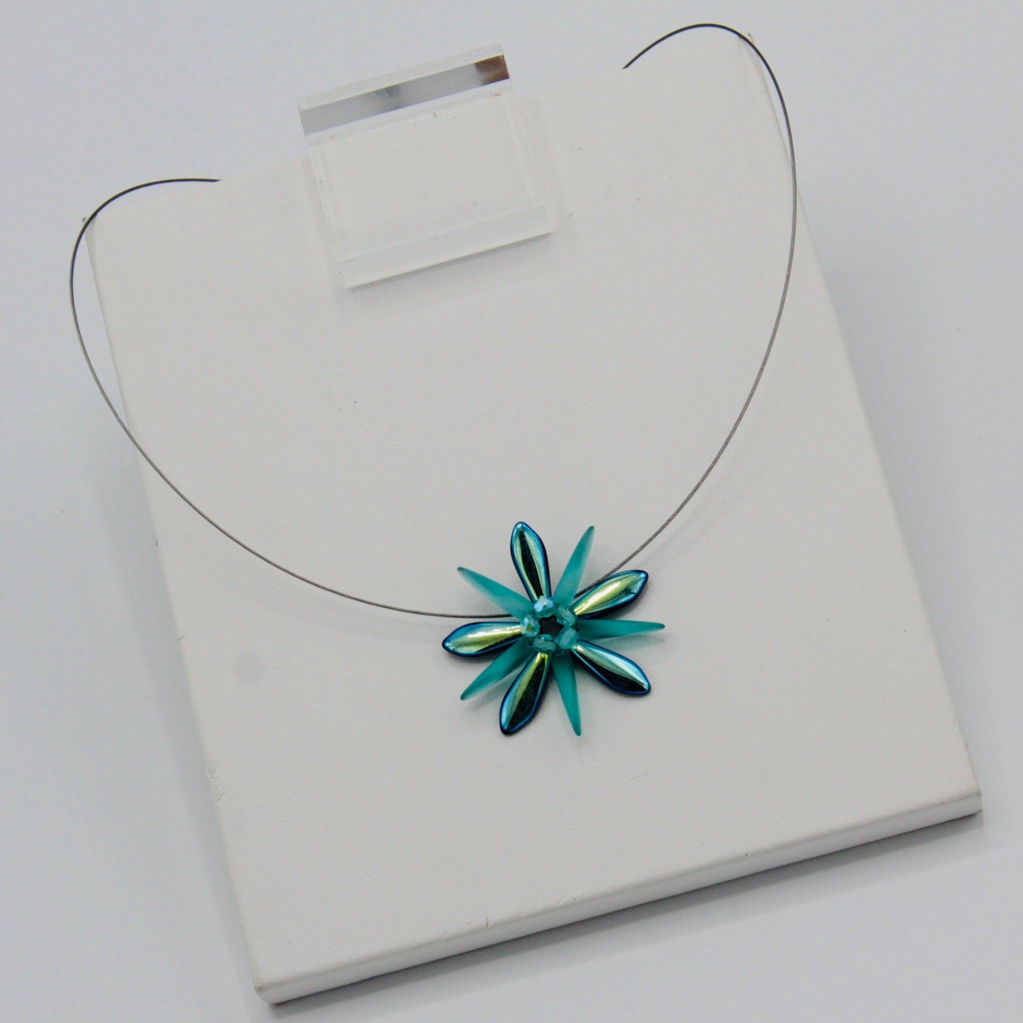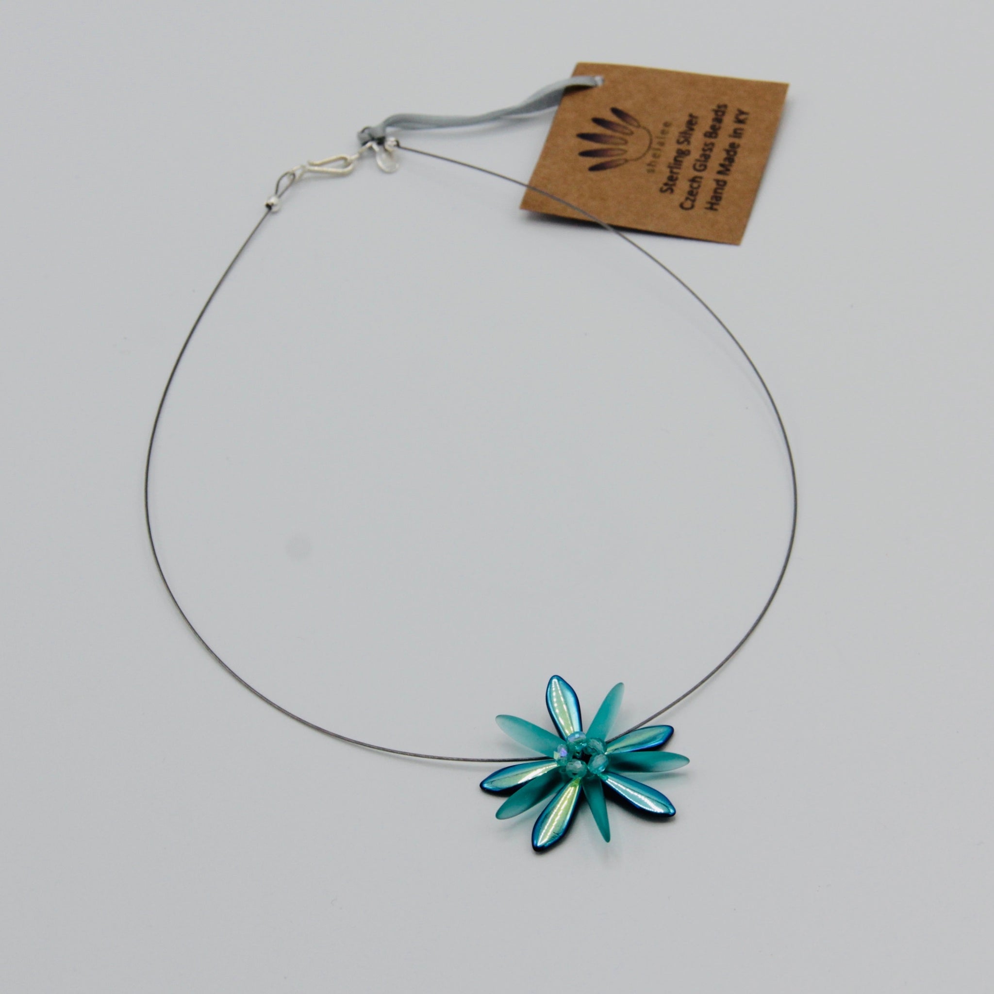 Subtle elegance of the Elizabeth Necklace shines no matter where you take it.  And this one really shines with its turquoise color in matte and shiny finish! Featuring a single Shelalee signature beaded flower on a stainless steel 19-strand wire with Sterling Silver closure, it's a perfect necklace for any occasion.