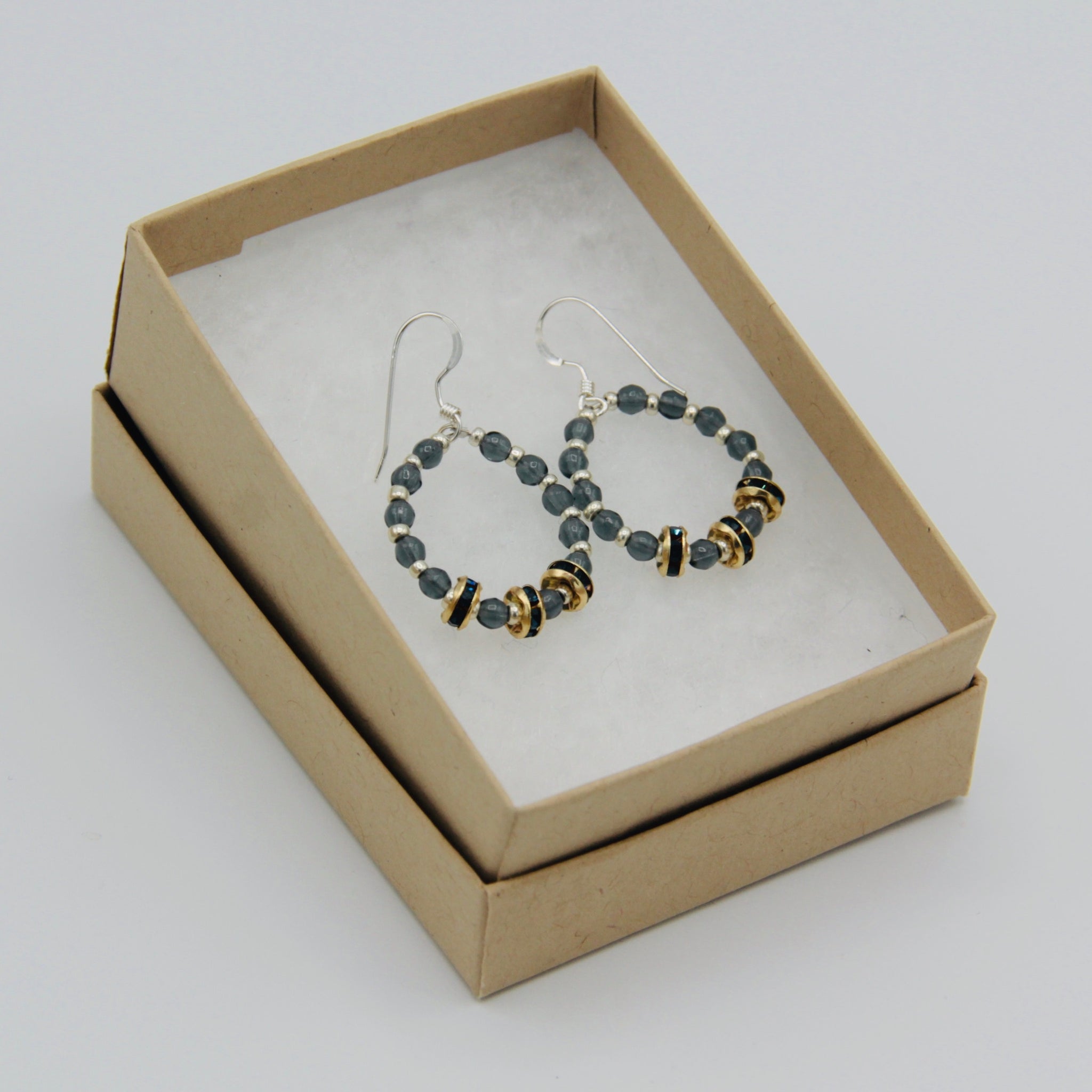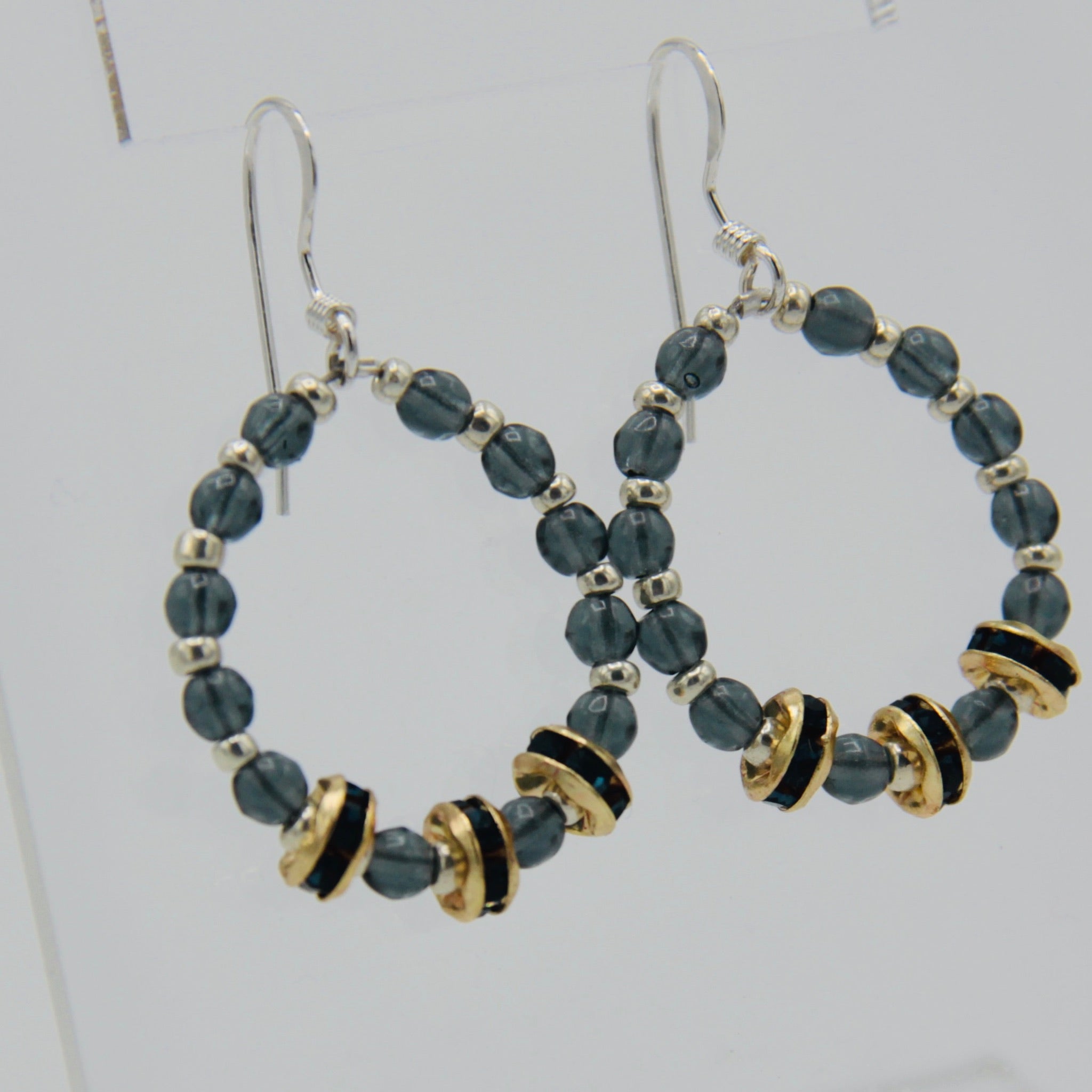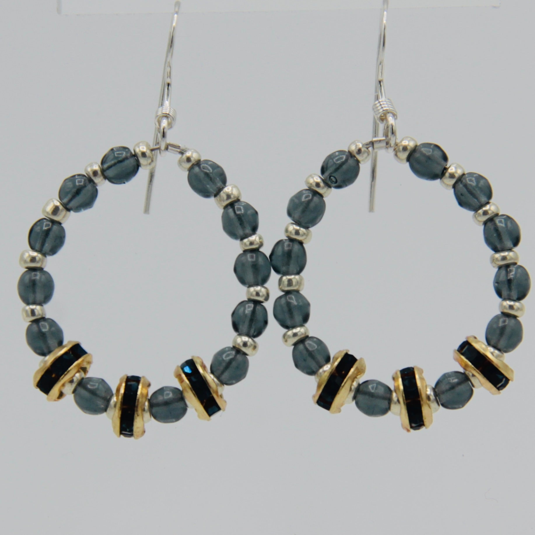 Enjoy the delicate beauty of Rondelle beads with cut glass crystals! These Hannah hoop earrings in Smokey Blue are about 1.5 inches long. Festive and elegant, the Hannah hoop earrings can be worn in combination with any necklace with blue tones.
