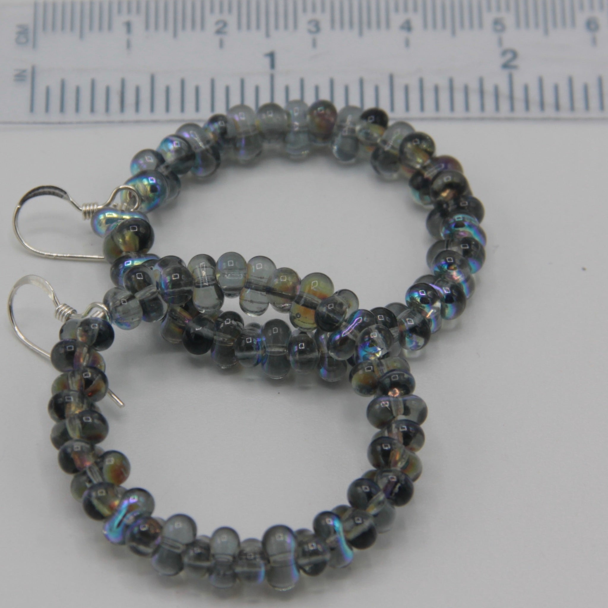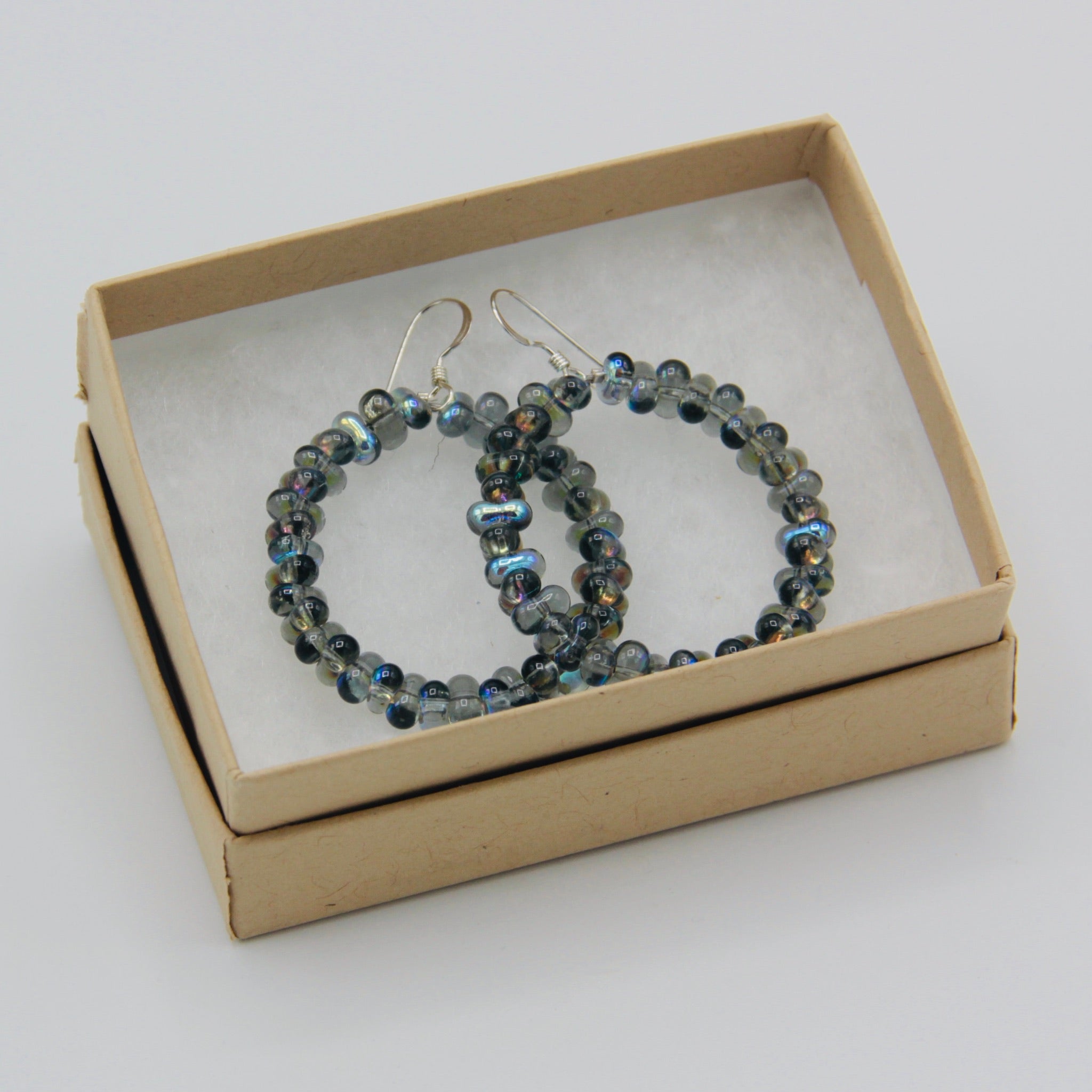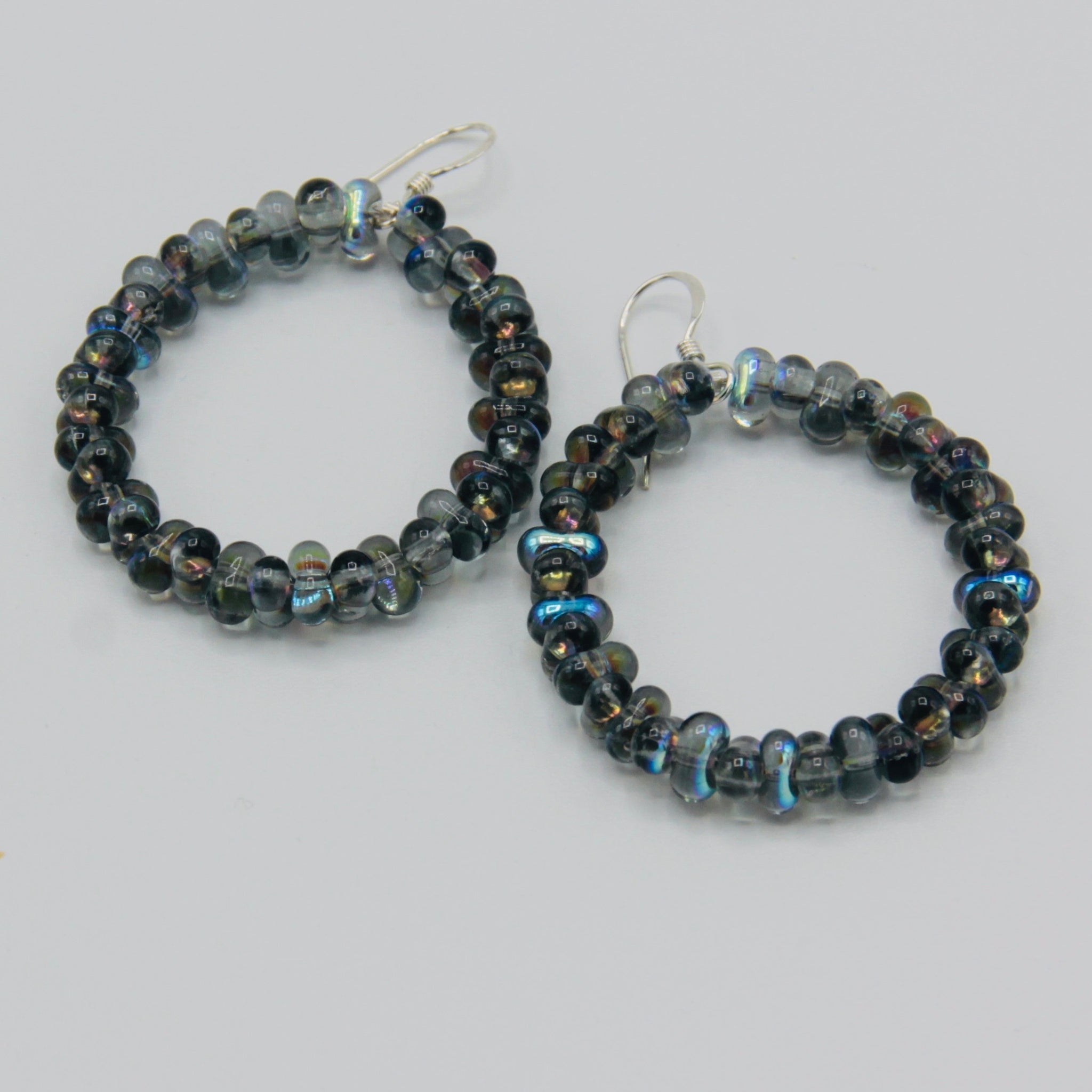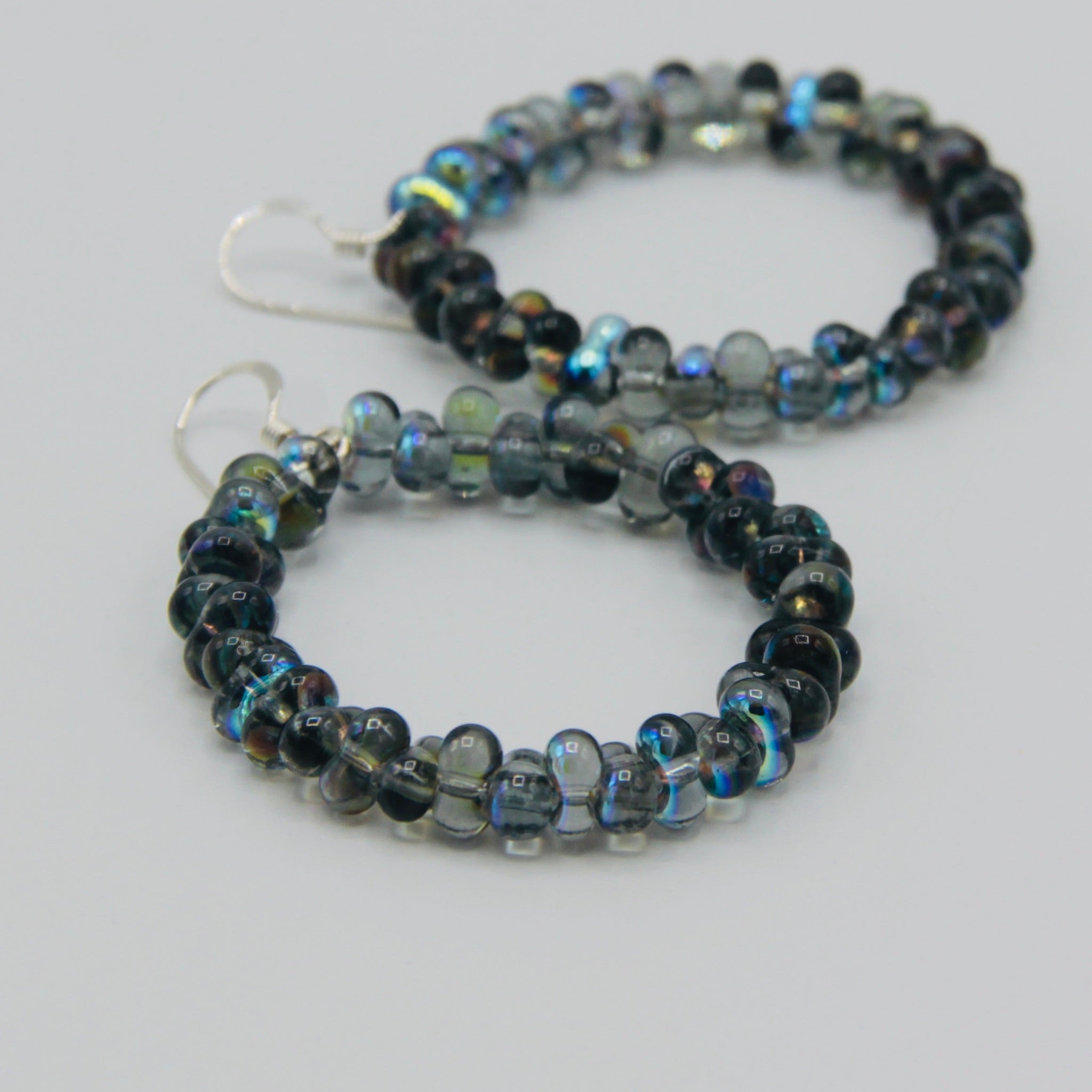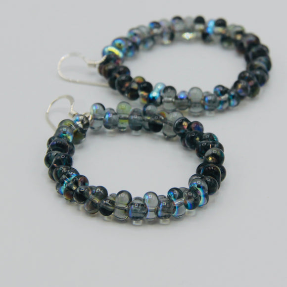 With the lightweight design and shiny gray color, these Hannah hoop earrings are perfect to add fun pop color to your outfit. Featuring Czech glass beads in gray with Aurora Borealis partial finish, these hoop earring will get noticed. Attention grabbing and refined, the Hannah hoop earrings are fun wearing in combination with any ring or sporting all on its own.