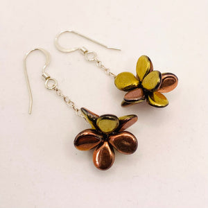 If you are looking for the fun dangling earrings with a textured finish, you will love Heather Earrings.  Featuring Czech glass beads hugged together into a cluster, these Heather Earrings are in shiny metallic gold and bronze.