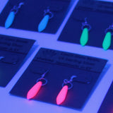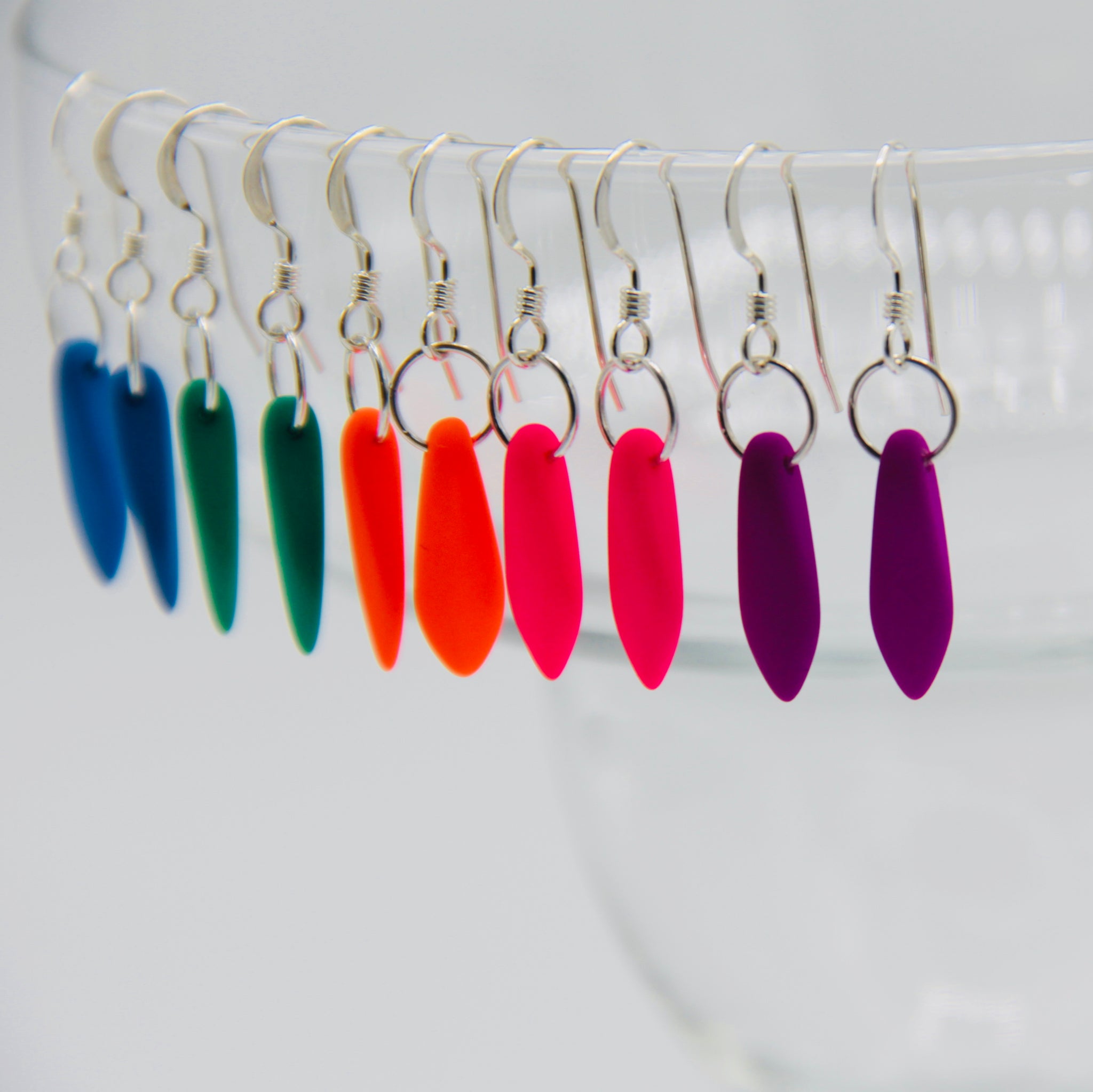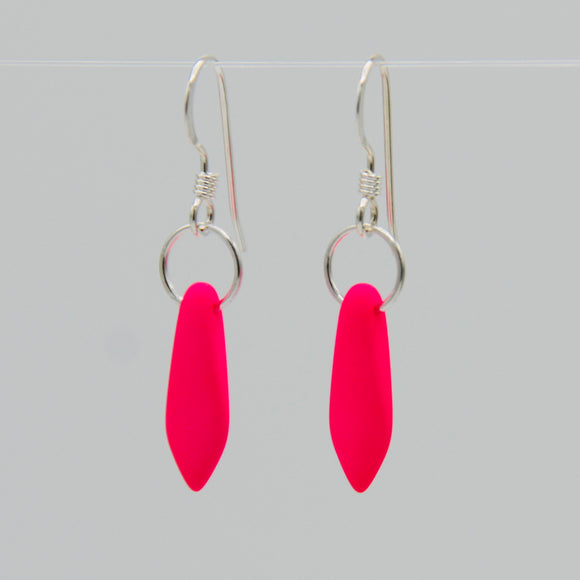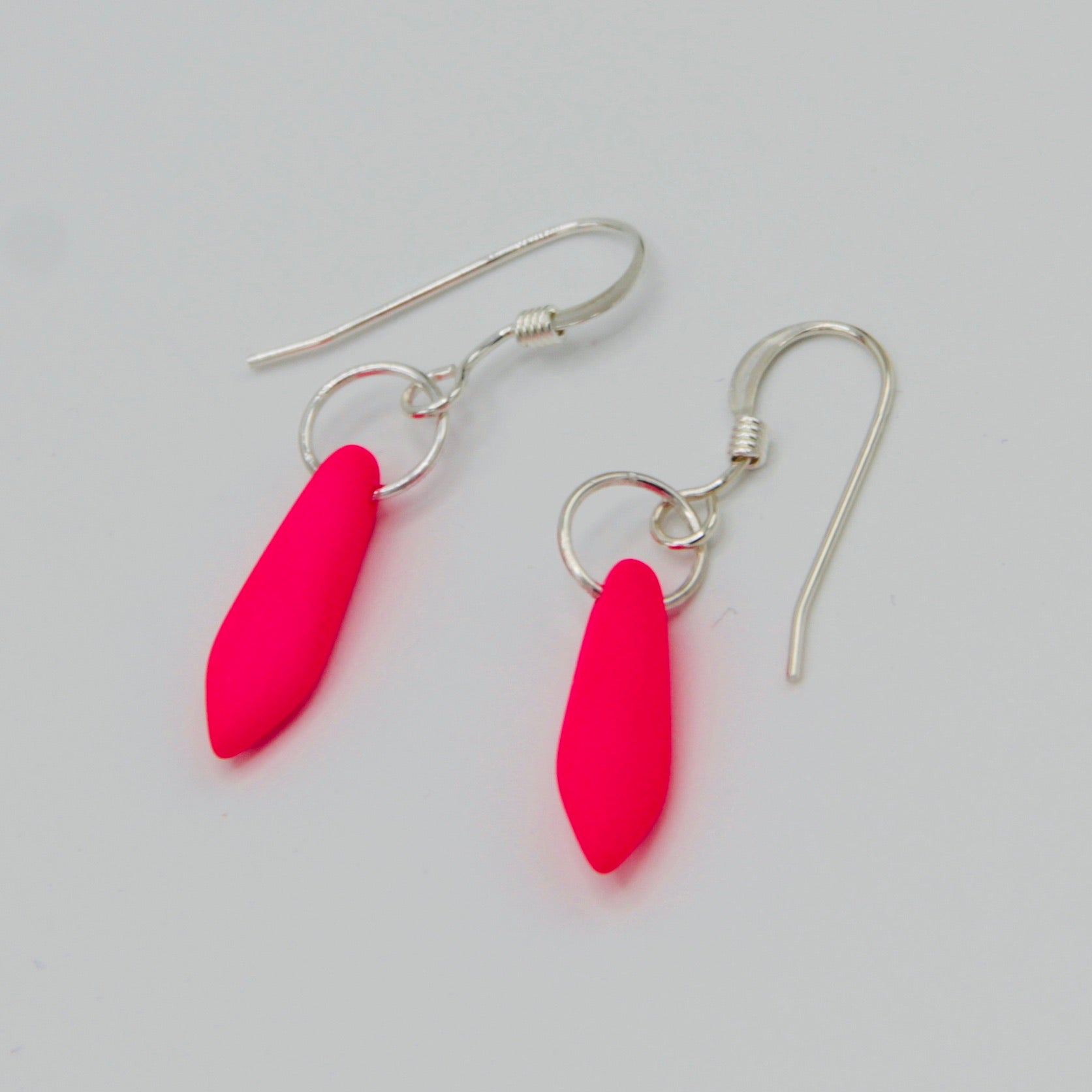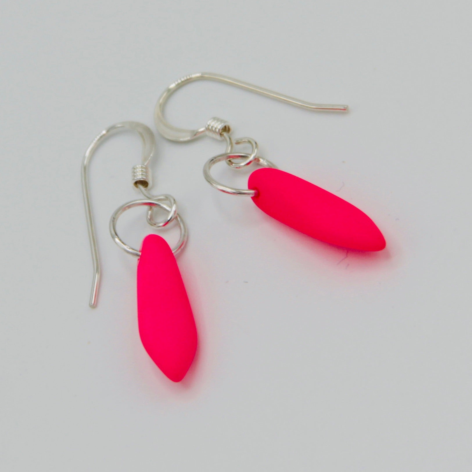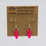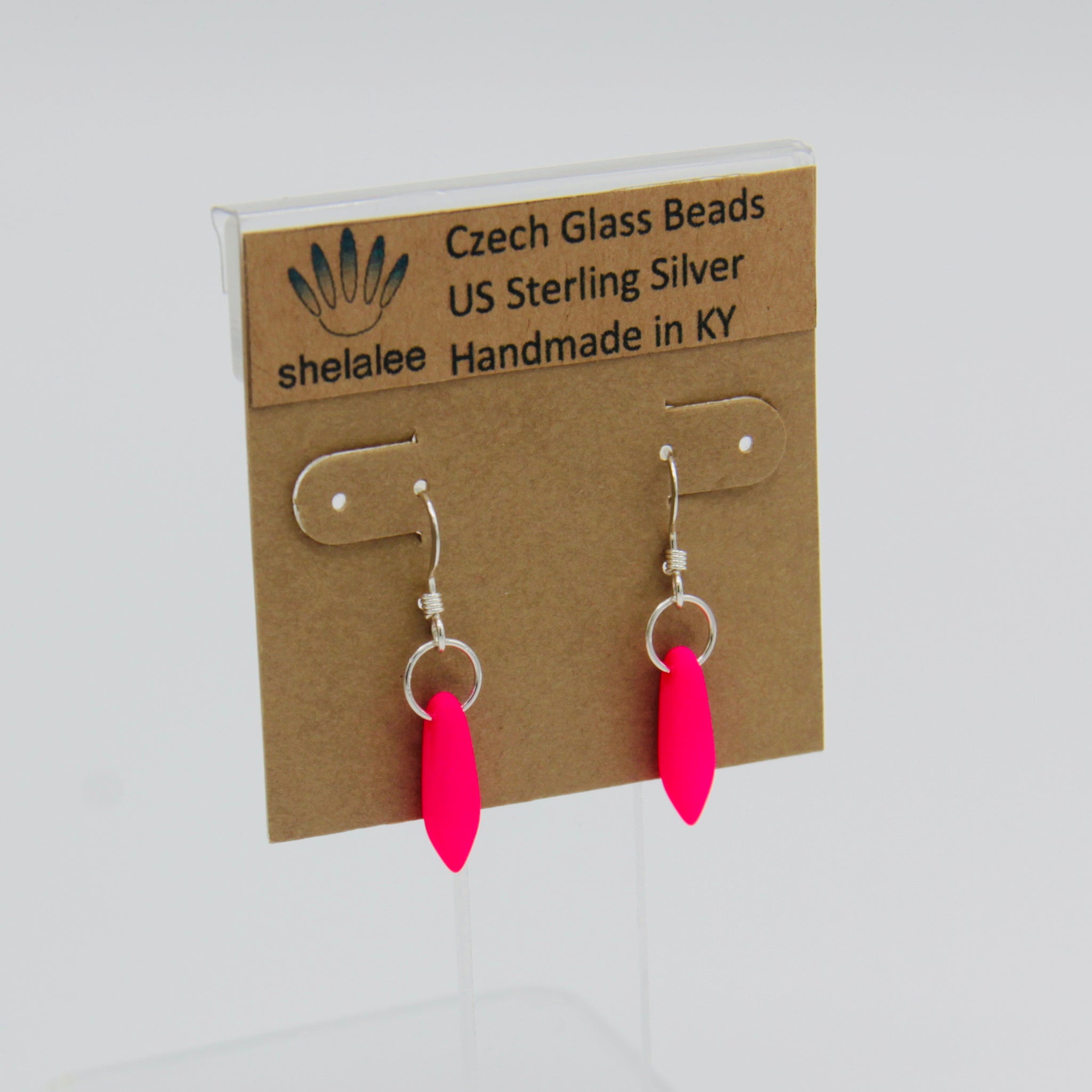 The Jane Earrings represent a simple elegant everyday style. Featuring Czech glass beads and Sterling Silver, the Jane Earring in neon color will glow under ultraviolet lighting but have lovely matte finish and color in daylight. The photos (except the last one) were taken under regular light.