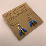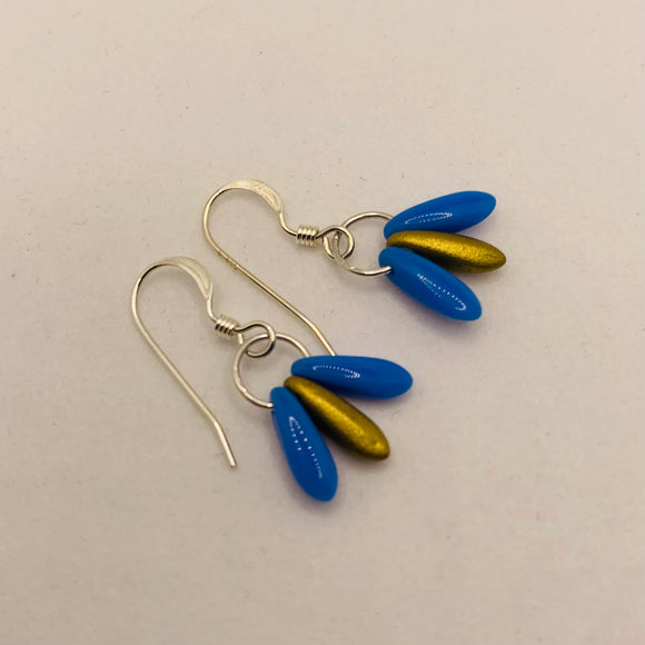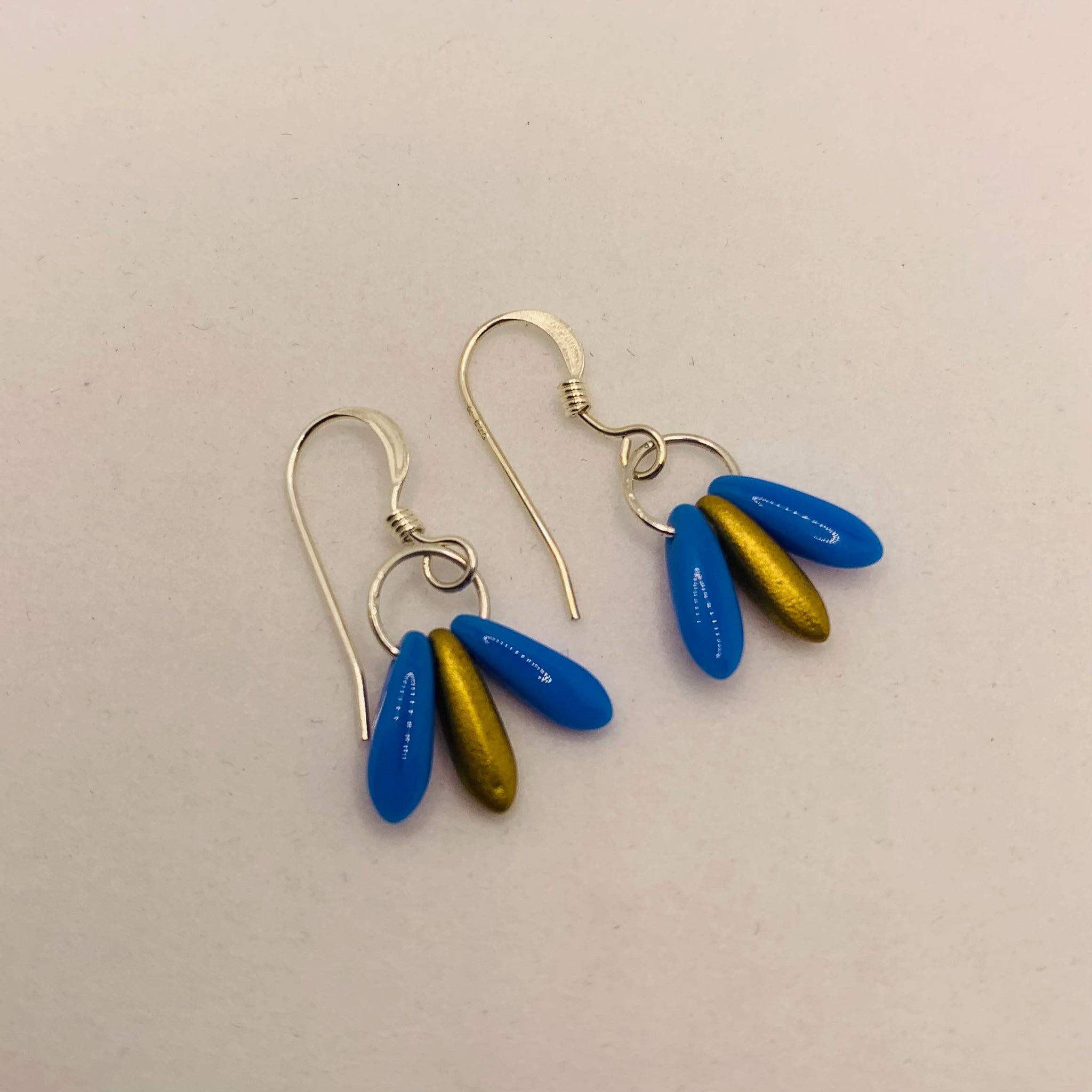 The Janet Earrings represent a simple elegant everyday style. Featuring Czech glass beads and Sterling Silver, these Janet Earring are in bright blue and matte gold color. The Janet earrings are a popular choice for smaller delicate earrings with a dangly flair.