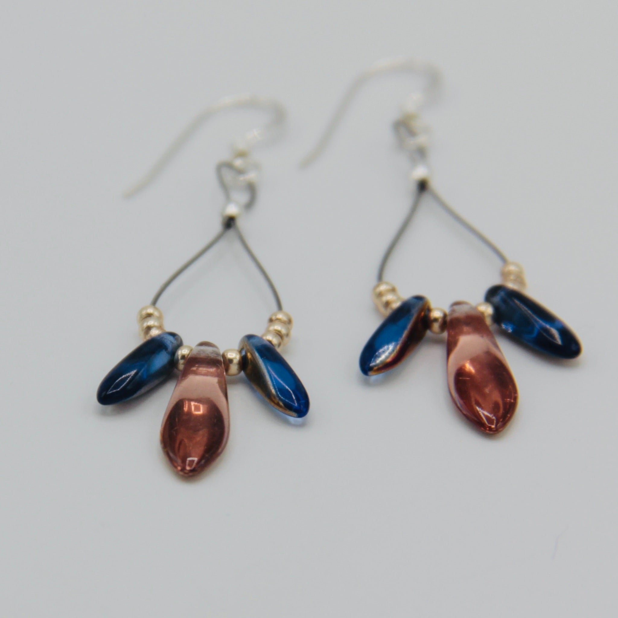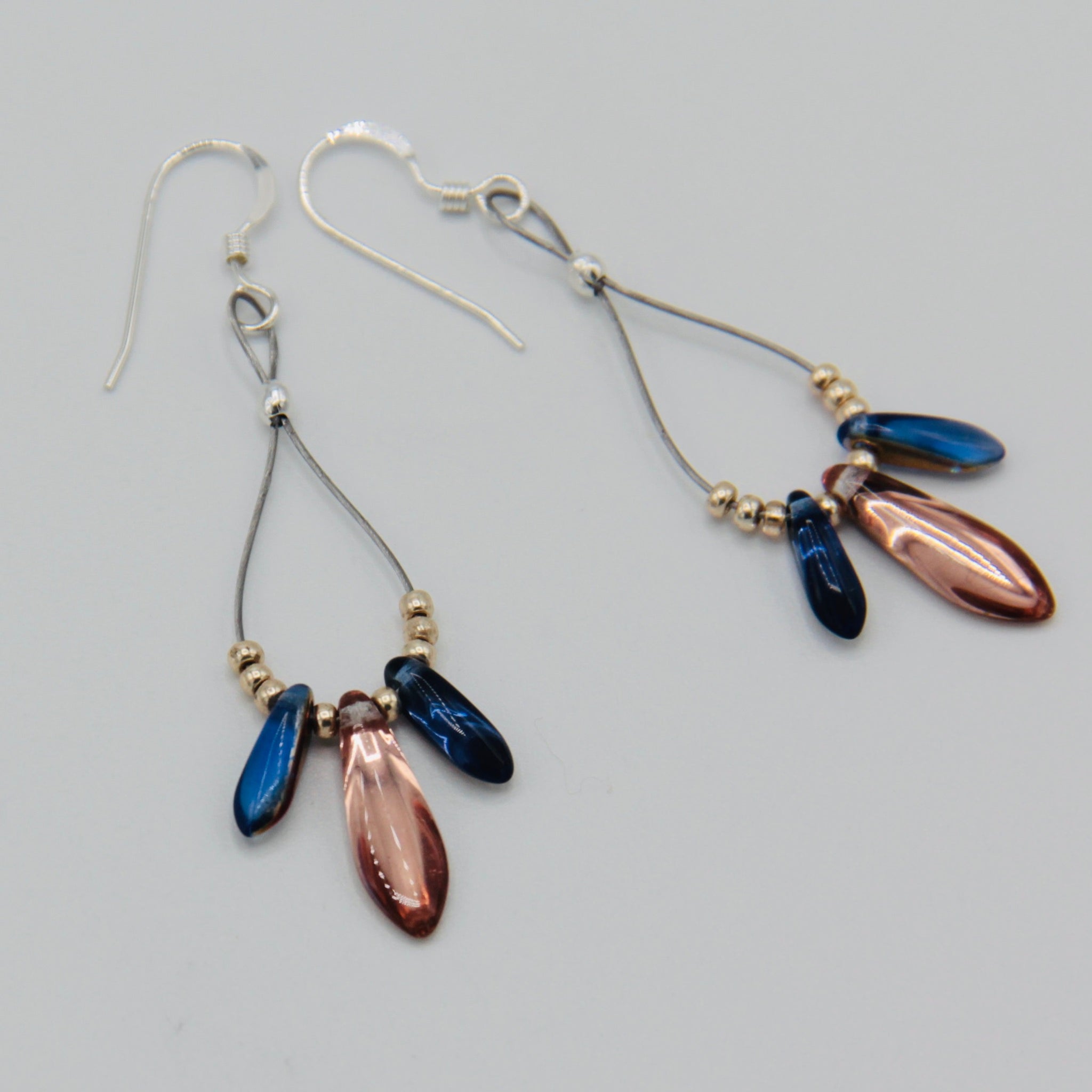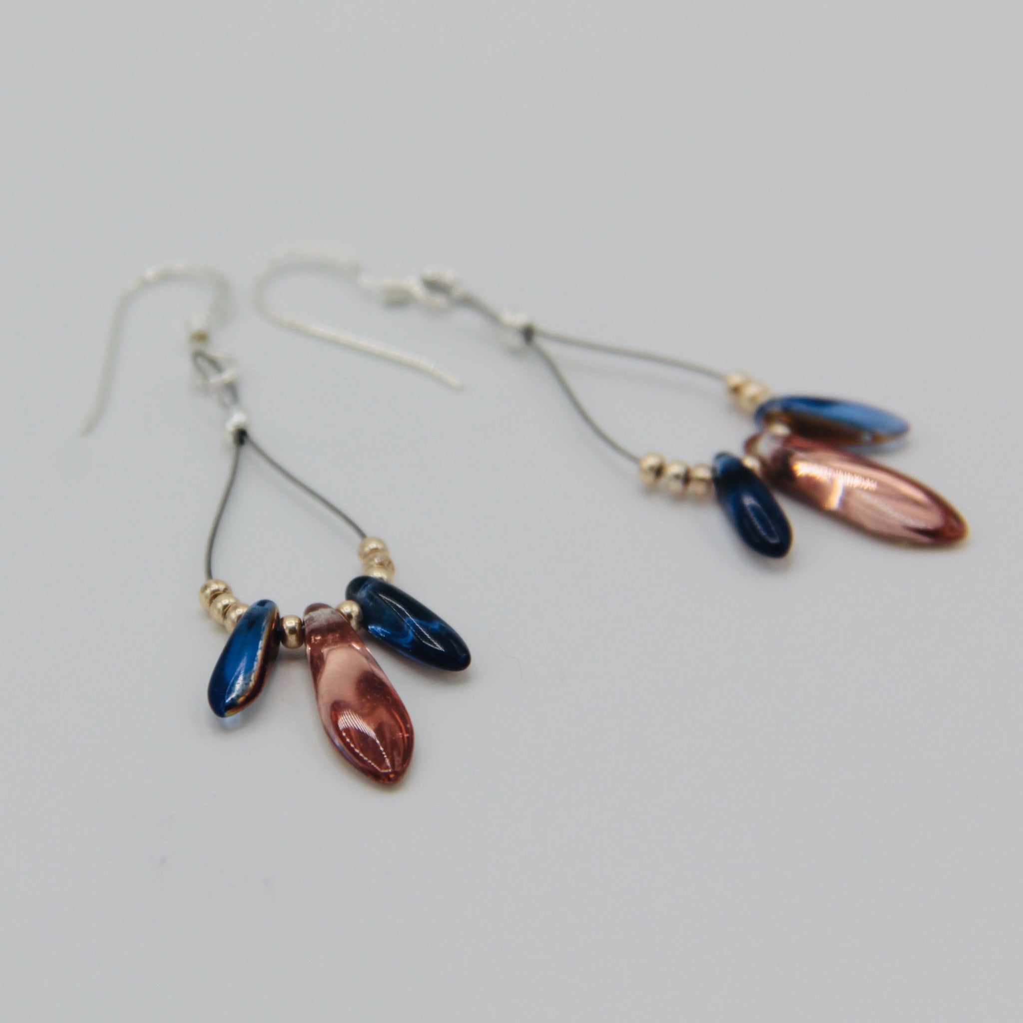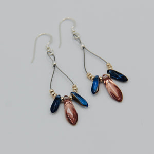 The Janet Maxi Earrings represent a simple elegance in dangling style! Featuring Czech glass beads and Sterling Silver, these Janet Earring are combination of shiny rose Gold bead and Smokey blue smaller beads. The Janet Maxi earrings are as lightweight as their delicate shorter cousins, but make more of the statement with their 2-inch length and larger beads. They can be paired with Elizabeth, Anna or Rebecca necklaces.