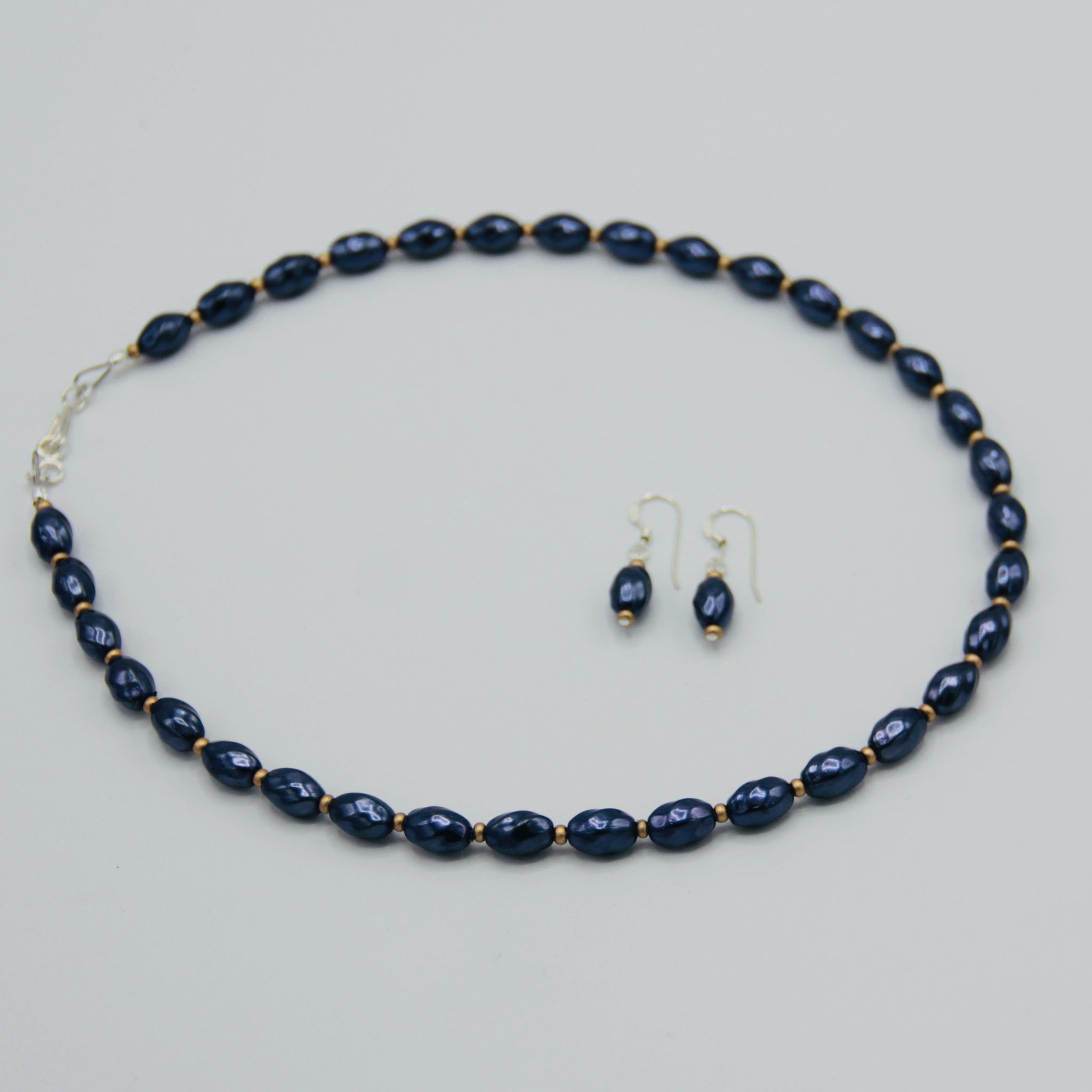 Experience the refined simplicity of the Nora necklace with a modern twist. Crafted with Czech glass beads and a Sterling Silver closure, this necklace features a soft, warm pearl finish accented by delicate navy blue beads. Elevate your look with its timeless elegance, perfect for any occasion. Pair it with our Penelope earrings for a coordinated ensemble. Choose your preferred length at checkout for a personalized fit.