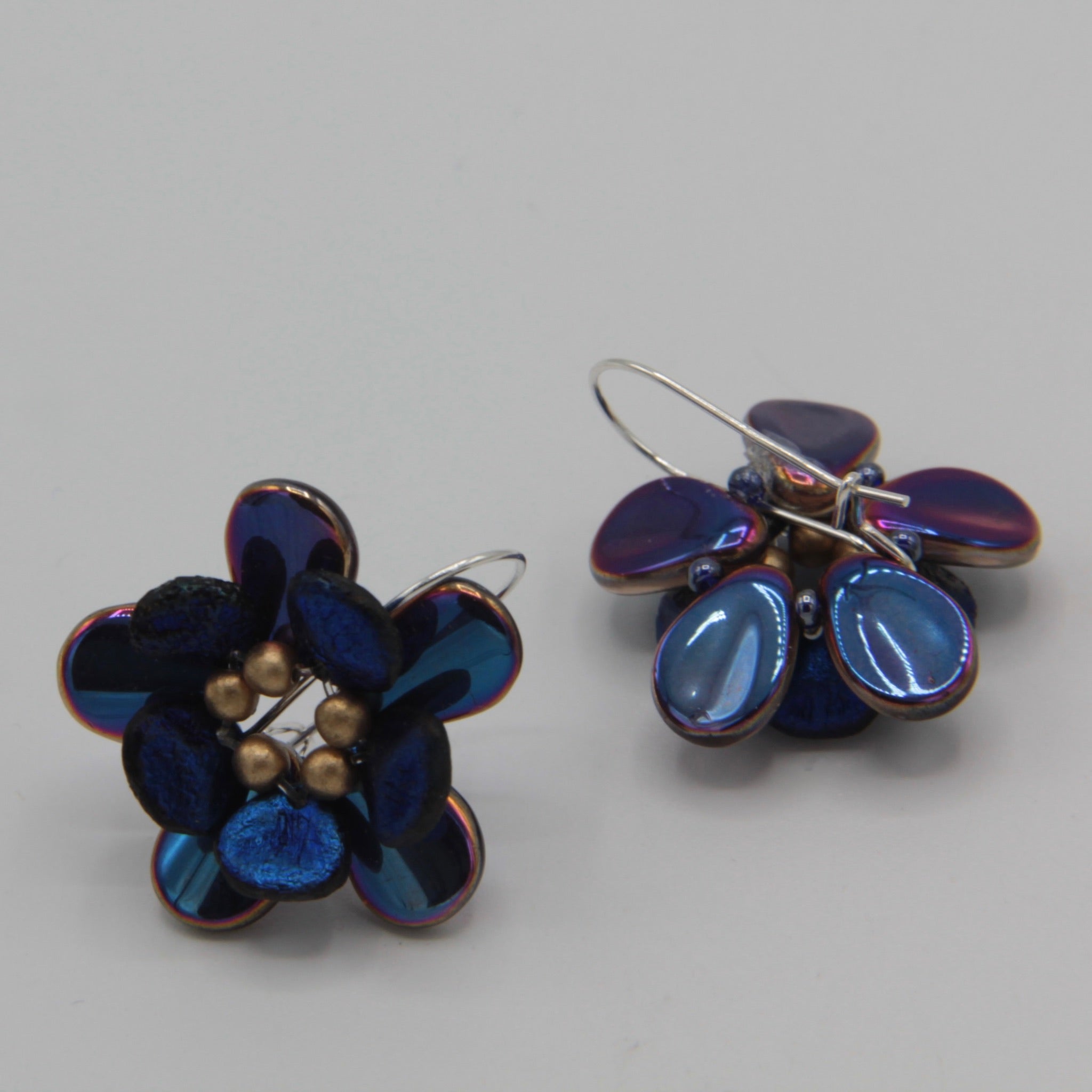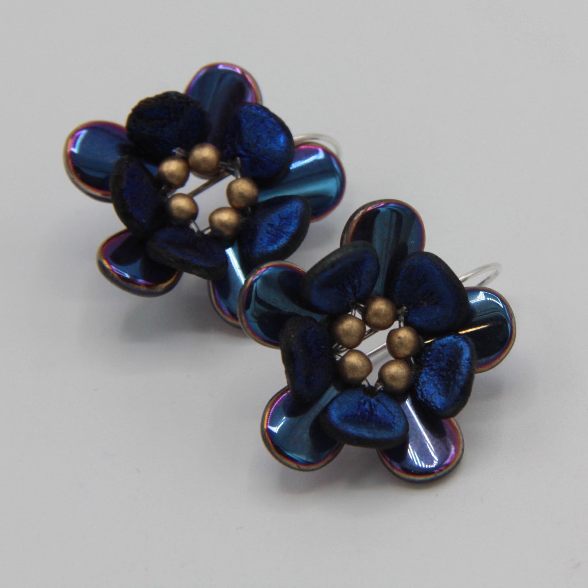 Discover the perfect accessory for every occasion with our Poppy earrings. These exquisite earrings, meticulously crafted with Czech glass beads and sterling silver, radiate timeless elegance. With their captivating shiny blue petals and matte gold centers, they’re designed to turn heads and infuse allure into your every step. Complete your look with the matching Andrea Triple Flower necklace, perfectly designed to complement these stunning earrings. Elevate your style to new heights with this jewelry set.