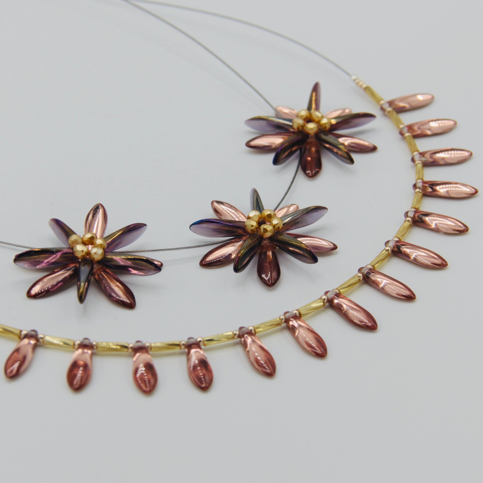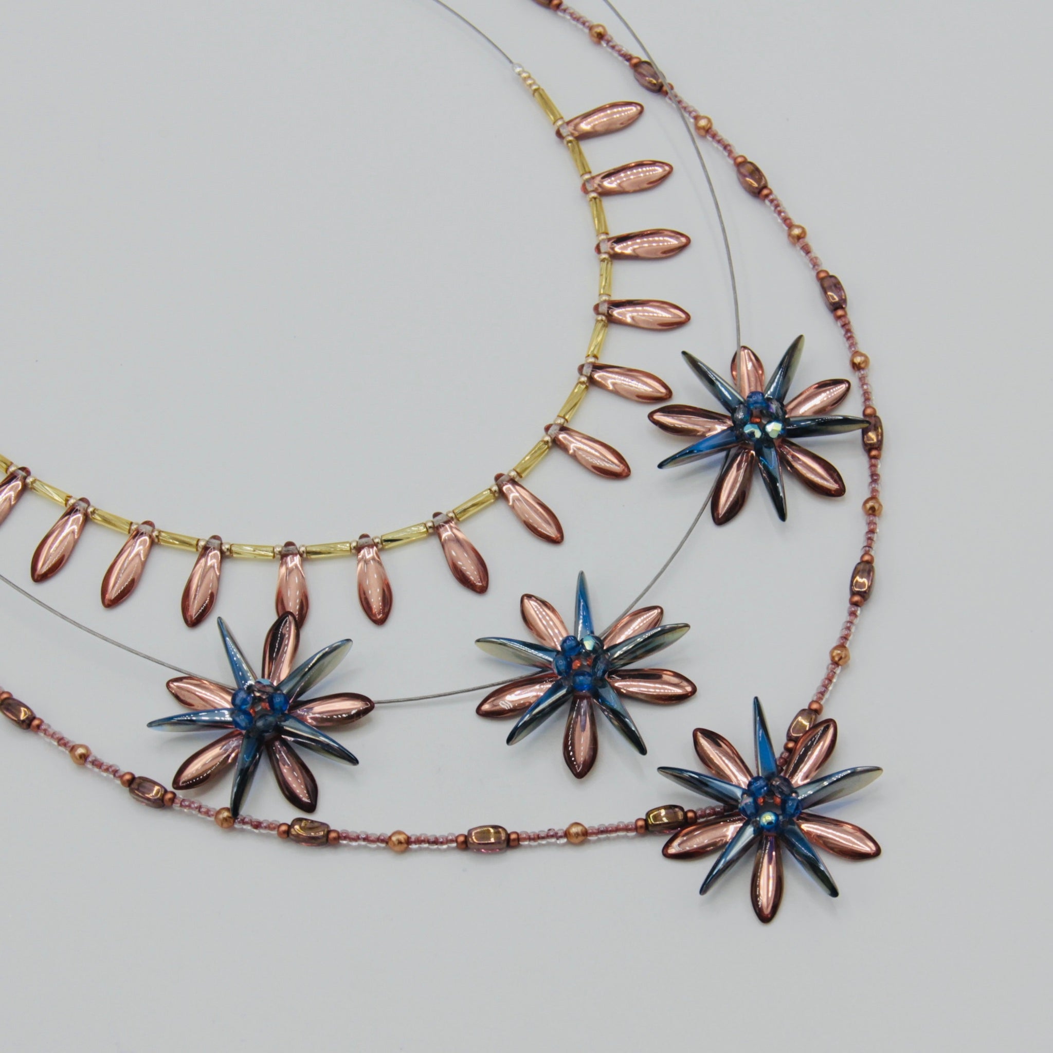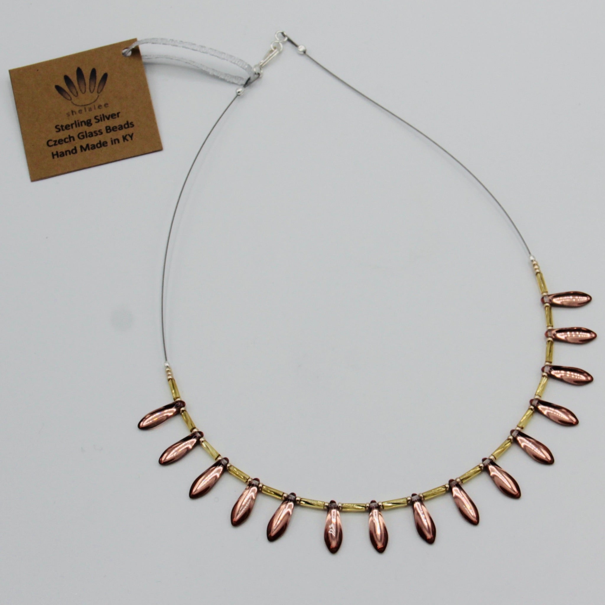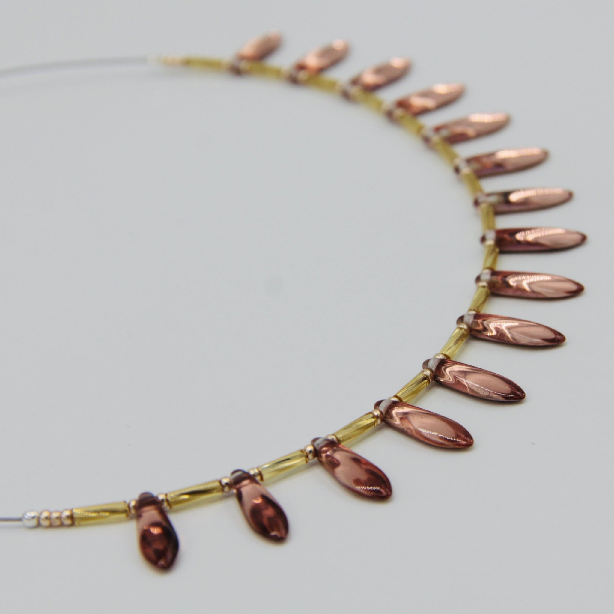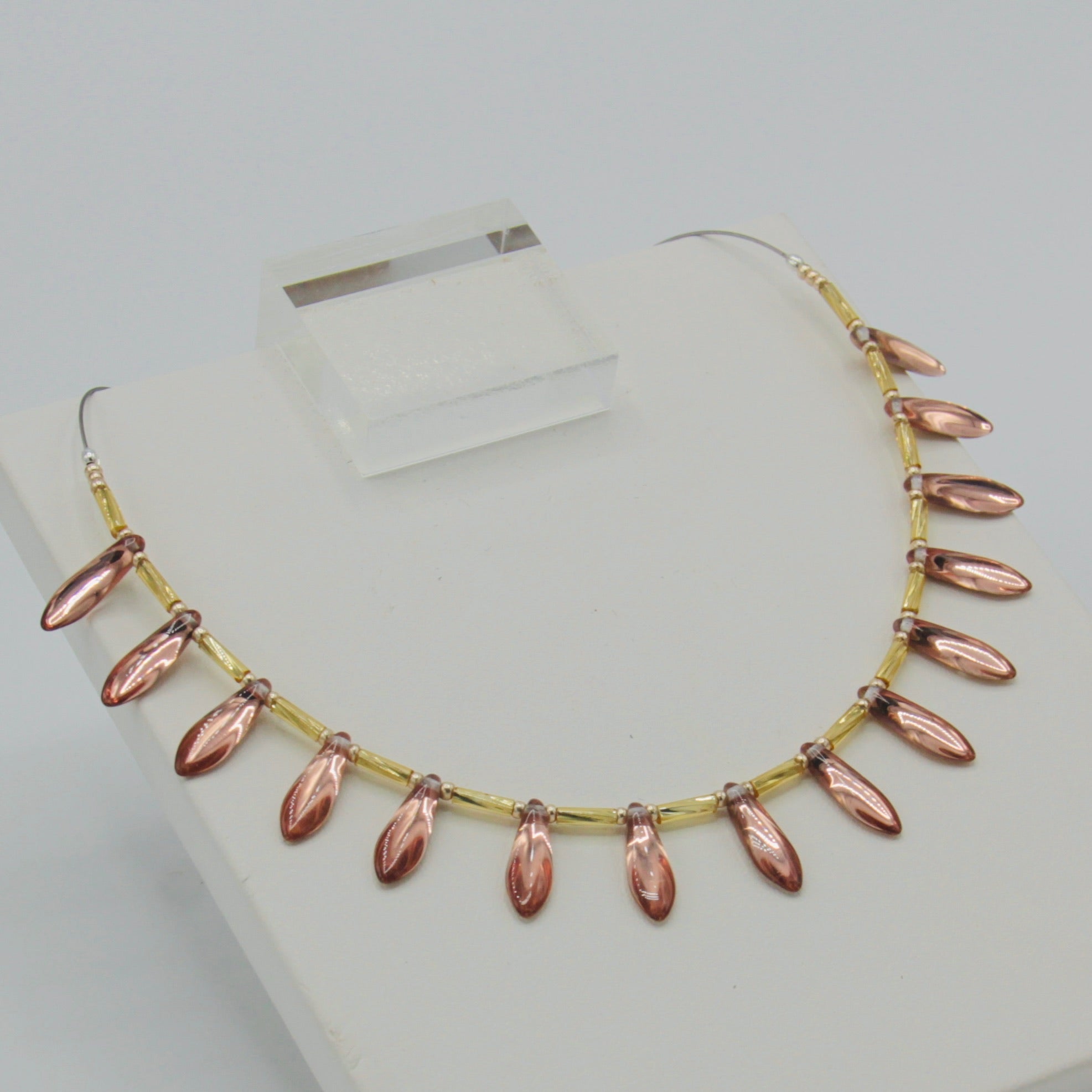 The Rebecca necklace is a simple elegance with a twist. Featuring Czech glass beads and Sterling Silver closure, the necklace mix of Rose Gold and Gold colors. This piece is stunning when worn separately or as a layering piece with complementary Anna and/or Elizabeth necklaces in Rose Gold.