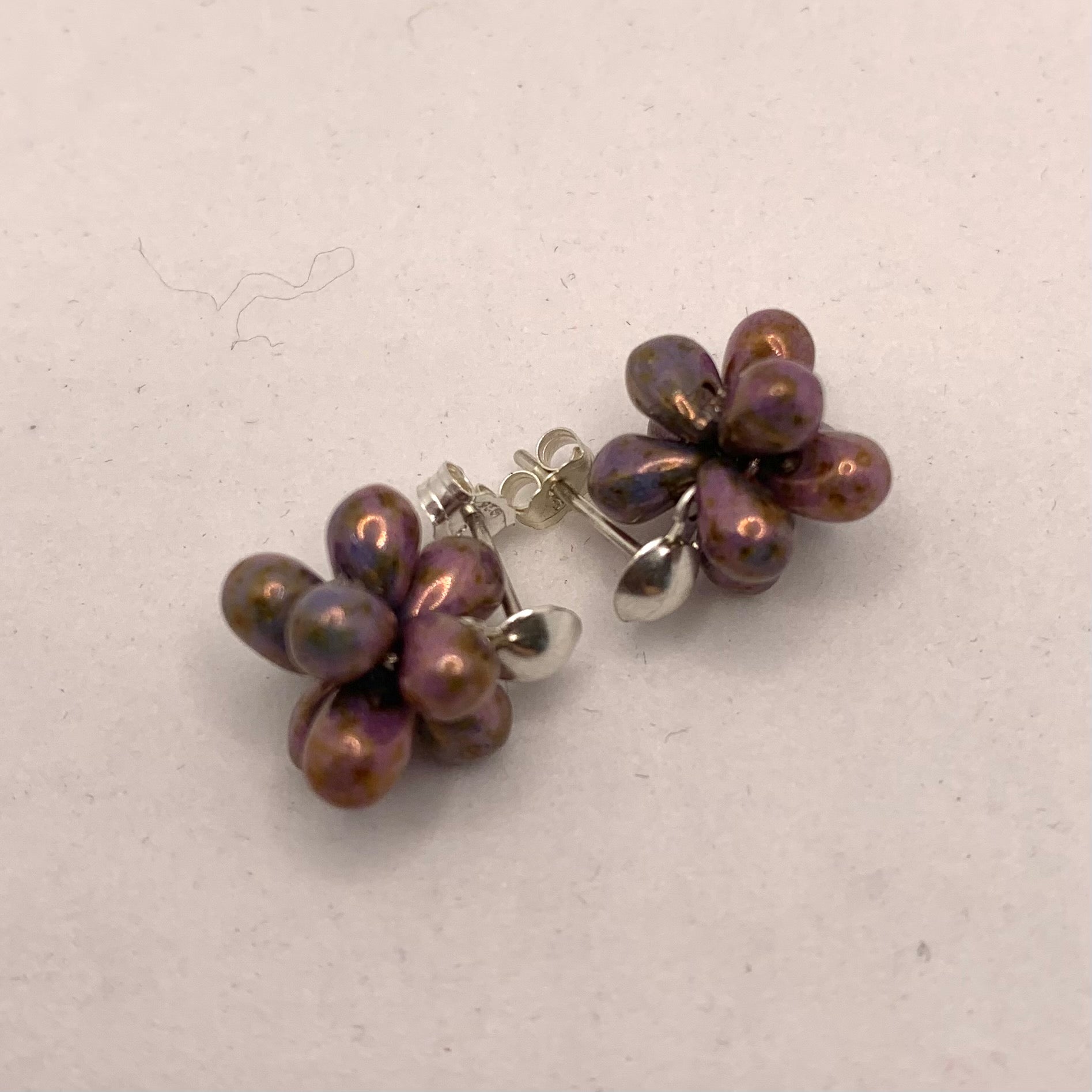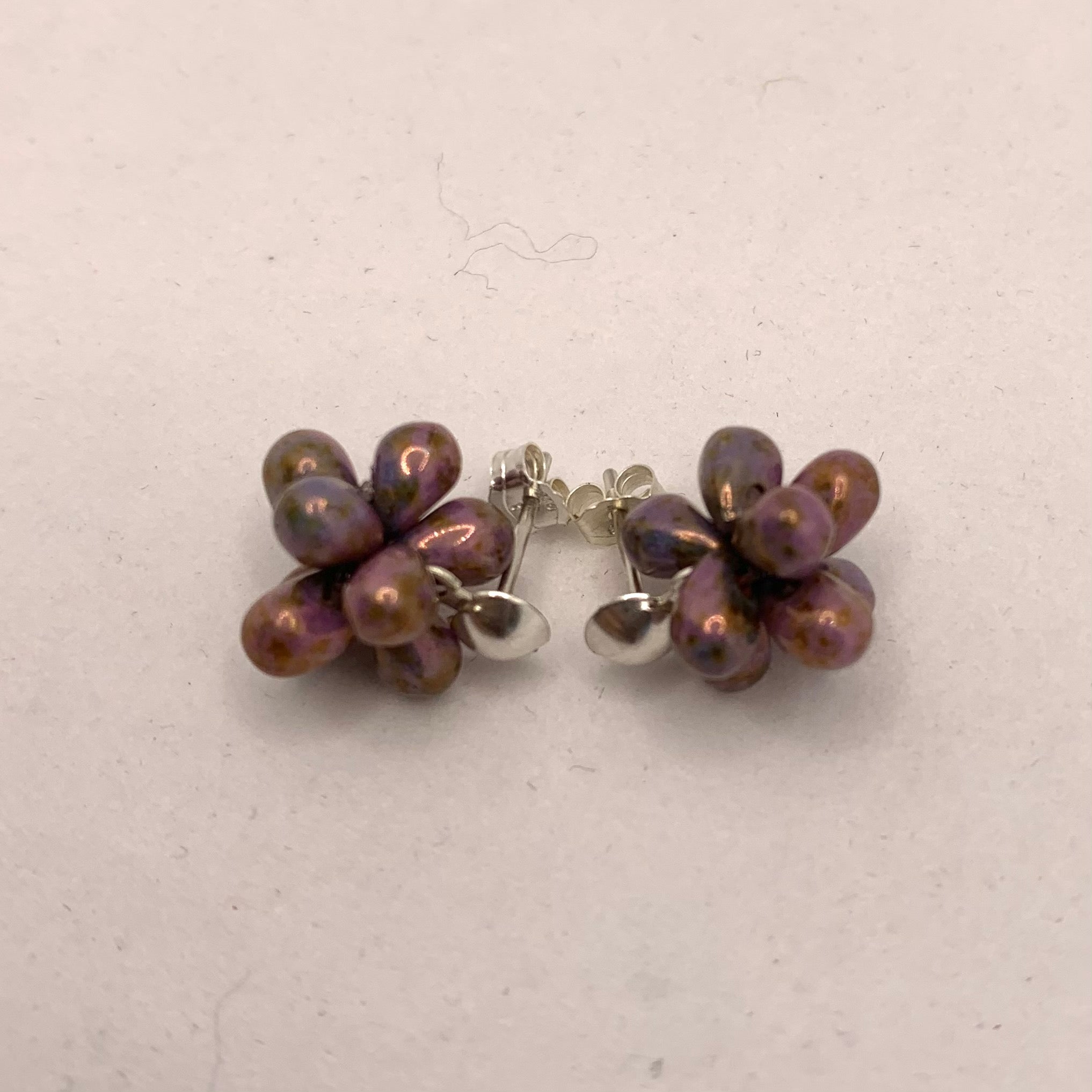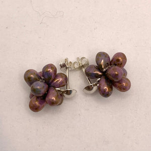 Tami Post Earrings are smaller round beads clusters on Sterling Silver posts presenting a super cute option for those who prefer small and non-dangling earrings. Featuring Czech glass beads and Sterling Silver, the round bead cluster of Tami earrings include shiny brown beads with stone finish. These will be easily the favorite neutral earrings that match many outfits from sporty casual to formal.