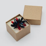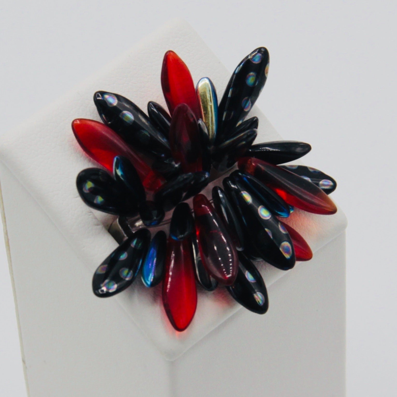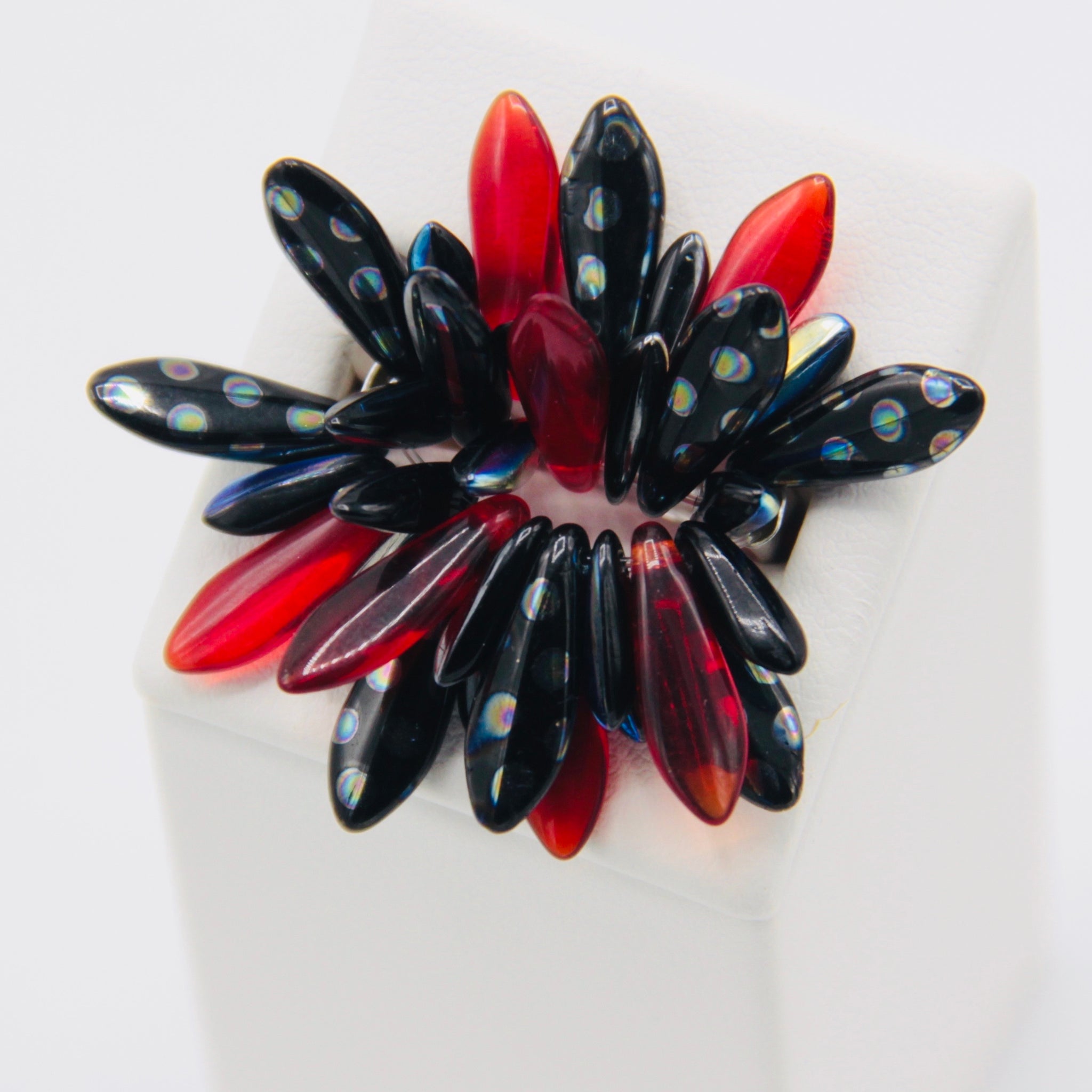 Sophisticated Wendy ring in black and red is meant to be noticed. Czech glass dagger beads are meticulously selected and hugged together with American Sterling Silver components using an elastic cord made in the USA. All of that is nested in a lovable box made of 100% recycled cardboard here in the USA.