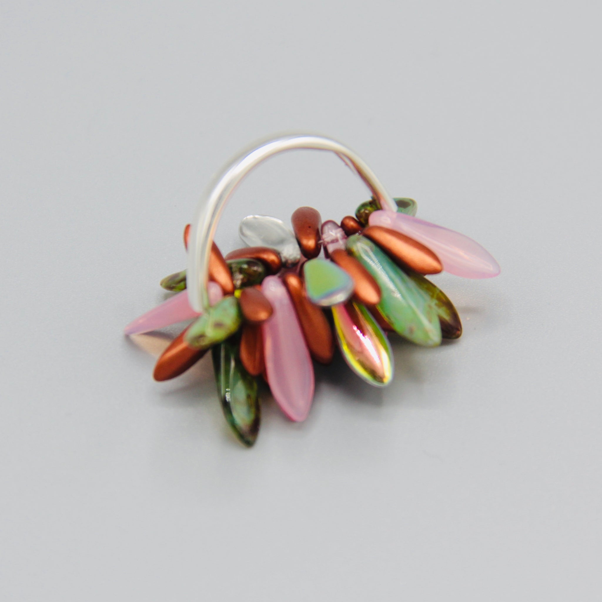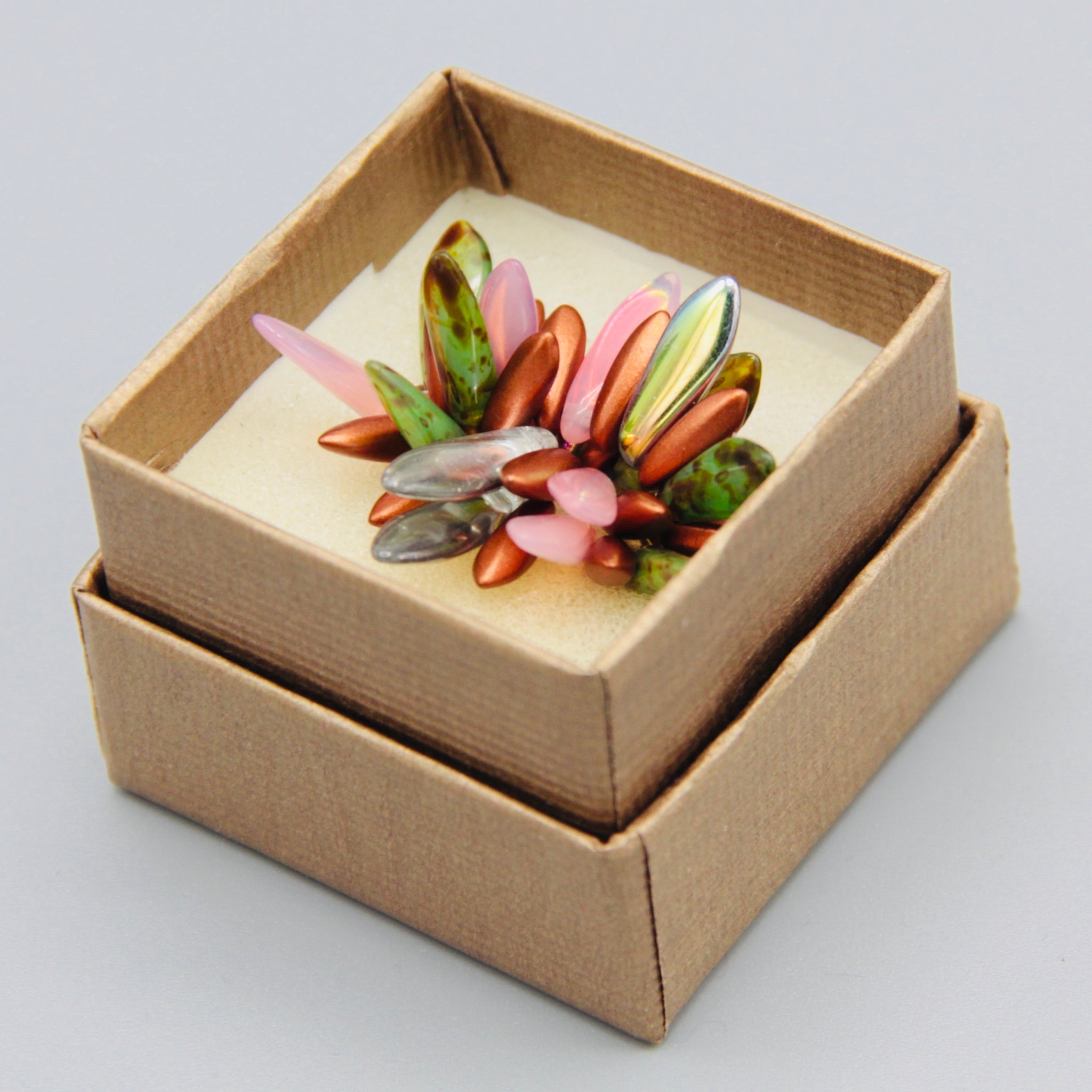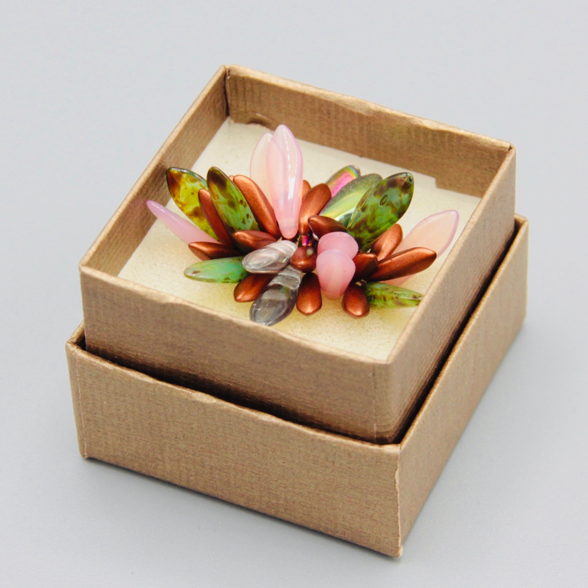 This Wendy ring is a lovely combination of earthy green with shades of pink accentuated with copper tones. It’s truly a versatile and fresh color combo that will draw many compliments. Together with matching Laura earrings, they make a lovely soft set. Czech glass dagger beads are meticulously selected and hugged together with American Sterling Silver components using an elastic cord made in the USA. All of that is nested in a lovable box made of 100% recycled cardboard here in the USA.