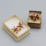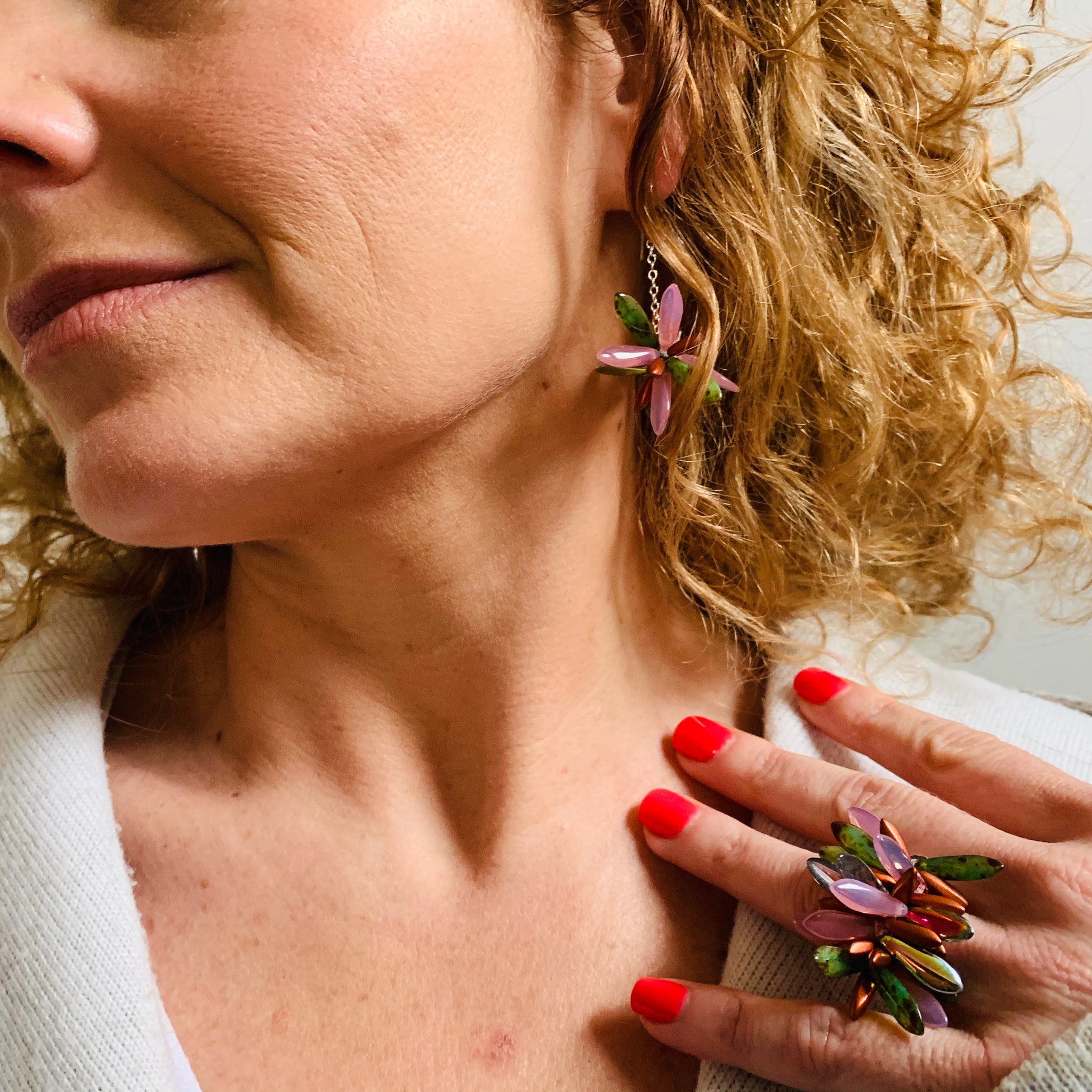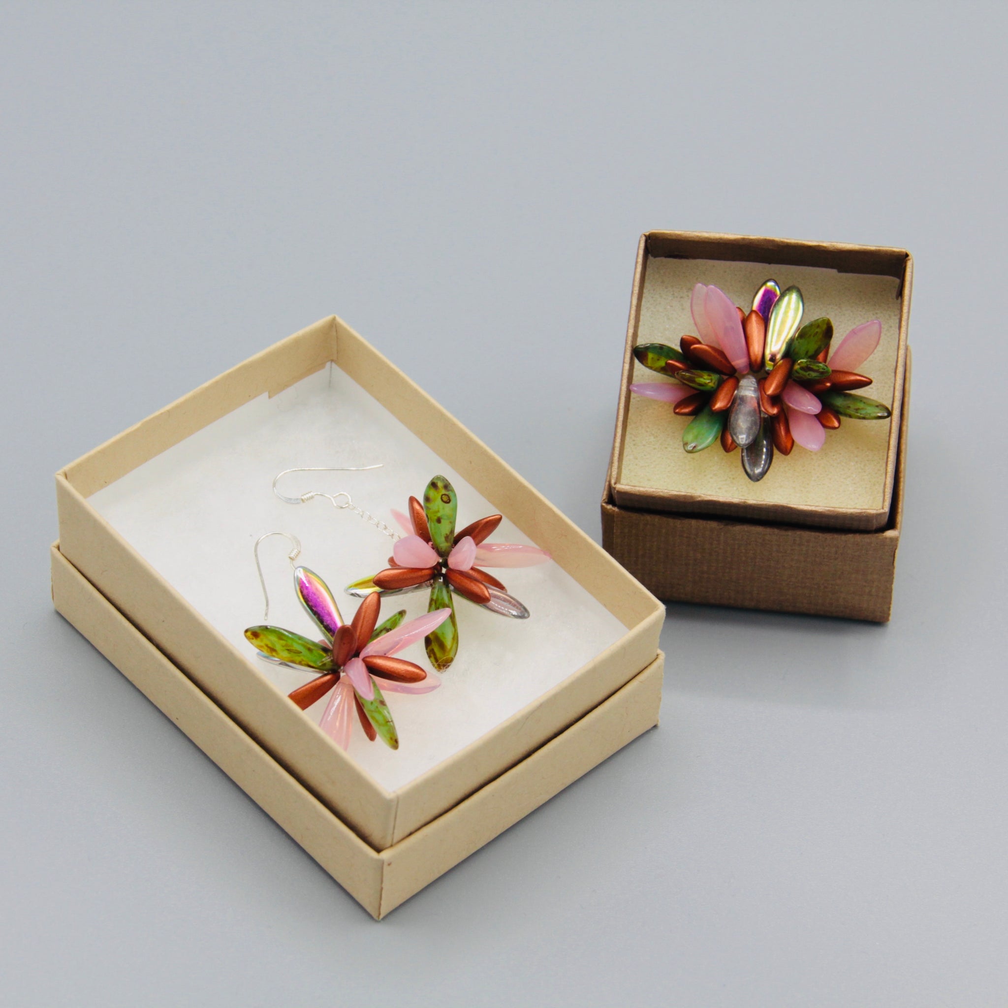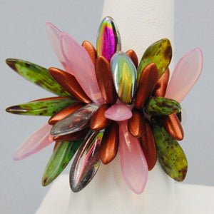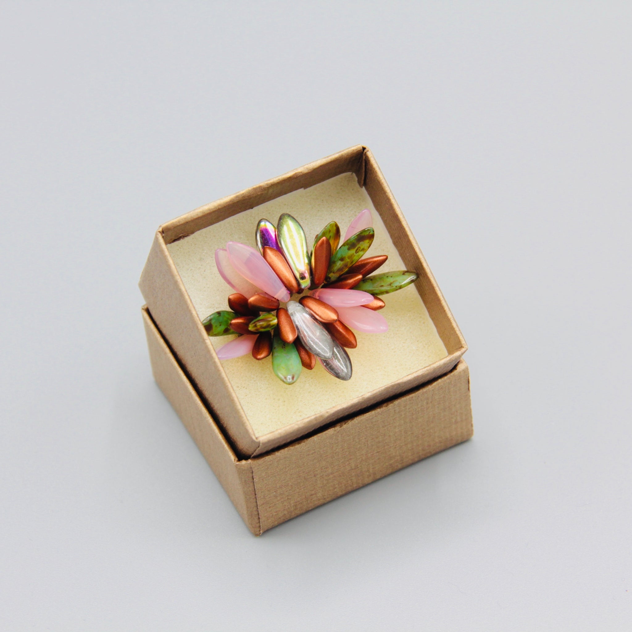 This Wendy ring is a lovely combination of earthy green with shades of pink accentuated with copper tones. It’s truly a versatile and fresh color combo that will draw many compliments. Together with matching Laura earrings, they make a lovely soft set. Czech glass dagger beads are meticulously selected and hugged together with American Sterling Silver components using an elastic cord made in the USA. All of that is nested in a lovable box made of 100% recycled cardboard here in the USA.