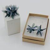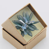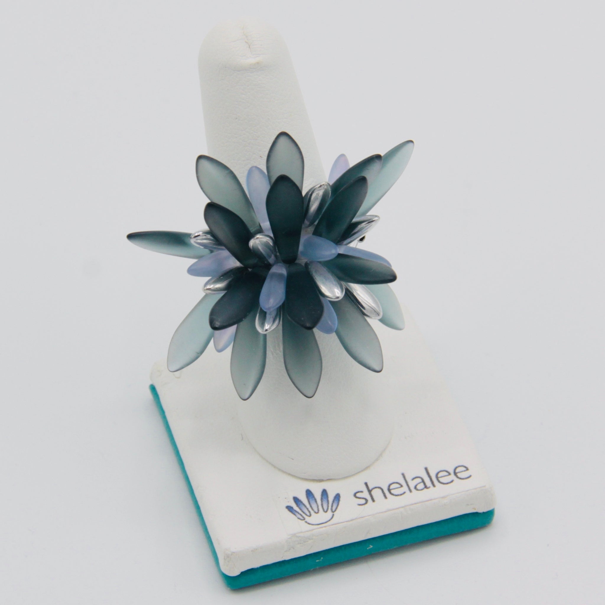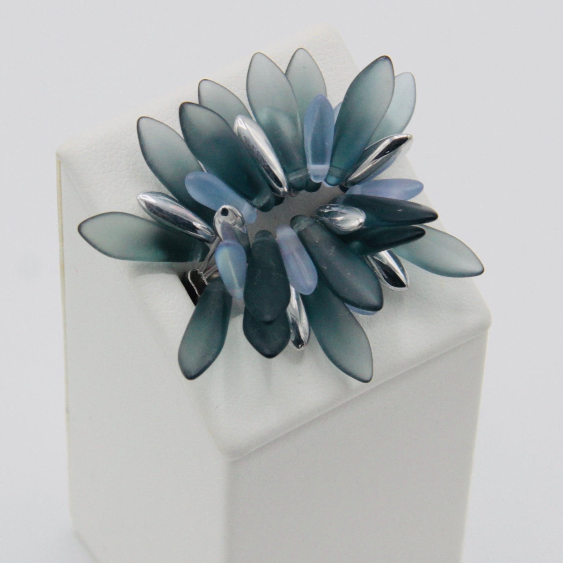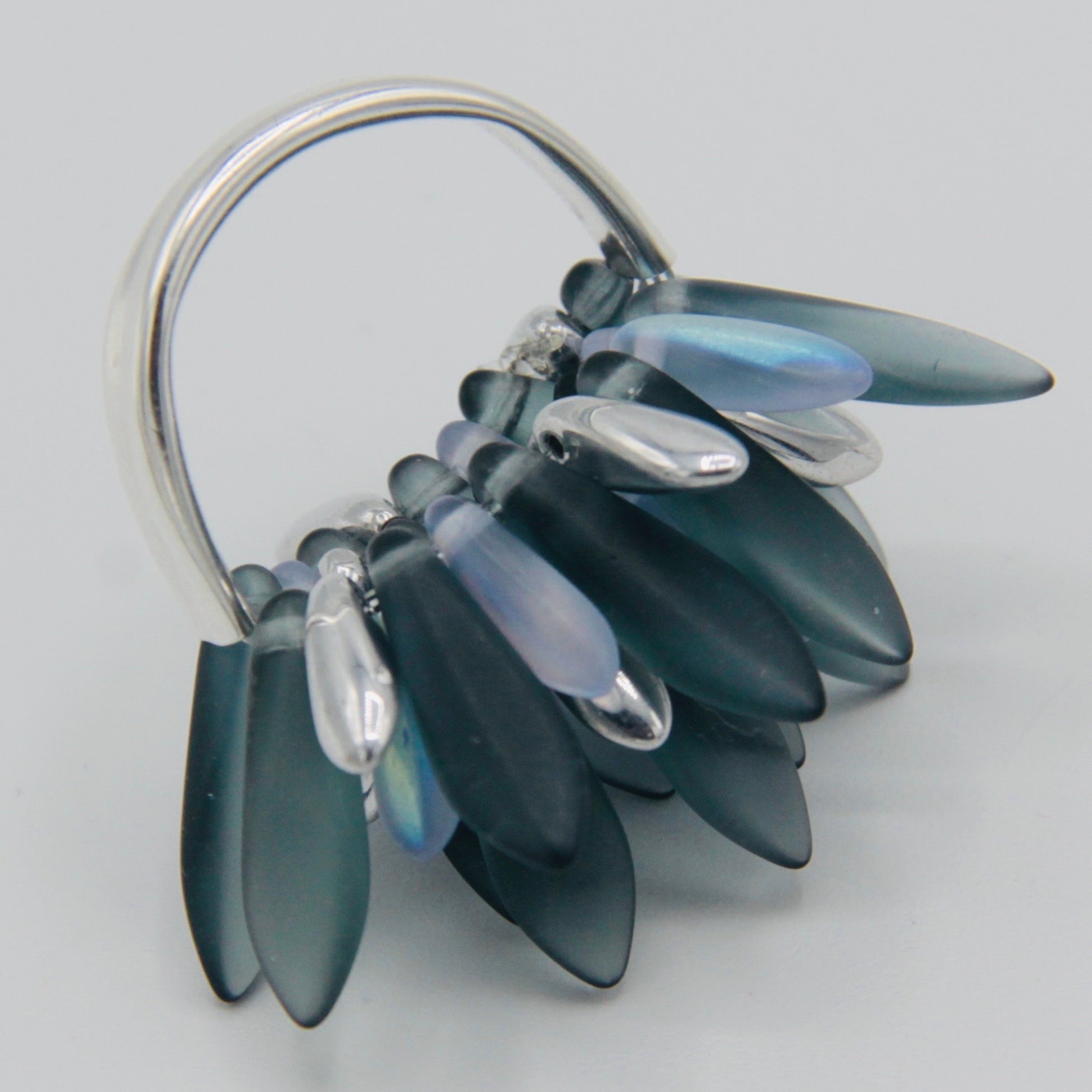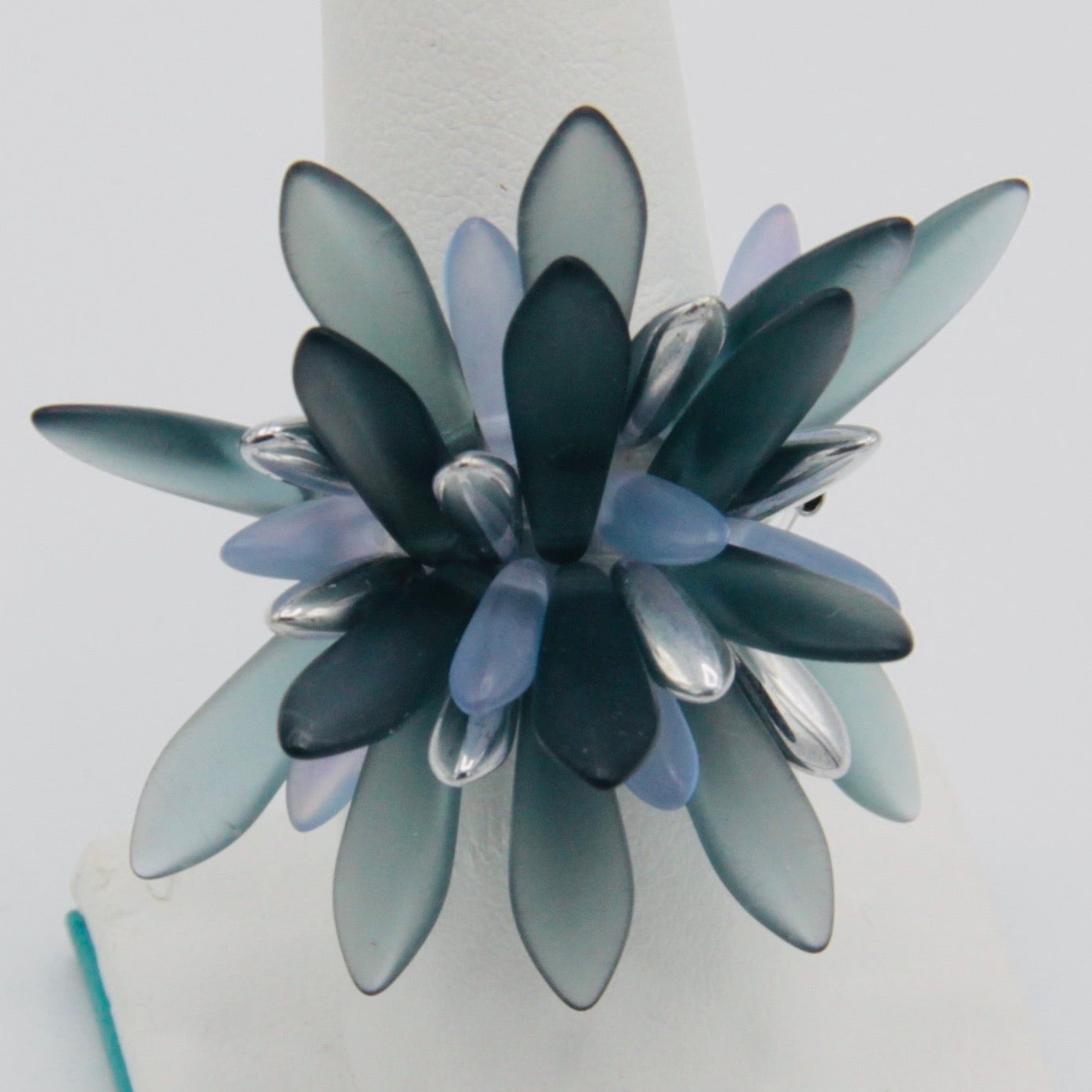 This Wendy ring has a nice matte finish in Montana Blue color that is accentuated with silver and frosted white small accent beads. Together with matching Laura or Natalie earrings and Elizabeth necklace, they make a lovely soft set. Czech glass dagger beads are meticulously selected and hugged together with American Sterling Silver components using an elastic cord made in the USA. All of that is nested in a lovable box made of 100% recycled cardboard here in the USA.
