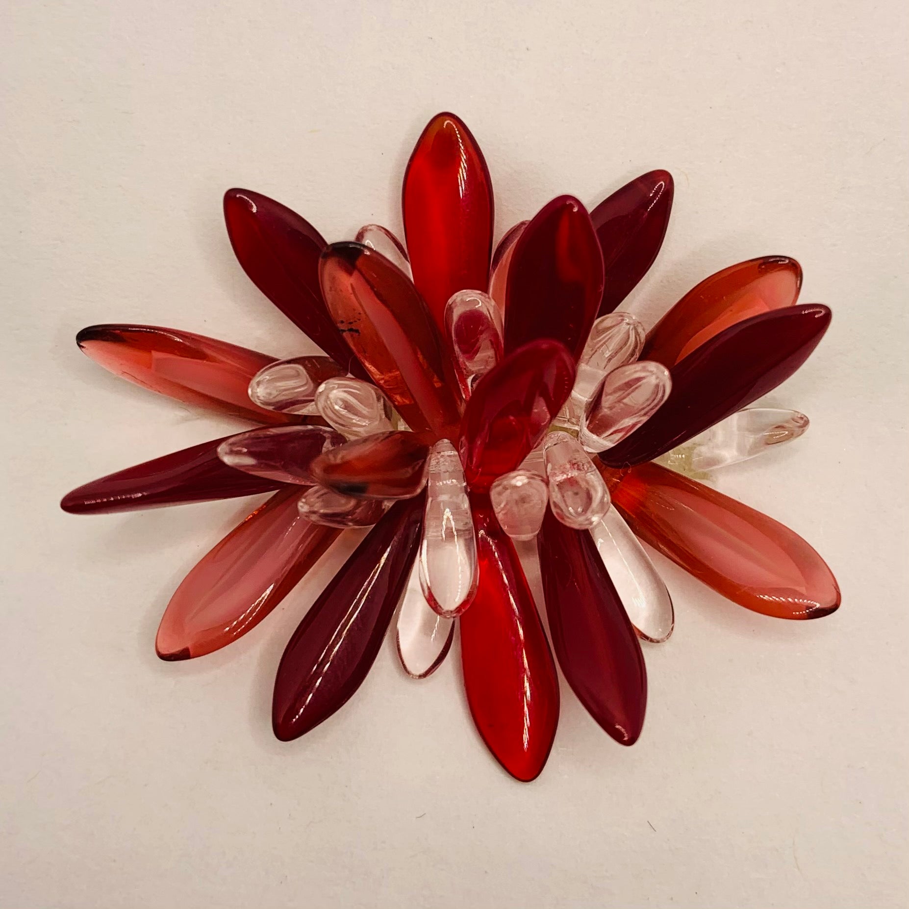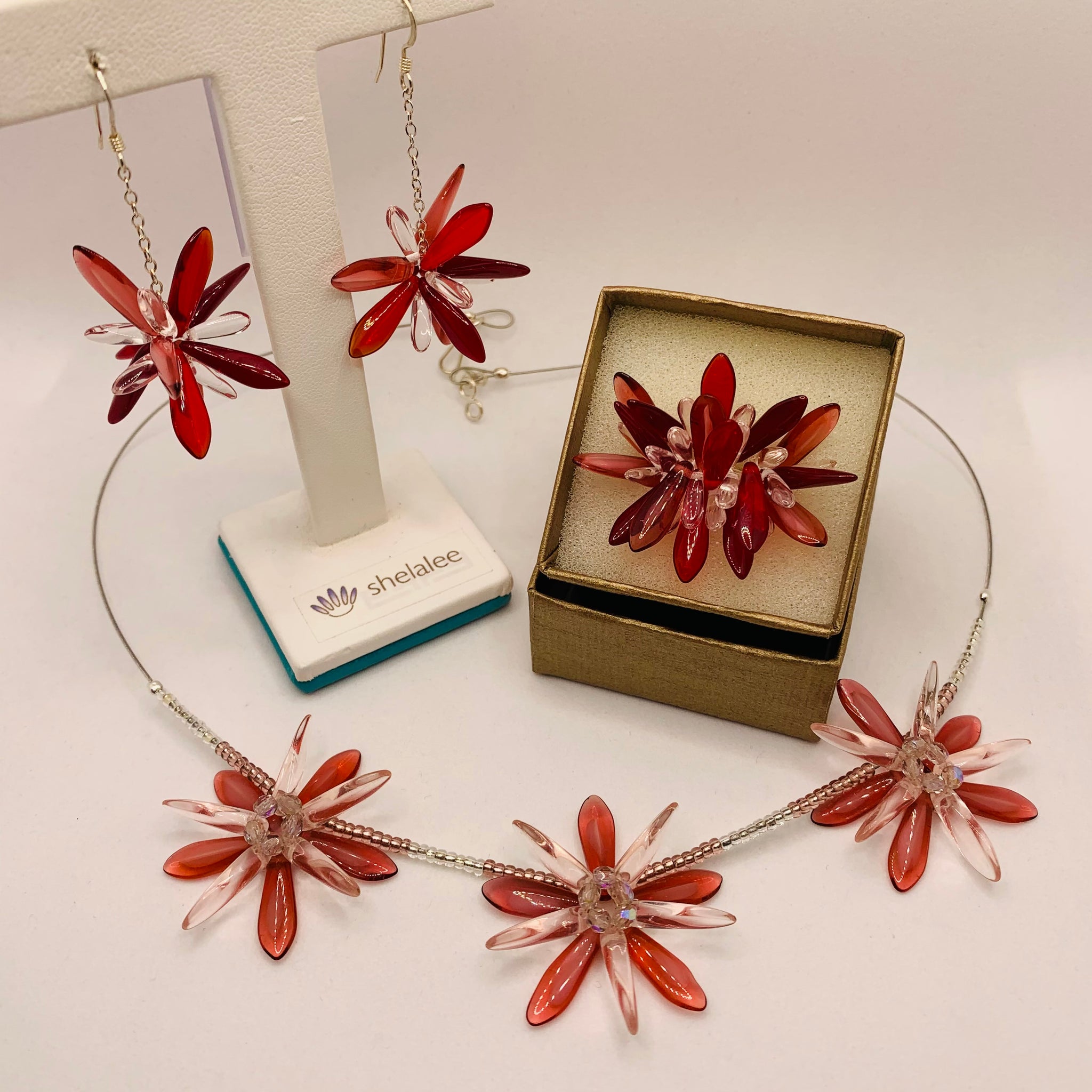 Sophisticated Wendy ring in red and garnet tones is meant to be noticed. Czech glass dagger beads are meticulously selected and hugged together with American Sterling Silver components using an elastic cord made in the USA. All of that is nested in a lovable box made of 100% recycled cardboard here in the USA.  The ring can be paired nicely with matching Laura earrings and Anna beaded necklace.