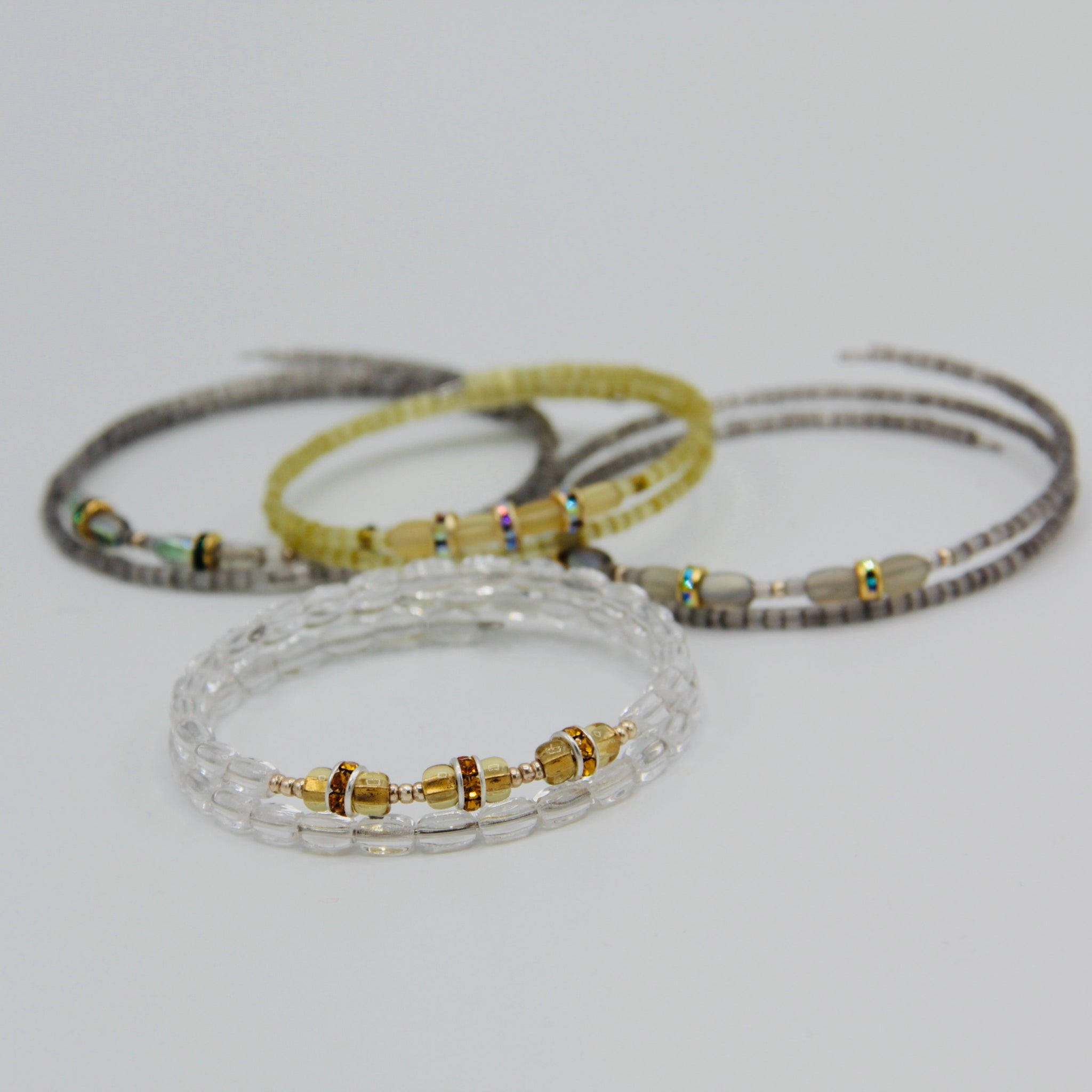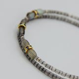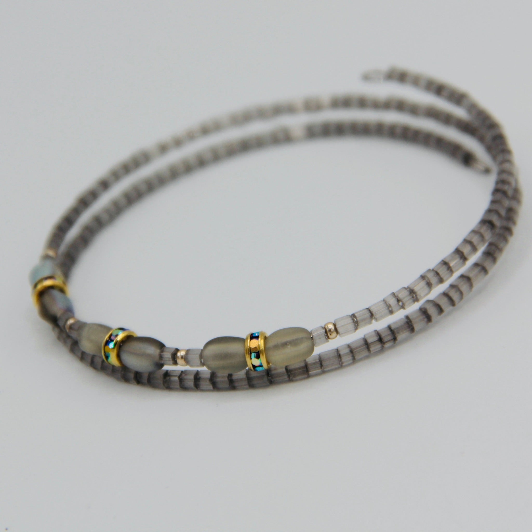 Dress up your arm with elegant gray with golden crystals. The Whitney bracelet is a mix of matte gray Czech glass beads with a focus on crystal rondelle beads in the center. This bracelet will add flare to any outfit. It is easy to wrap around your wrist, no closure needed. The Whitney bracelet is also popular gift item as one size fits most. Only one bracelet in this exact color combination available.
