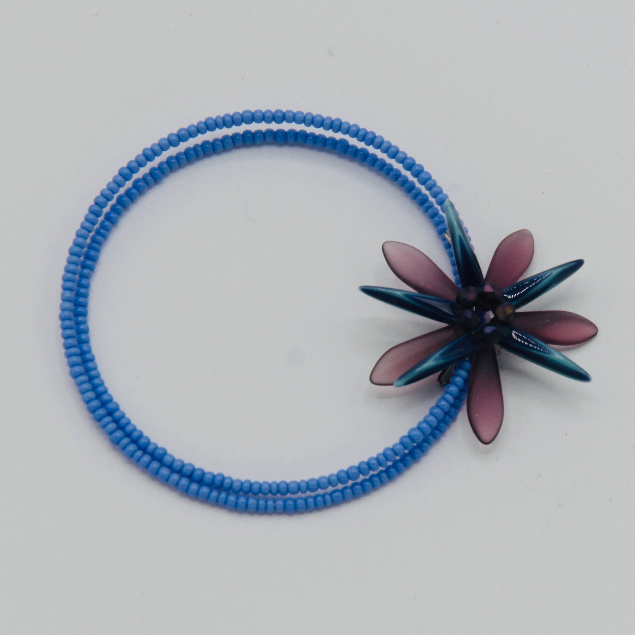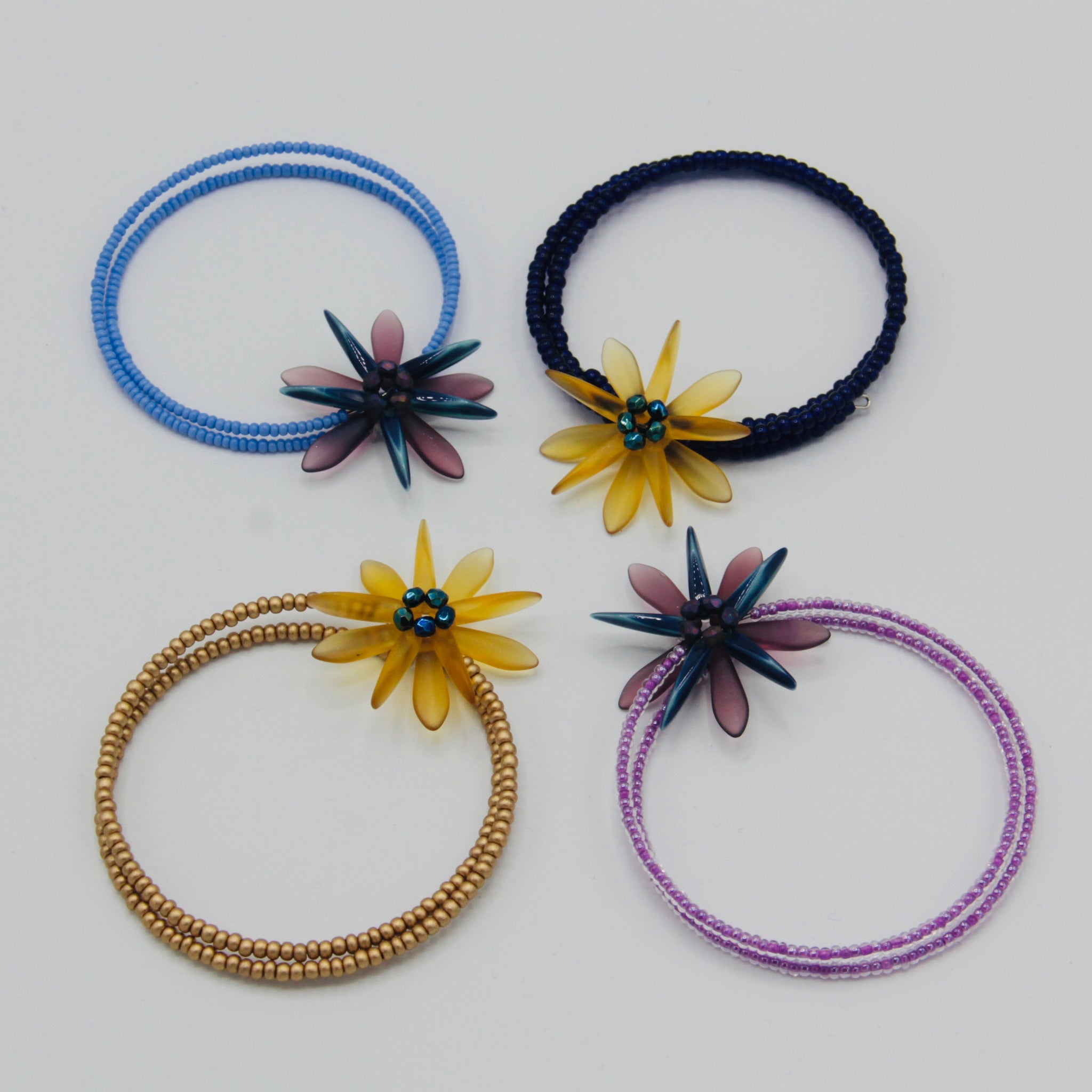 Wishing to have flowers any month of the year? Simply slide on our Zoe flower bracelet. The flower sits neatly on a beaded memory wire. The bracelet is made to hug your wrist with a joyful twist.